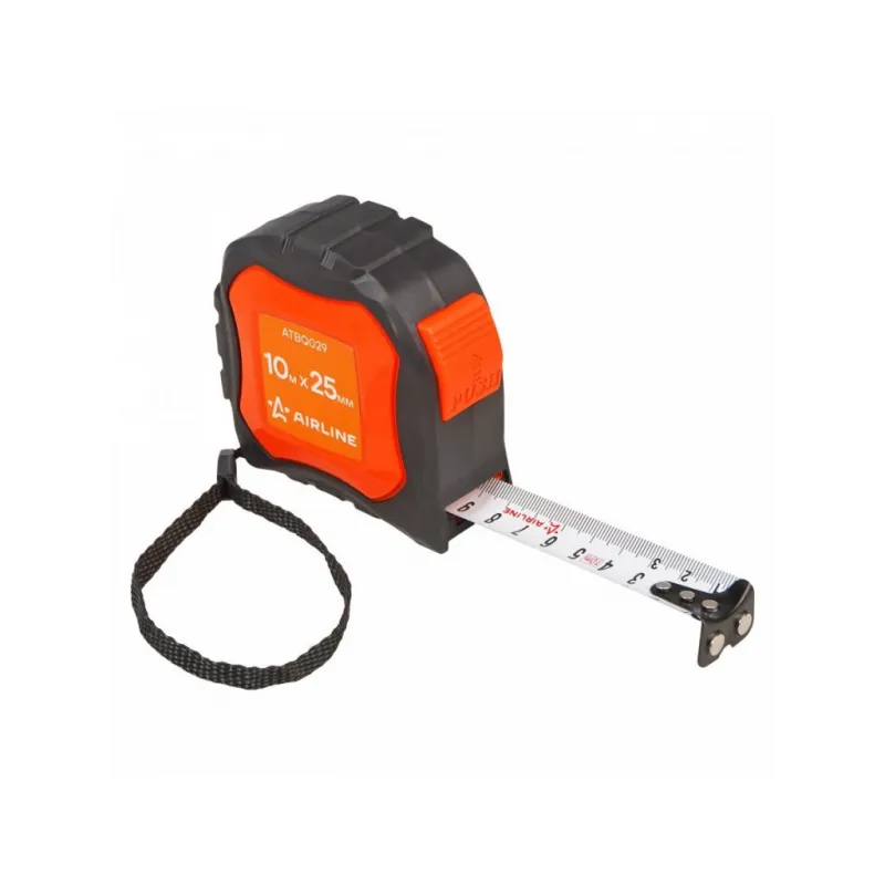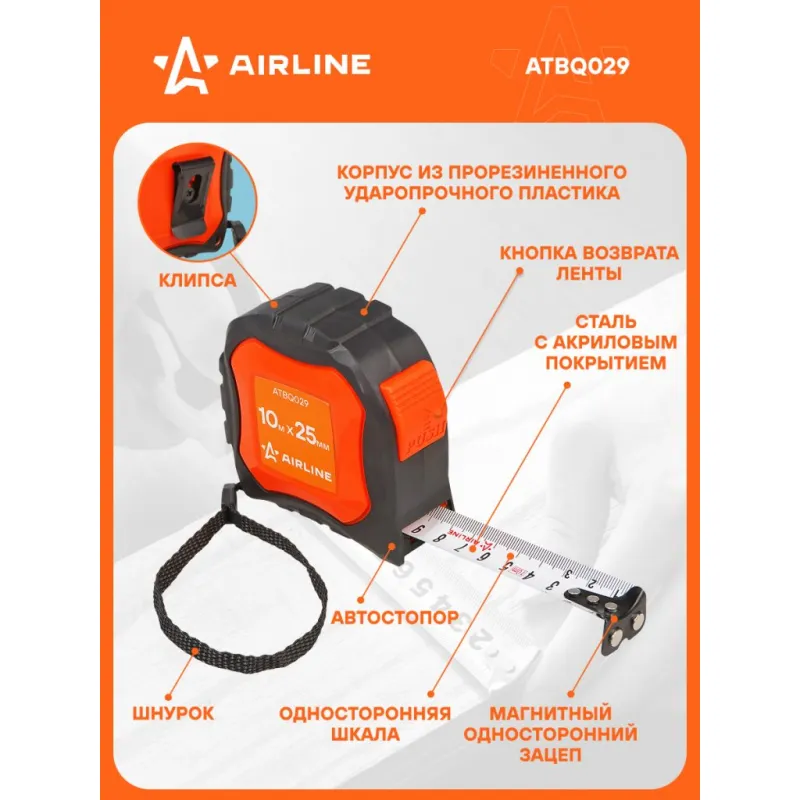 Рулетка в прорезиненном корпусе 10мх25мм, автостоп, магнитный зацеп Описание: Рулетка строительная измерительная 10 м х 25 мм с автостопом и магнитным зацепом / прорезиненный корпус AIRLINE ATBQ029 Рулетка AIRLINE ATBQ029 изготовлена из композитного прорезиненного ударопрочного пластика. Специальный механизм самостоятельно блокирует положение ленты, при ее извлечении из корпуса. На рулетке установлен магнитный зацеп, который облегчает измерение и проверку размеров на металлических поверхностях. Матовое антибликовое покрытие ленты обеспечивает комфортное считывание чисел со шкалы. Зацеп и клипса для ремня окрашены краской, что повышает их антикоррозийные свойства. Особенности: * Материал корпуса - Обрезиненный ABS-пластик; * С автостопом; * Со встроенным фиксатором; * Односторонний магнитный зацеп; * Односторонняя шкала; * Измерительная шкала - Сантиметры; * Цвет ленты - белый; * Материал ленты - Сталь (акриловое покрытие); * С лентой держателем; * Подвижный зацеп. Рулетка с подвижным зацепом для точного измерения внутренних и внешних размеров: 1. При измерении с упором в предмет внешняя сторона зацепа является нулевой меткой. 2. При измерении с зацеплением за предмет - зацеп сдвигается, компенсируя свою толщину. В этом случае нулевой отметкой является внутренняя сторона зацепа. Рулетка - это важный и нужный инструмент для каждого, всегда пригодится в быту, в работе, удобно хранить в бардачке автомобиля, в коробке инструментов, в багажнике автомобиля, поэтому станет нужным полезным подарком автомобилисту, мужу, папе, брату, дяде, жене, маме, сестре, тете, коллеге. Этот аксессуар для машины - это универсальный подарок на любой праздник. Характеристики: Артикул: ATBQ029 Длина ленты, м: 10 Ширина ленты, мм: 25 Материал корпуса: Обрезиненный пластик Автостоп: Есть Материал ленты: Сталь (акриловое покрытие) Зацеп: Магнитный односторонний Шкала: Односторонняя Измерительная шкала: Сантиметры Цвет ленты: Белый Комплектация: Рулетка на картонном подвесе - 1 шт Гарантия: от 1 года.