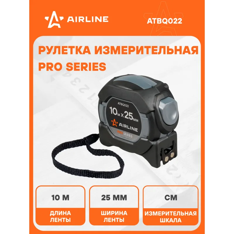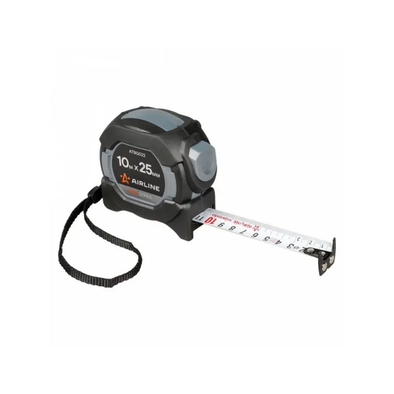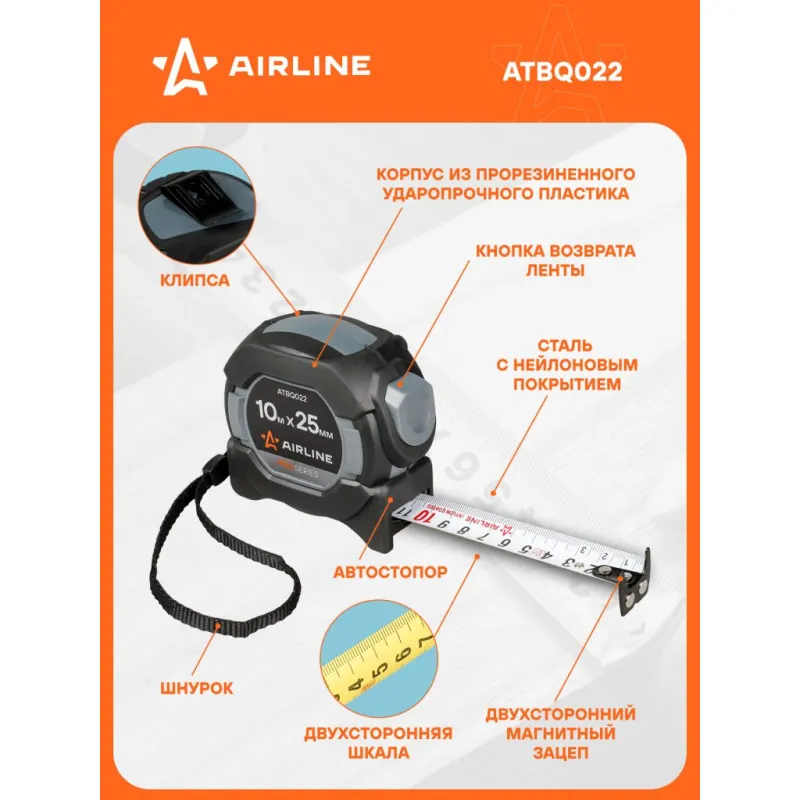 Рулетка в прорезиненном корпусе 10мх25мм PRO, автостоп, дв.магнит.зацеп,нейлон.двуст.шкала Описание: Рулетка AIRLINE ATBQ022 изготовлена из композитного прорезиненного ударопрочного пластика. Специальный механизм самостоятельно блокирует положение ленты, при ее извлечении из корпуса. Изделие оснащено двухсторонним зацепом и двухсторонней шкалой, что обеспечивает универсальность и удобство при проведении измерений. Нейлоновое покрытие ленты обеспечивает комфортное считывание чисел со шкалы. Функция защиты пальца предотвращает возможность получения травмы при возвращении ленты в корпус. Особенности: * Материал корпуса - Обрезиненный ABS-пластик; * С автостопом; * Со встроенным фиксатором; * Двухсторонний магнитный зацеп; * Двухсторонняя шкала; * Измерительная шкала - Сантиметры; * Цвет ленты - белый/желтый; * Материал ленты - Сталь (нейлоновое покрытие); * Подвижный зацеп. Рулетка с подвижным зацепом для точного измерения внутренних и внешних размеров: 1. При измерении с упором в предмет внешняя сторона зацепа является нулевой меткой. 2. При измерении с зацеплением за предмет - зацеп сдвигается, компенсируя свою толщину. В этом случае нулевой отметкой является внутренняя сторона зацепа. Рулетка - это важный и нужный инструмент для каждого, всегда пригодится в быту, в работе, удобно хранить в бардачке автомобиля, в коробке инструментов, в багажнике автомобиля, поэтому станет нужным полезным подарком автомобилисту, мужу, папе, брату, дяде, жене, маме, сестре, тете, коллеге. Этот аксессуар для машины - это универсальный подарок на любой праздник. Характеристики: Артикул: ATBQ022 Длина ленты, м: 10 Ширина ленты, мм: 25 Материал корпуса: Обрезиненный ABS-пластик Автостоп: Есть Материал ленты: Сталь (нейлоновое покрытие) Зацеп: Магнитный двухсторонний Шкала: Двухсторонняя Измерительная шкала: Сантиметры Цвет ленты: Белый/желтый Комплектация: Рулетка на пластиковом подвесе - 1 шт Гарантия: от 1 года.