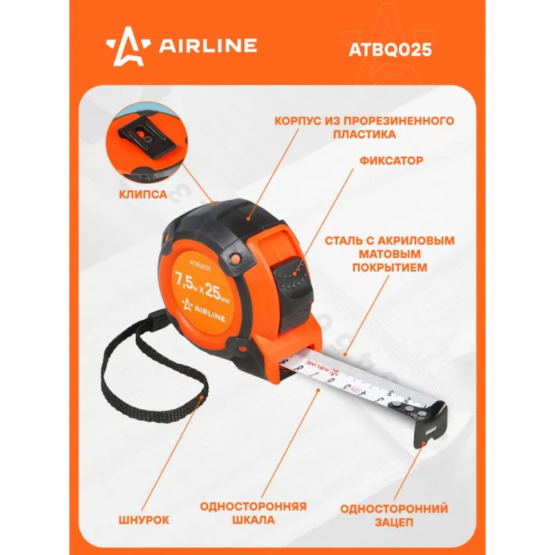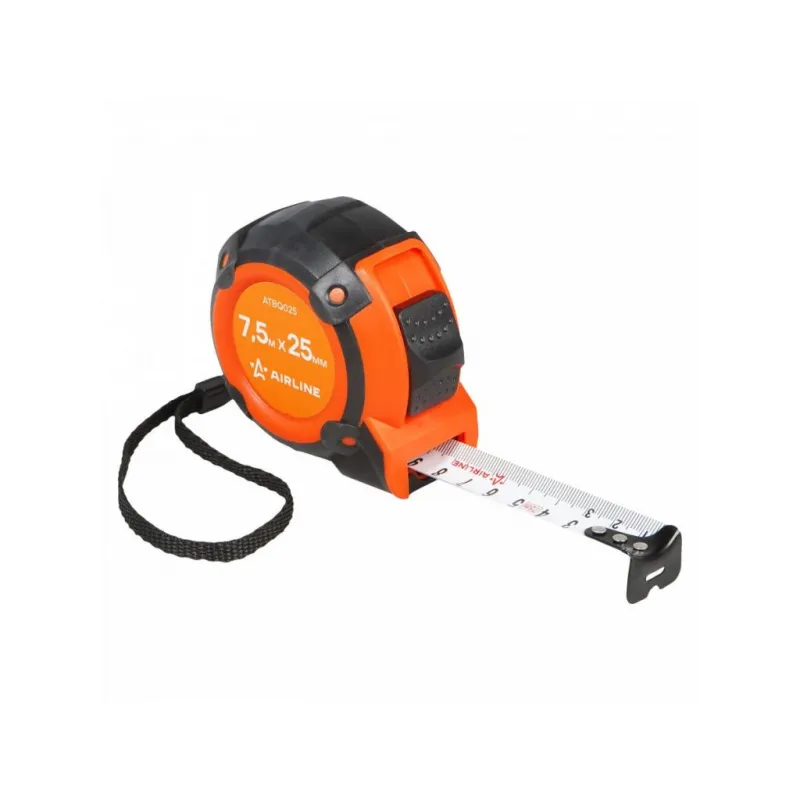 Рулетка в прорезиненном корпусе 7.5мх25мм Описание: Рулетка AIRLINE ATBQ025 изготовлена из ударопрочного пластика. Специальный механизм самостоятельно блокирует положение ленты, при ее извлечении из корпуса. Изделие оснащено односторонним зацепом и односторонней шкалой и измерительной шкалой Сантиметры, что обеспечивает универсальность и удобство при проведении измерений. Матовое антибликовое покрытие ленты обеспечивает комфортное считывание чисел со шкалы. Рулетка имеет эргономичный дизайн и удобный рычаг фиксации ленты. Особенности: * Материал корпуса - Обрезиненный ABS-пластик; * Со встроенным фиксатором; * Односторонняя зацеп; * Односторонняя шкала; * Измерительная шкала - Сантиметры; * Цвет ленты - белый; * Материал ленты - Сталь (акриловое покрытие); * С лентой держателем; * Подвижный зацеп. Рулетка с подвижным зацепом для точного измерения внутренних и внешних размеров: 1. При измерении с упором в предмет внешняя сторона зацепа является нулевой меткой. 2. При измерении с зацеплением за предмет - зацеп сдвигается, компенсируя свою толщину. В этом случае нулевой отметкой является внутренняя сторона зацепа. Рулетка - это важный и нужный инструмент для каждого, всегда пригодится в быту, в работе, удобно хранить в бардачке автомобиля, в коробке инструментов, в багажнике автомобиля, поэтому станет нужным полезным подарком автомобилисту, мужу, папе, брату, дяде, жене, маме, сестре, тете, коллеге. Этот аксессуар для машины - это универсальный подарок на любой праздник. Характеристики: Артикул: ATBQ025 Длина ленты, м: 7,5 Ширина ленты, мм: 25 Материал корпуса: Обрезиненный пластик Автостоп: Нет Материал ленты: Сталь (акриловое покрытие) Зацеп: Односторонний Шкала: Односторонняя Измерительная шкала: Сантиметры Цвет ленты: Белый Комплектация: Рулетка на картонном подвесе - 1 шт Гарантия: от 1 года.