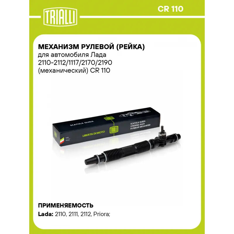 Механизм рулевой (рейка) для автомобиля Лада 2110-2112/1117/2170/2190 (механический) Описание: Рулевой механизм реечного типа CR 110 бренда TRIALLI предназначен для передачи момента поворота с рулевого колеса на передние колеса автомобиля. Предназначен для автомобилей LADA ВАЗ 2110-2112, KALINA, PRIORA, GRANTA. Подбор по VIN-номеру вашего автомобиля - через кнопку 'Задать вопрос'. Специалист проверит применяемость и ответит вам. Особенности рулевых реек Trialli:• Тип рулевого механизма - механический. • Соответствие стандартам. Продукция сертифицирована по ГОСТ и международным стандартам ISO и EAC. Это подтверждает высокое качество, безопасность и надежность каждой детали. • Надежность в любых климатических условиях. Используются адаптированные смазочные материалы, которые сохраняют рабочие свойства при температуре от ?45 до +80°C. • Современное производство. Рулевые рейки изготавливаются на высокоточном автоматизированном оборудовании. Это снижает вероятность брака и обеспечивает стабильное качество. • Многоступенчатый контроль качества. Каждое изделие проходит до 5 этапов контроля: проверка сырья, промежуточный контроль, стендовые испытания и финальная проверка. • Лабораторные испытания: проверяются герметичность, износостойкость, устойчивость к нагрузкам и внешним воздействиям. Отличный выбор для надежной замены штатного реечного механизма. Характеристики: Артикул: CR 110 OEM номера: 2110-3400010, 2110-3400012, 21120-3400012-00, 21100-3401012-00, 11183-3400010-20, 11183-3400010-01 Материал: Комбинированный Длина, мм: 678 Сторона установки: Слева Товарная линейка: BLACK Тип рулевого механизма: механический Количество на автомобиль: 1 Количество оборотов рулевого механизма: 3,97 Гарантийный срок: 2 года/60 000 км Сопутствующие товары:: CR S 710 Особенности конструкции:: без рулевых тяг и рулевых наконечников Подходит для авто: ВАЗ 2110, 2110, 2111, 2112, Priora (07-), Kalina II (13-), Kalina (04-), Granta (10-) Для проверки применяемости отправьте VIN автомобиля через вкладку "Есть вопросы о товаре?" Комплектация: Рулевой механизм (рейка) - 1 шт Гарантия: от 1 года.