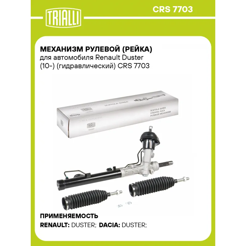 Механизм рулевой (рейка) для автомобиля Renault Duster (10-) (гидравлический) Описание: Рулевой механизм реечного типа CRS 7703 бренда TRIALLI предназначен для передачи момента поворота с рулевого колеса на передние колеса автомобиля. Предназначен для автомобилей DACIA DUSTER, RENAULT DUSTER. Подбор по VIN-номеру вашего автомобиля - через кнопку 'Задать вопрос'. Специалист проверит применяемость и ответит вам. Особенности рулевых реек Trialli:• Тип рулевого механизма - гидравлический. • Соответствие стандартам. Продукция сертифицирована по ГОСТ и международным стандартам ISO и EAC. Это подтверждает высокое качество, безопасность и надежность каждой детали. • Надежность в любых климатических условиях. Используются адаптированные смазочные материалы, которые сохраняют рабочие свойства при температуре от ?45 до +80°C. • Современное производство. Рулевые рейки изготавливаются на высокоточном автоматизированном оборудовании. Это снижает вероятность брака и обеспечивает стабильное качество. • Многоступенчатый контроль качества. Каждое изделие проходит до 5 этапов контроля: проверка сырья, промежуточный контроль, стендовые испытания и финальная проверка. • Лабораторные испытания: проверяются герметичность, износостойкость, устойчивость к нагрузкам и внешним воздействиям. Отличный выбор для надежной замены штатного реечного механизма. Характеристики: Артикул: CRS 7703 OEM номера: 490012993R, 490010125R, 490014807R Материал: Комбинированный Длина, мм: 1069 Сторона установки: Слева Товарная линейка: BLACK Тип рулевого механизма: гидравлический Количество на автомобиль: 1 Количество оборотов рулевого механизма: 3,2 Гарантийный срок: 2 года/60 000 км Особенности конструкции:: с рулевыми тягами, без рулевых наконечников Комплектация: Рулевой механизм (рейка) - 1 шт Гарантия: от 1 года.