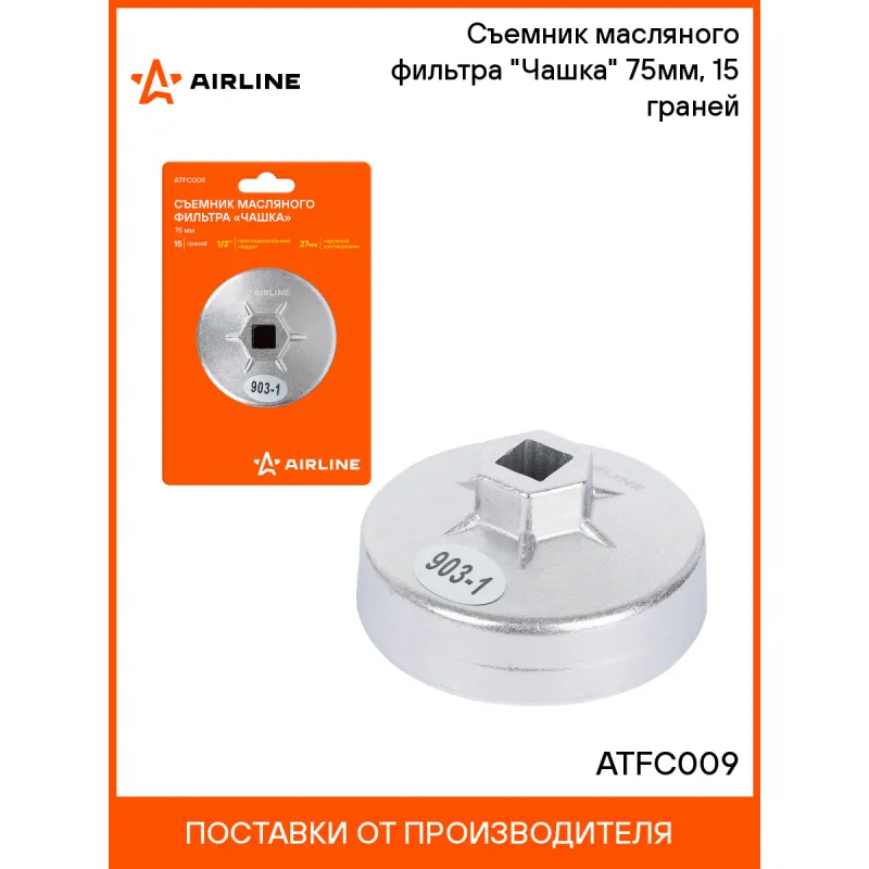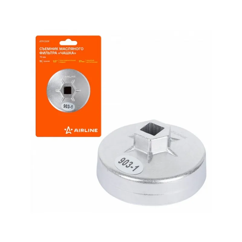 Съемник масляного фильтра "Чашка" 75мм, 15 граней Описание: Съемник масляного фильтра типа "Чашка" ATFC009 от бренда AIRLINE предназначен для удобного и лёгкого монтажа и демонтажа масляного фильтра двигателя и кпп. Возможно применение с динамометрическим ключом для соблюдения технических требований автопроизводителя. Привод: внутренний квадрат 1/2 дюйма DR; наружный шестигранник 27 мм. Материал изготовления - алюминий. Размер съемника 75 мм. Универсальный инструмент для авто в ремонте и техническом обслуживании на СТО, в собственном гараже. Съемник является незаменимым инструментом во время замены масла в двигателе автомобиля (в ДВС), демонтажа масляного фильтра автомобиля и подойдет как для профессионального, так и бытового обслуживания автомобиля. Универсальный съемник масляного фильтра для машины, автомобиля применяется при ремонте и обслуживания авто. Отлично подойдет в качестве практичного подарка в автомобильный набор мужчинам на 23 февраля, автомобилисту, папе, отцу, мужу, парню и другу на Новый год, день рождения и без повода, незаменимая вещь для дома, автосервиса, для профессионального использования. Характеристики: Артикул: ATFC009 Размер, мм: 75 Присоединительный квадрат: 1/2 Комплектация: СЪЕМНИК МАСЛЯНОГО ФИЛЬТРА - 1 шт Гарантия: от 1 года.