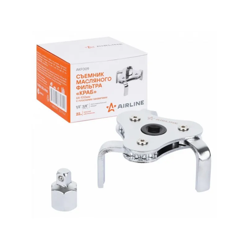 Съемник масляного фильтра "Краб" 64-100мм с плоскими захватами Описание: Съемник масляного фильтра "Краб" AKF009 от бренда AIRLINE предназначен для удобного и лёгкого монтажа и демонтажа масляного фильтра двигателя. Конструкция съемника в форме краба позволяет прочно зафиксировать деталь и произвести ее демонтаж в максимально сжатые сроки. Размер съемника 64-100мм мм. Такого диапазона регулируемого размера достаточно для смены масляного фильтра на большей части производимых автомобилей. Универсальный инструмент для авто в ремонте и техническом обслуживании на СТО, в собственном гараже. Съемник является незаменимым инструментом во время замены масла в двигателе автомобиля (в ДВС), демонтажа масляного фильтра автомобиля и подойдет как для профессионального, так и бытового обслуживания автомобиля. Универсальный съемник масляного фильтра для машины, автомобиля применяется при ремонте и обслуживания авто. Отлично подойдет в качестве практичного подарка в автомобильный набор мужчинам на 23 февраля, автомобилисту, папе, отцу, мужу, парню и другу на Новый год, день рождения и без повода, незаменимая вещь для дома, автосервиса, для профессионального использования. Характеристики: Артикул: AKF009 Размер, мм: 64-100мм Присоединительный квадрат: 1/2"ВН, 3/8"ВН Присоединительный шестигранник: 22мм Комплектация: СЪЕМНИК МАСЛЯНОГО ФИЛЬТРА - 1 шт Гарантия: от 1 года.