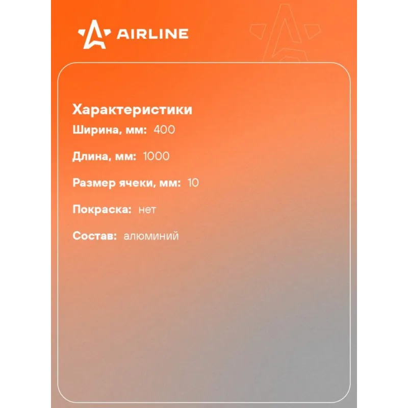 Сетка для защиты радиатора, алюм., яч. 10*4 мм (R10), 100*40 см, без покраски (1 шт.) Описание: Сетка предназначена для самостоятельного монтажа на радиаторную решетку или бампер автомобиля с целью защиты радиаторов систем охлаждения и кондиционирования от попадания грязи, камней и крупных насекомых, а также индивидуального тюнинга автомобиля. Характеристики: Артикул: APM-A-03 Ширина, мм: 400 Длина, мм: 1000 Размер ячеки, мм: 10 Покраска: нет Комплектация: Сетка - 1 шт Навершие с подвесом - 1 шт Гарантия: от 1 года.