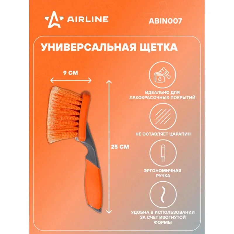 Щетка для мытья с мягкой распушенной щетиной, прорезиненные ручка и кант (25 см) Описание: Щетка AIRLINE ABIN007 подойдет для мытья и уборки автомобиля. Щетка подойдет для частой и тщательной уборки автомобиля, т.к. является усовершенствованной моделью изделия для ухода за транспортным средством с прорезиненной щеткой. Она обладает мягкой распушенной щетиной увеличенной длиной, а также усиленным корпусом. Рукоятка дополнена эргономичным покрытием, которое повысит уровень комфорта при эксплуатации изделия. Идеально подходит для мытья лобового стекла за счет подвижности насадки. Отлично справляется с запотеванием стекла. Щеткой легко доставать до любых труднодоступных участков. Благодаря этому, вы сможете без усилий очистить лобовое стекло, крышу, капот, борта грузового автотранспорта. Автощетка оснащена микрофиброй, которая обеспечивает очистку без появления царапин на лакокрасочных поверхностях. Длинный и мягкий ворс на насадке хорошо впитывает воду и отлично собирает пыль с кузова на сухую. Автощетку удобно хранить в багажнике, в кладовке, в машине и легко найдет применение в быту. Автомобильная телескопическая щетка - это самый важный аксессуар который должен быть у каждого автолюбителя. Щетка AIRLINE для автомобиля повысит уровень комфорта во время путешествий и ежедневных поездок, поэтому станет нужным полезным подарком автомобилисту, мужу, папе, бату, дяде, жене, маме, сестре, тете, коллеге. Этот аксессуар для машины - это универсальный подарок на любой праздник, новый год, 23 февраля, 8 марта. В линейке AIRLINE, вы найдете широкий ассортимент высококачественных автотоваров и средств по уходу за вашим автомобилем щетки для окон, водосгоны, скребки, швабры. Мы гарантируем качество и надежность наших товаров. Характеристики: Артикул: ABIN007 Длина в разложенном виде, см: 25 Ширина щетки, см: 9 Щетина: мягкая распушенная Диаметр щетины, мм: 0,3 Комплектация: Щетка с цветным воблером - 1 шт Гарантия: от 1 года.