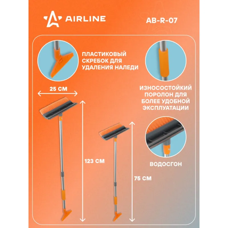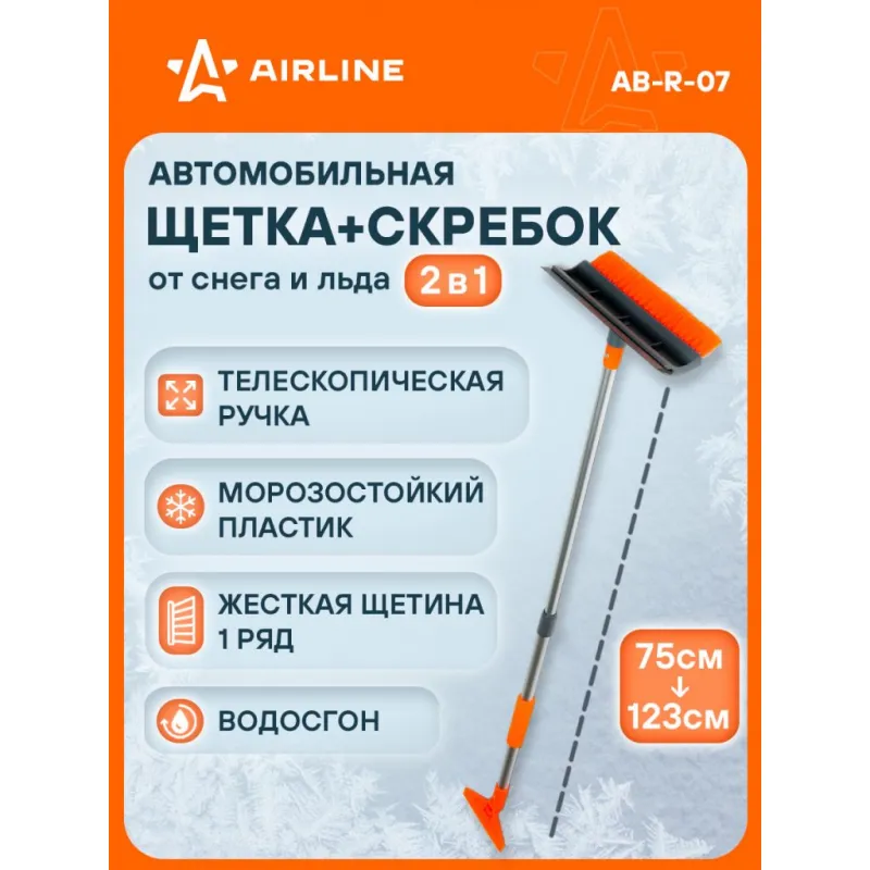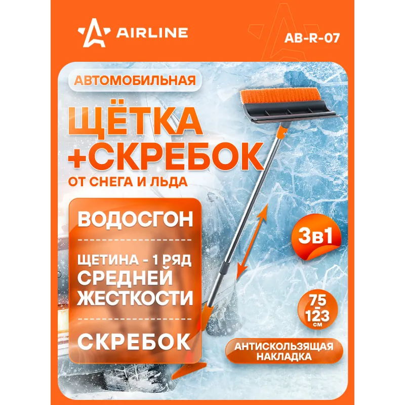 Щетка от снега и льда с водосгоном и телескоп.рукояткой + скребок (75-123 см) Описание: Длинная щетка для уборки снега и льда оснащена телескопической ручкой. Жесткая щетина щетки данной модели поможет в уборке снега и льда с поверхности машины без всяких препятствий. Рекомендуется для использования в коммерческом транспорте. Для более тщательной уборки щетка оснащена водосгоном, который поможет очистить поверхность от лишней влаги. Особенности: - Длина в сложенном/разложенном виде - 123*75 см; - Удобное хранение; - Не царапает поверхность автомобиля; - Быстрое и эффективное очищение автомобиля от снега, льда, наледи; - Количество рядов щетины у щетки - 1; Щетка выполнена из высококачественных материалов, имеет рукоятку из алюминия, а также специальные эргономичные вставки из морозоустойчивого поролона, которые делают эксплуатацию изделия удобной даже при низком температурном режиме, предотвращает соскальзывание и замерзание рук. В состав рукоятки входит прочный пластик, который не подвержен перепадам температур. Для особо сложных загрязнений и льда предусмотрен скребок на другом конце щетки. Щетка для машины со складной/раздвижной ручкой AIRLINE - незаменимый аксессуар в зимний сезон максимально удобна в использовании независимо от габаритов автомобиля. В зимней линейке AIRLINE вы найдете щетки для машины от снега со скребком, скребки для окон, с телескопической эргономичной рукоятью, мягкой/жесткой щетиной, и другие автоаксессуары. Автомобильную щетку для снега можно преподнести в подарок мужчине, женщине, любимому парню, мужу, брату, коллеге, жене, другу, папе и дедушке на любой праздник, день рождения, Новый год и просто так. Характеристики: Артикул: AB-R-07 Количество рядов щетины: 1 Диаметр щетинок, мм: 0,4 Длина в разложенном виде, см: 123 Длина в сложенном виде, см: 75 Рукоятка: поролоновая вставка Ширина водосгона, см: 25 Комплектация: Щетка от снега и льда с водосгоном и телескопической ручкой (75-123 см) с лейблом - 1 шт Гарантия: от 1 года.