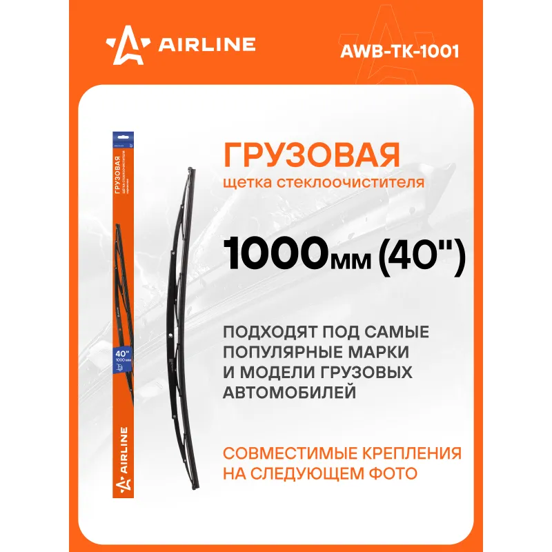 Щетка стеклоочистителя 1000 мм (40") каркасная грузовая с адаптером "Крючок 6x16 мм" Описание: Каркасная конструкция щетки стеклоочистителя — это качество, проверенное десятилетиями. Такие щетки являются самыми доступными по цене, обладает высокой прочностью, и лучшими показателями прилегания резинок к стеклу автомобиля. К классической форме щетки производители AIRLINE добавили изменения в составе резины, позволяющие продлить ее срок использования. В комплект добавлены адаптеры Hook 6x16 mm - Крючок 6x16 мм, которые необходимы для установки на автомобили различных марок (подходя для 95% марок и моделей автомобилей).Применяемость: ALFA ROMEO 156, AUDI A4, Q7, AUTO UNION DKW SONDERKLASSE Universal, BMW 5, 3, CHEVROLET ASTRO, LUV, CORVETTE, CITROEN JUMPER, JUMPY, DAIHATSU EXTOL, FIAT STRADA, PANDA, DUCATO, FIORINO, FREEMONT, PUNTO, CROMA, FORD MONDEO, S-MAX, C-MAX, FOCUS, F-SERIES, RANGER, TRANSIT, GAZ VOLGA, GREAT WALL HOVER, WINGLE, DEER, HAIMA (FAW) PREMACY, HOLDEN COMMODORE, ONE TONNER, HONDA CR-V, HUMMER H2, INFINITI FX, JEEP GRAND CHEROKEE, KIA (DYK) CARNIVAL, LADA NIVA, ВАЗ 2110-2112, LDV CUB, LEXUS GX, MAZDA TRIBUTE, PREMACY, MERCEDES-BENZ R-Class, VIANO, E-Class, B-Class, G-Class, VITO, MITSUBISHI PAJERO, GALANT, PAJERO PININ, L 200, NISSAN PRIMERA, OPEL ZAFIRA, VECTRA, ASTRA, CORSA, CAMPO, PEUGEOT 304, 505, PIAGGIO APE, PLYMOUTH VOYAGER, PORSCHE 911, 356, PREMIER RIO, RELIANT KITTEN, SCIMITAR, RENAULT MEGANE, 19, KANGOO, MASTER, SSANGYONG MUSSO, SUZUKI VITARA, TATA INDIGO, TRIUMPH 2500, 2000, VOLVO V70, 850, 740, 760, VW TOURAN, T4, T5, PASSAT, AMAROK, SHARAN.. Если у вас есть вопросы по применяемости, мы всегда готовы помочь вам с подбором по VIN-НОМЕРУ ВАШЕГО АВТОМОБИЛЯ. Преимущества щетки AIRLINE AWB-TK-1001 -Материал щетки - долговечная искусственная резина (произведенная по эксклюзивной anti-age технологии с использованием озона); -Адаптеры произведены из специального технического пластика, от -40 до +60; -Бесшумная работа каркасной щетки стеклоочистителя; -Равномерный прижим щетки к поверхности стекла; -Возможность использовать на автомобилях, как с левым, так и с правым расположением руля, а так же на автомобилях с распашной системой очистки стекла. Мы гарантируем качество и надежность наших товаров. Характеристики: Артикул: AWB-TK-1001 OEM номера: 81.26440.0059, 81.26440.6059, A 000 820 90 45, A 000 820 99 45, A 001 820 13 45, EVO 7 731 145 003, 000 820 90 45, 000 820 99 45, 001 820 13 45, 0008200945, 8200945, A0008200945, 1507.051.02, 804 497 23, 7.731.141.003 Кол-во адаптеров, шт: 1 Размер, мм: 1000 Размер, дюйм: 40 Тип: Грузовая каркасная Адаптер крепления 1: Hook 6x16 mm - Крючок 6x16 мм Комплектация: Щетка стеклоочистителя - 1 шт Адаптеры - 1 шт Картонная коробка - 1 шт Гарантия: от 1 года.