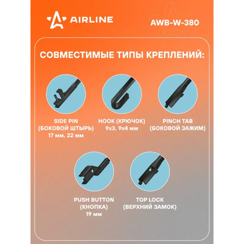 Щетка стеклоочистителя зимняя 380мм (15") 5 адаптеров Описание: Зимняя щетка AIRLINE AWB-W-380 стеклоочистителя хотя и может использоваться круглый год, идеальна для работы зимой, особенно в суровом климате! Это каркасная щетка в резиновом корпусе. Благодаря металлическому каркасному коромыслу щетка имеет максимальный уровень прилегания к лобовому стеклу автомобиля. А благодаря кожуху, не прилипает снег и наледь. После многочисленных проведенных испытаний для ЗИМНИХ щеток была выбрана искусственная резина, произведенная по эксклюзивной anti-age технологии с использованием озона. Как результат - увеличение расчетного ресурса работы до 50%, по сравнению с дешевыми аналогами. Вся используемая резина имеет графитовое покрытие, что обеспечивает низкое трение и бесшумную работу. Зимние дворники (щетки стеклоочистителя) оснащены 4-мя адаптерами. Благодаря адаптерам, данные щетки подходят к 85% всего автопарка мира. Если у вас есть вопросы по применяемости, мы всегда готовы помочь вам с подбором по VIN-НОМЕРУ ВАШЕГО АВТОМОБИЛЯ. Преимущества щетки: Материал щеток - долговечная искусственная резина (произведена по эксклюзивной anti-age технологии с использованием озона); Равномерный прижим каркасной щетки стеклоочистителя, комплект к стеклу; Характеристики: Артикул: AWB-W-380 OEM номера: 85220-22490-000, 85222-97203-000, 85222-97206-000, 85222-97209-000, 85242-28020-000, 85242-87701-000, 85291-87207-000, 85242-97501-000, 85290-87201-000, 85290-87202-000, 85290-87501-000, 85290-87502-000, 85291-87202-000, 2120566, AS7J-17402-AA, GM5J-A17402-CA, 76630-S3A-003, 76630-S5S-E01, 76630-S5S-G01, 76630-S6A-003, 76630-SAA-004, 76630-SAA-G01, 76730-S0A-921, 76730-S30-901, 76730-SV5-A01, 76730-TAA-003, 76730-TAA-N01, 76630-SZW-J01, 76630-T4G-003, 76630-T6A-J02, 76630-TDK-J03, 76630-TM0-G01, 76630-TZA-J01, 76630-SEA-003, 76630-SEA-G01, 76630-SEA-G11, 76630-SEA-J11, 76630-SJ6-003, 76630-SYA-003, 5-86011-160-0, 8-94358-867-0, 8-94423-654-0, 8-97252-182-0, 8-97252-182-2, 1A03-67-330, 1A53-67-330, 8418-67-330, 8421-67-330, A084-67-330, D462-67-330, ZZS3-67-330, ZZS6-67-330, D462-67-330A, D464-67-330, D464-67-330A, G14S-67-330, G14T-67-330, ZZS0-67-330, A4638200345, 8250A769, MB 141142, MB542553, MB542554, MB 623074, MB623364, MR416323, MR 441471, MB 639953, MB 859530, MB 859545, MR 164792, MR 339500, MR 361511, 28790-70N00, 28790-70N05, 28790-HC000, 28890-6A00F, 28890-6A0A0, 28890-ES51A, AY001-U380R, 78654-2210, 78654-2211, 78654-2390, 78654-2400, 86542-AA010, 86542-AA050, 86542GA130, 86542GA710, 86542-KA121, 86542-KC010, 86542-SA100, 86542-AC150, 86542-AE070, 86542-FC060, 86542-FC100, 86542-FC110, 86542-FE050, 38340-76F10, 38340-77510, 85220-22371, 85220-22510, 85220-22600, 85222-B1100, 85242-10020, 85242-12080, 85242-44010, 85242-60030, 85242-97501, 85290-87202, 85242-13010, 85242-13030, 85242-20010, 85242-20060, 85242-20070, 85242-28020, 3B9 955 427, 8D9 955 425, 8D9955427, ROVER, A00063170, MOTORS Размер, мм: 380 Размер, дюйм: 15 Тип: Зимняя Кол-во адаптеров, шт: 5 Адаптер крепления 1: Hook 9x3, 9x4 mm - Крючок 9x3, 9x4 мм (U) Адаптер крепления 2: Push Button 16 mm - Узкая кнопка 16 мм (MA5) Адаптер крепления 3: Push Button 19 mm - Кнопка 19 мм (W6) Адаптер крепления 4: Side pin 17, 22 mm - Боковой штырь 17, 22 мм (W1) Адаптер крепления 5: Pinch Tab - Боковой зажим, Top Lock - Верхник замок (A5) Комплектация: Щетка стеклоочистителя - 1 шт Адаптеры - 5 шт Картонная коробка - 1 шт Гарантия: от 1 года.