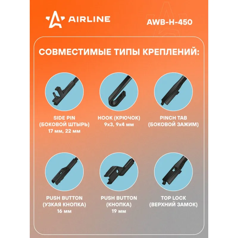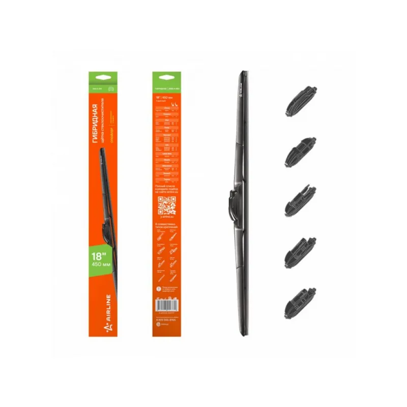 Щетка стеклоочистителя 450 мм (18") гибридная 5 адаптеров Описание: Гибридные щетки - это смесь каркасной щетки, со всеми ее преимуществами надежного прилегания к стеклу автомобиля и наличием пластикового кожуха. Кожух выполняет защитную функцию и не позволяет налипать мокрому снегу и льду. Второе его преимущество - он выполняет функцию спойлера, благодаря аэродинамической конструкции. Щетка гораздо лучше прилегает к стеклу автомобиля, особенно это заметно на больших скоростях. Для щеток были специально разработаны 3 различных мульти-адаптера, которые подходят на 8 типов поводков Hook 9x3, 9x4 mm - Крючок 9x3, 9x4 мм,Push Button 16 mm - Узкая кнопка 16 мм (H6-2), Push Button 19 mm - Кнопка 19 мм (H6-1), и с помощью которых становится возможным использовать щетки в подавляющем большинстве существующих креплений, и соответственно сделать подходящими на 95% автомобилей. Наличие в резине частиц озона, а также нанесение графитового покрытия на верхний эксплуатационный слой резины. Озон создает anti-age технологию, которая значительно увеличивает период использования щетки и обеспечивает сохранение ее рабочих свойств. При работе щетки не создают шумовых помех, а также гладко скользят по стеклу, обеспечивая тщательное и безопасное очищение. Если у вас есть вопросы по применяемости, мы всегда готовы помочь вам с подбором по VIN-НОМЕРУ ВАШЕГО АВТОМОБИЛЯ. Преимущества щетки AIRLINE AWB-H-450 -Материал щетки - долговечная искусственная резина (произведенная по эксклюзивной anti-age технологии с использованием озона); -Бесшумная работа каркасной щетки стеклоочистителя; -Равномерный прижим щетки к поверхности стекла; Характеристики: Артикул: AWB-H-450 OEM номера: 61 61 9 069 195, 61 62 7 009 884, 6426.JH, 85212-28070-000, 85212-87201-000, 85212-87203-000, 85212-87209-000, 85212-87701-000, 85212-97203-000, 85291-87704-000, 85291-B2040-000, 85220-87108-000, 85220-87218-000, 85220-87726-000, 85222-28030-000, 85222-87701-000, 85222-97201-000, 85212-97205-000, 85212-97208-000, 85212-97209, 85212-97209-000, 85220-16410-000, 85220-16420-000, 84AU17528B, A780X17528AJA, XM3417528FA, XM3417528HA, 1332348, 76630-S2X-003, 76630-S30-E01, 76630-S30-G01, 76630-S3Y-003, 76630-S3Y-G01, 76630-S70-003, 76630-ST3-E05, 76630-TEA-T02, 76630-TV0-G01, 76730-SEA-003, 76730-ST3-E11, 76630-S84-G01, 76630-SCC-003, 76630-SCC-013, 76630-SDC-T01, 76630-SF4-003, 76630-SH3-G11, 8-94269-070-0, 8-94353-789-0, 8-94353-855-0, 8-94353-856-0, 8450008572, 8FG2-67-330A, B095-67-330, BE5J-67-330, BHS3-67-330, BJ0F-67-330, FE15-67-330A, LC62-67-330, M002-67-330, UJ06-67-330, UJ07-67-330, UJ35-67-330, 8FG7-67-330B-9K, FE16-67-330, G030-67-330A, G22D-67-330, GJ6E-67-330, J002-67-330, K015-67-330, D040-67-330A, DX01-67-330, F156-67-330, FD03-67-330, FD03-67-330A, FE15-67-330, B01K-67-330, B01K-67-330A, B16B-67-330, B302-67-330, B461-67-330, B461-67-330A, 1A63-67-330, 1N08-67-330, 1N10-67-330, A001-67-330, A001-67-330A, A085-67-330, 1A04-67-330, 1A05-67-330, 1A13-67-330, 1A14-67-330, 1A18-67-330, 1A60-67-330, G044-67-330, GB93-67-330, KD53-67-330, NA12-67-330, NA13-67-330, BE8T-67-330, 8250A186, 8250A375, MB382532, MB622213, MB622214, MN181423, MR 574652, MR 915125, MR 300302, MR 416628, MR 416667, MR 416760, MR 416761, MR 416762, MR 441673, MR300210, MR 300213, MR 339832, MR 361508, MR 361512, MR 416365, MR109217, MR 154354, MR 154355, MR 192098, MR 192109, MR 275957, MB 859105, MB885837, MB 929584, MB 929957, MB 952249, MQ 901371, MB 683719, MB 848455, MB 848476, MB 848801, MB848802, MB 848806, MB 571771, MB 623075, MB 683237, MB 683715, MB683717, MB 683718, 8250A597, 8250A778, 8250B037, MB 415741, MB 487894, MB 530299, MR300879, MR416668, MZ690098, 8250A374, 8250A593, 8250A596, 28890-AM615, 28890-AU311, 28890-AX610, 28890-JR81A, AY00J-UAF5R, 28790-56E05, AY00J-UAZ5R, B6365-89938, B8790-15U00, 28890-V6905, 28890-W3460, 28890 W3560, AY001-U450R, AY002-U43AS, AY00A-UJ50R, 28890-J7501, 28890-R8010, 28890-R8011, 28890-R9711, 28890-V5000, 28890-V6901, 28890-AM600, 28890-BU010, 28890-C8300, 28890CC01B, 28890-CF41A, 28890-HA000, 28890-50A05, 28890-50A10, 28890-53A00, 28890-5V015, 28890-6A00A, 28890-70N05, 28890-1E300, 28890-1E301, 28890-40U10, 28890-41A00, 28890-41B10, 28890-4A00C, 28790-65F00, 28790-8H310, 28890-00Q1A, 28890-05B65, 28890-05B71, 28890-13C00, 12 72 038, 12 72 330, 12 72 337, 12 72 788, 62 72 294, 12 72 033, 1272346, 12 72 326, 62 72 255, 62 72 279, 62 72 280, 62 72 302, 62 72 303, 6426.CE, 6426.SP, 6426.HR, 6426.SS, 77 01 038 296, 77 01 057 367, 28 89 084 11R, 86542-AG160, 86542-SC150, 86542-SC160, 86542 AA040, 86542-AE140, 86542-AE200, 86542-FA170, 86542-GA470, 86542-GA471, 86542-GA472, 86542-GA481, 86542-AE201, 86542-AG050, 86542-AG060, 86542-AG150, 86542-FA030, 86542-FA130
