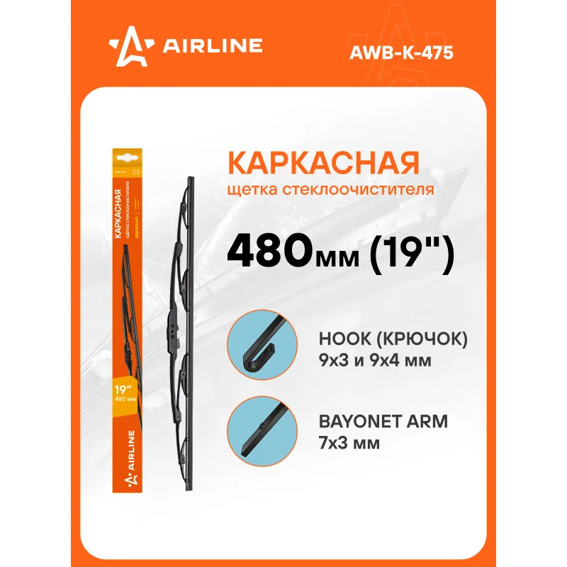 Щетка стеклоочистителя 480 мм (19") каркасная, 1 адаптер Описание: Каркасная конструкция щетки стеклоочистителя — это качество, проверенное десятилетиями. Такие щетки являются самыми доступными по цене, обладает высокой прочностью, и лучшими показателями прилегания резинок к стеклу автомобиля. К классической форме щетки производители AIRLINE добавили изменения в составе резины, позволяющие продлить ее срок использования. В комплект добавлен адаптер подходящий для крепления: Hook 9x3, 9x4 mm - Крючок 9x3, 9x4 мм, Bayonet arm 7x3 mm - Штыковой замок 7x3 мм для установки на самые распространенные марки автомобиля. Если у вас есть вопросы по применяемости, мы всегда готовы помочь вам с подбором по VIN-НОМЕРУ ВАШЕГО АВТОМОБИЛЯ. Преимущества щетки: Материал щетки - долговечная натуральная износостойкая резина (произведена по эксклюзивной anti-age технологии с использованием озона); Адаптеры произведены из специального технического пластика, который сохраняет свои свойства от -40 до +60; Бесшумная работа каркасной щетки стеклоочистителя; Возможность использовать на автомобилях, как с левым, так и с правым расположением руля, а так же на автомобилях с распашной системой очистки стекла. Характеристики: Артикул: AWB-K-475 OEM номера: 6426.JG, 6426.JH, 85212-97201-000, 85212-97204-000, 85212-97206-000, 85212-97207-000, 85212-97502-000, 85212-B2050, 85212-B2050-000, 85220-87109-000, 85222 87706 000, 85291-B2030, 85291-B2030-000, 89FG17528C2A, YL8X17528DA, YL8X17528EA, 1148288, 1U2J-17528-CA, 4U2J-17528-GA, MEEU2J-17528-CAA, 76630-TE0-A01, 76630-TE0-A011M2, 38470-SB3-013, 76620-S10-G01, 76620-S2G-003, 76620-S2K-004, 76630-TA0-J01, 76730-TV0-E01, 76630-SP0-A01, 76630-SYP-004, 76630-SZ3-901, 76630-T2A-J01, 76630-TA0-A01, 76630-TA0-A02, 76630-SJD-G01, 76630-SK7-003, 76630-SK7-Q01, 76630-SL4-003, 76630-SM4-A01, 76630-SP0-003, 76630-S5D-A02, 76630-S5S-A01, 76630-SF1-003, 76630-SH2-E01, 76630-SH2-G02, 76630-SJD-003, 76630-S3Y-Q02, 76630-S5A-003, 76630-S5A-013, 76630-S5A-A01, 76630-S5A-A02, 76630-S5D-A01, 76620-S70-003, 76620-SE0-003, 76620-SH2-E01, 76630-S0K-J01, 76630-S1A-G01, 76630-S30-003, 5-86006-365-0, 8-94317-671-0, 8-97143-286-0, 8-97260-433-0, 8-97351-485-0, 8-97556-203-0, 8-98193-816-0, BBP3-67-330, GJ84-67-330, HE22-67-330, BE8T-67-330, 1A10-67-330, 1A12-67-330, H264-67-330A, H264-67-330B, G212-67-330C, G212-67-330D, G214-67-330B, H261-67-330B, H261-67-330C, H264-67-330, BBW2-67-330, BJS8-67-330, BP4L-67-330, BP4L-67-330A, BP4L-67-330B, G212-67-330B, 1A15-67-330, B17W-67-330, B30L-67-330, B32L-67-330, B32T-67-330, BBM5-67-330, 8250A114, MZ690107, 8250A004, MB 306646, MB571770, MB 683713, MR971990, MR 300675, MR 300677, MR 300878, MR 416649, MR 517093, MR 971352, MR 109848, MR 155141, MR 192101, MR 192111, MR 300287, MR 300673, MB 683947, MB 683948, MB 683949, MB 848357, MB 859556, MR 109801, KE288-89927-AG, 28790-30P00, 28790-73E00, 28790-73E05, 28890-01N05, 28890-01N15, AY00A-UZ34R, AY00B-UZ34R, AY02A-UY51R, B8890-G5710, 28890-Y9000, 288953X40B, 28895-5X11B, AY000-U475S, AY001-U475R, AY00A-UY51R, 28890-G5400, 28890-JF01A, 28890-V5001, 28890-V6900, 28890-V6906, 28890-V7705, 28890-6A0A2, 28890-73C00, 28890-91P00, 28890-9W110, 28890-EB410, 28890-EH105, 28890-3XA3A, 28890-4X11A, 28890-51S10, 28890-51S15, 28890-5X11A, 28890-62N00, 28890-1N710, 28890-22G01, 28890-26F00, 28890-34E05, 28890-37B05, 28890-37B10, 28890-0M010, 28890-10V10, 28890-10V15, 28890-11C20, 28890-16G01, 28890-16G05, 12 72 208, 12 72 791, 62 72 206, 62 72 241, 62 72 244, 62 72 246, 6272257, 928.628.90101, 287900001R, 7711 170 142, 86542-AJ060, 86542-SA030, 86542-AC020, 86542-AC040, 86542-AC060, 86542-AJ050, 86542-SA090, 86542-FC030, 86542-FC040, 86542-FC050, 86542-KA111, 86542-SA010, 86542-SA080, 38340-65DP0, 38340-65J01, 38340-65J11, 38330-65J10, 38340-58J50, 38340-65D00, 38340-78J10, 38340-80G10, 38340-86G10, 38340-86G60, 38340-67D10, 38340-70F10, 38340-74G10, 38340-74G50, 38340-75F30, 38340-78J00, 38340-65D31, 38340-65J20, 38340-65J21, 38340-65J30, 38340-65J31, 38340-67D00, 38340-65D01, 38340-65D10, 38340-65D11, 38340-65D20, 38340-65D21, 38340-65D30, 85212-20390, 85212-20400, 85222-20370, 85222-30580, 85222-3H080, 85212-0C010, 85222-3H051, 85291-32010, 85291-32020, 85242-22050, 85242-32060, 85242-33010, 85212-23020, 85222-3H030, 85222-3H050, 85222-53010, 85222-53011, 85222-60110, 85222-60140, 85222-B1040, 85222-BZ090, 85222-3H060, 85222-48030, 85222-48110, 85222-48111, 85222-52060, 85222-52061, 85222-33060, 85222-33120, 85222-35080, 85222-3H010, 85222-3H020, 85222-3H021, 85222-22750, 85222-23050, 85222-24060, 85222-24061, 85222-26040, 85222-26050, 85222-0C012, 85222-0K090, 85222-0W010, 85222-0W030, 85222-17020, 85222-17050, 85220-3A130, 85220-3A140, 85220-3A150, 85222-07020, 85222-0C010, 85222-0C011, 85220-32610, 85220-32671, 85220-3A060, 85220-3A070, 85220-3A080, 85220-3A120, 85220-16350, 85220-16450, 85220-16451, 85220-30220, 85220-32310, 85220-32580, 85212-AA040, 85212-AA050, 85212-AA080, 85212-BZ090, 85220-12700, 85220-16100, 8521253051, 85212-60070, 85212-97201, 85212-97502, 85212