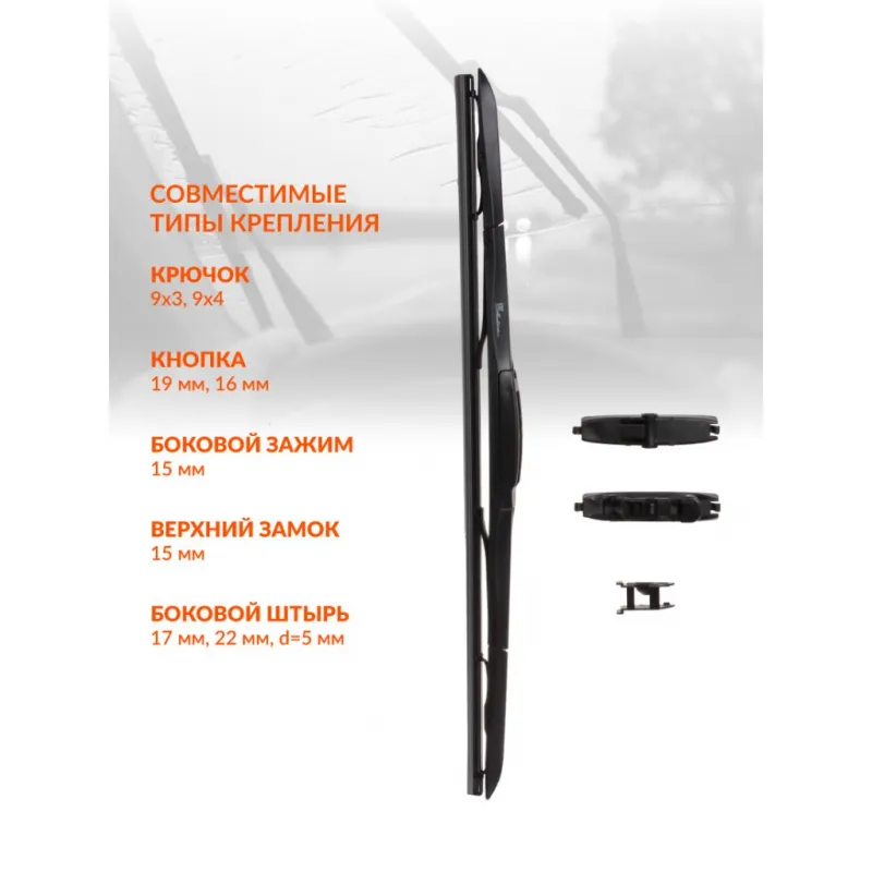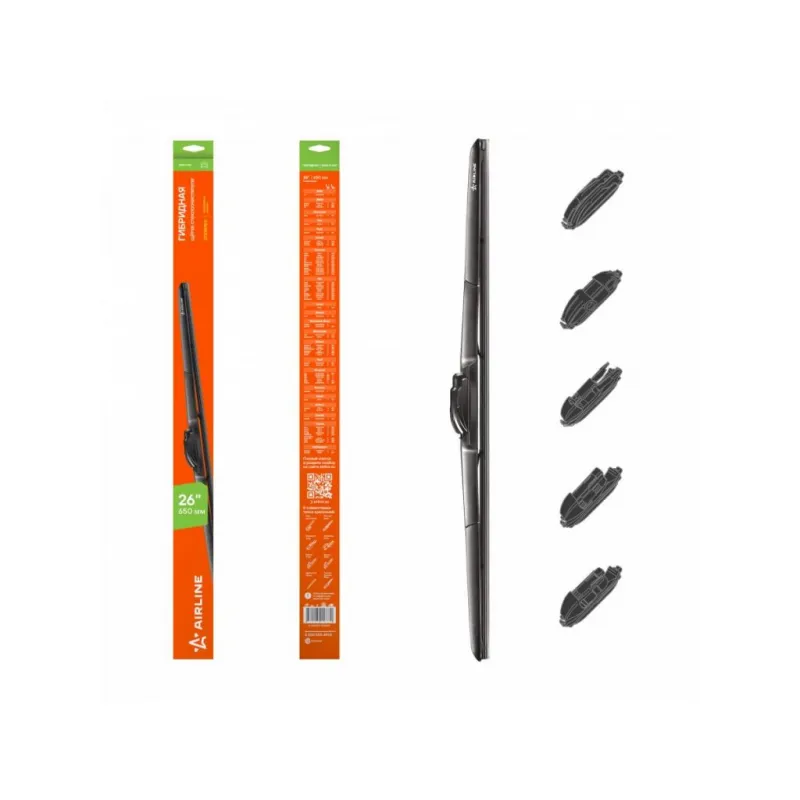 Щетка стеклоочистителя 650 мм (26") гибридная 5 адаптеров Описание: Гибридные щетки - это смесь каркасной щетки, со всеми ее преимуществами надежного прилегания к стеклу автомобиля и наличием пластикового кожуха. Кожух выполняет защитную функцию и не позволяет налипать мокрому снегу и льду. Второе его преимущество - он выполняет функцию спойлера, благодаря аэродинамической конструкции. Щетка гораздо лучше прилегает к стеклу автомобиля, особенно это заметно на больших скоростях. Для щеток были специально разработаны 3 различных мульти-адаптера, которые подходят на 8 типов поводков Hook 9x3, 9x4 mm - Крючок 9x3, 9x4 мм,Push Button 16 mm - Узкая кнопка 16 мм (H6-2), Push Button 19 mm - Кнопка 19 мм (H6-1), и с помощью которых становится возможным использовать щетки в подавляющем большинстве существующих креплений, и соответственно сделать подходящими на 95% автомобилей. Наличие в резине частиц озона, а также нанесение графитового покрытия на верхний эксплуатационный слой резины. Озон создает anti-age технологию, которая значительно увеличивает период использования щетки и обеспечивает сохранение ее рабочих свойств. При работе щетки не создают шумовых помех, а также гладко скользят по стеклу, обеспечивая тщательное и безопасное очищение. Если у вас есть вопросы по применяемости, мы всегда готовы помочь вам с подбором по VIN-НОМЕРУ ВАШЕГО АВТОМОБИЛЯ. Преимущества щетки AIRLINE AWB-H-650 -Материал щетки - долговечная искусственная резина (произведенная по эксклюзивной anti-age технологии с использованием озона); -Бесшумная работа каркасной щетки стеклоочистителя; -Равномерный прижим щетки к поверхности стекла; Характеристики: Артикул: AWB-H-650 OEM номера: 61 61 2 183 576, 6426.JG, 1680486, 1680506, 1694741, 1465888, 1473406, 1473407, 6M2JS17528AA, 1537074, 1537075, 1537077, 1537084, 1556082, 3M51S17528AA, 76620-SEA-G01, 76620-SEA-G11, 76620-SWA-G11, 76620-SZTA-G01-0M1, 76620-TE0-A01, 76620-TF0-0041, 76620-TV0-G01, 76620-TVA-A01, 76620-TY3-J02, 76620-TZA-J01, 76620-TF0-004, 76620-TME-T02, 76620-TP6-A01, 76620-TP6-A02, 76620-TR0-A01, 76620-TR0-A02, 76620-T5A-J01, 76620-T5A-J02, 76620-T7A-003, 76620-TA0-J01, 76620-TDK-J03, 76620-TEA-T02, 76620-SYY-003, 76620-SYY-013, 76620-SZT-E01, 76620-SZT-G01, 76620-T0A-J01, 76620-T2A-J01, 76620-SMA-004, 76620-SMG-G11, 76620-SNA-A11, 76620-SNA-U02, 76620-SNB-G01, 76620-SWA-J01, 76620-SJD-003, 76620-SJD-G01, 76620-SJK-003, 76620-SLE-J01, 76620-SLJ-003, 76620-SLJ-J01, 76620-TF0-G01, 76620-TF0-G01-1M1, 76620SWAA01, 76620-SDC-T01, 76620-SEA-003, 76620-SEA-J11, CC29-67-330, TD11-67-330, E221-67-330, EG21-67-330, C235-67-330, C243-67-330, C273-67-330, 211 820 14 45, A 211 820 14 45, A1688201645, 8250A104, 8250A184, 8250A255, 8250A035, 8250A037, 8250A207, MR 472606, MN 127797, MN154885, MR 155991, MR 192015, MR 416320, MR 472595, 8250A594, 8250A595, 8250A752, 8250A753, 8250B026, 8250B125, 28890-4EH0A, 28890-AU310, 28890-EM30B, 28891-3Y61B, 28890-00Q1B, 28890-0C000, 28890-JN00B, AY01D-UC26R, AY01D-UT32R, AY02D-UB17R, AY02D-UE12R, AY02D-UT32R, AY02D-UY51R, AY00D-UT32R, AY00D-UY51R, AY00J-UDC2R, AY00J-UDE5R, AY00J-UDU3R, AY00J-UDZ5R, AY002-U650R, AY00D-UC25R, AY00D-UC26R, AY00D-UE12R, AY00D-UE52R, AY00D-UJ32R, 28890CC00B, 28890-HA00A, 28891-2Y907, 28891-3Y605, 28891-3Y606, AY001-U700R, 28890-3C910, 28890-3C911, 28890-3JY0B, 28890-5WJ0A, 28890-BU000, 28890-BU005, 28890-0C005, 28890-0C010, 28890-0C011, 28890-0C015, 28890-3C900, 28890-3C901, 62 72 310, 6423.22, 6424.CK, 6426.ZE, 6426.ZF, E429015, 6423.A6, 6426.JP, 6426.V5, 6426.YG, 28 89 033 84R, 28 89 067 96R, 86542-AJ010, 86542-AJ000, 86542-AL000, 86542-FJ000, 86542-FJ020, 86542-FJ030, 86542-SG020, 86542-SG100, 86542-SG110, 86542-XA04A, 86542AL020, 38340-61M00, 38340-79J00, 38340-80J50, 38340-80J51, 38340-50Z20, 38340-51Z01, 38340-61M10, 38340-80J10, 38340-80J60, 85212-12450, 85212-48140, 85212-68050, 85212-76010, 85222-12840, 85222-12890, 85291-44060, 85291-44070, 85291-47010, 85291-47020, 85291-48020, 85222AA070, 85222-AA040, 85222-AA050, 85222-AE010, 85291-48010, 85291-26080, 85291-44050, 85222-44070, 8522247020, 85222-47100, 85222-47101, 85222-48130, 85222-60260, 85222-20450, 85222-20460, 85222-33270, 85222-33340, 85222-42120, 85222-42180, 85222-0E050, 85222-0F010, 85222-0F030, 85222-0H010, 85222-12480, 85222-12830, 85222-06130, 85222-06131, 85222-06170, 85222-06210, 85222-06250, 85222-0E040, 85212-68040, 85222-02210, 85222-02211, 85222-02230, 85222-02250, 85222-02300, 85212-52210, 85212-52250, 85212-58020, 85212-60220, 85212-62060, 85212-68010, 85212-44020, 85212-44050, 85212-44060, 85212-44100, 85212-48080, 85212-48120, 85212-26100, 85212-30470, 85212-33350, 85212-37100, 85212-42150, 85212-42200, 85212-02290, 85212-10190, 85212-12480, 85212-12490, 85212-