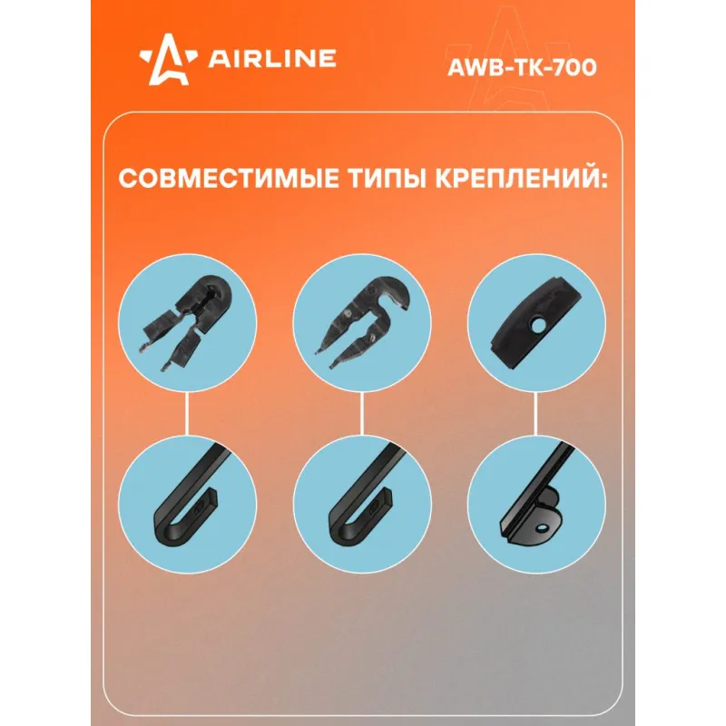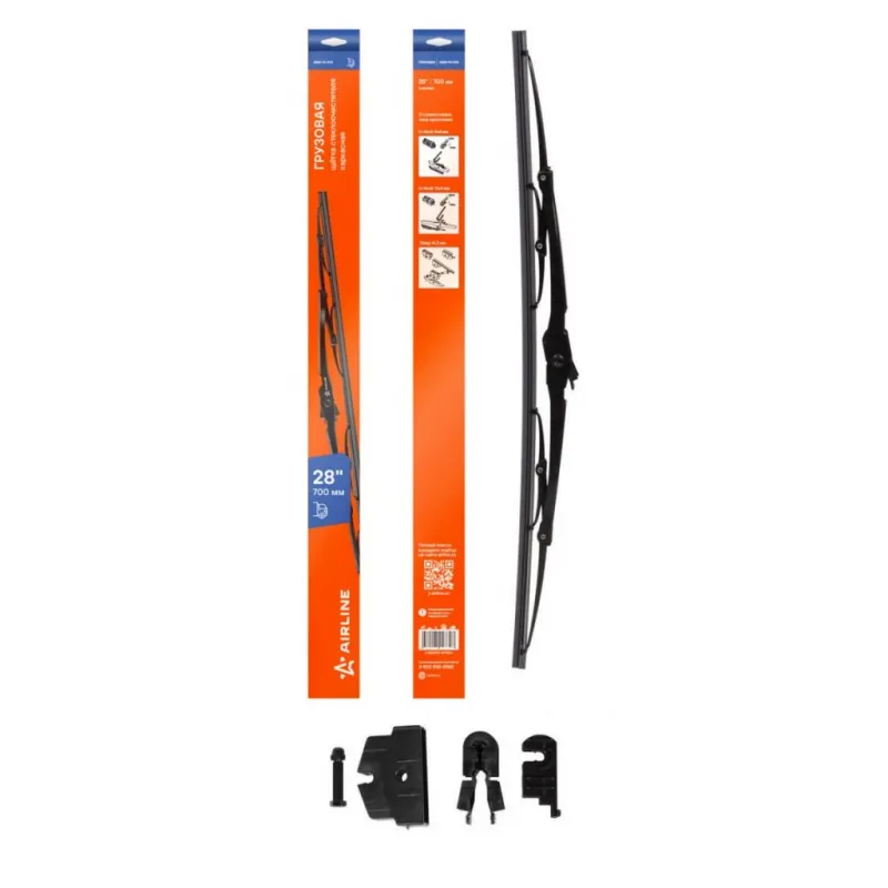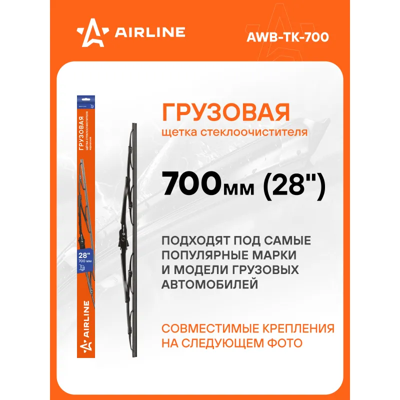 Щетка стеклоочистителя 700 мм (28") каркасная грузовая 3 адаптера в комплекте Описание: Каркасная конструкция щетки стеклоочистителя — это качество, проверенное десятилетиями. Такие щетки являются самыми доступными по цене, обладает высокой прочностью, и лучшими показателями прилегания резинок к стеклу автомобиля. К классической форме щетки производители AIRLINE добавили изменения в составе резины, позволяющие продлить ее срок использования. В комплекте к щетке прилагаются адаптеры Hook 12x4 mm - Крючок 12x4 мм, Hook 9x4 mm - Крючок 9x4 мм, Clasp 16.2, которые необходимы для установки на автомобили различных марок (подходя для 95% марок и моделей автомобилей). Применяемость: . Если у вас есть вопросы по применяемости, мы всегда готовы помочь вам с подбором по VIN-НОМЕРУ ВАШЕГО АВТОМОБИЛЯ. Преимущества щетки AIRLINE AWB-TK-700 -Материал щетки - долговечная искусственная резина (произведенная по эксклюзивной anti-age технологии с использованием озона); -Адаптеры произведены из специального технического пластика, от -40 до +60; -Бесшумная работа каркасной щетки стеклоочистителя; -Равномерный прижим щетки к поверхности стекла; -Возможность использовать на автомобилях, как с левым, так и с правым расположением руля, а так же на автомобилях с распашной системой очистки стекла. Мы гарантируем качество и надежность наших товаров. Характеристики: Артикул: AWB-TK-700 OEM номера: 0911212 S2, 1542873 S2, 1542874, 1542876, 911212 S2, 1517870, 1517869, 1501140, 1501139, 1501138, 1501137, JC46-17528-AC, JC46-17528-AD, T293960, T336882, 76620-SFE-004, 98480107, 4762247, 42302246, 37065205900, 81.26440.6006, 81.26440.0043, 81.70701.0331, 84.26440.0003, 81.26440.0029, 81.26440.0032, 81264400032S, 81264400029S, 81.26440.6021, 84264400003S, 81707010331S, 81264406021S, 81264406006S, 81264400043S, 001 820 48 45, A 001 820 48 45, 000 820 3745, A 000 820 3745, 001 820 5445, A001 820 5445, 0008203745S, 000 820 97 45, 000 820 36 45, 381 824 01 26, 00182012450010, 001 820 73 45, 001 820 12 45 10, 0008209745S, 0008207345S, 001 820 12 45, A 001 820 12 45, 001 820 71 45, A 001 820 69 45, A 001 820 71 45, 001 820 69 45, MZ690425, MN182389, 8250A277, B889U-HS28E, 28890-3TA0A, 50 01 865 596, 5021190022, 5021190021, 5010441122, 5010268848, 5001829210, 5001821427, 5000830085, 50 01 865 597, 1541106, 1 849 340, 1 358 287, 2 657 197, 1 380 036, 1431178, 1450076, 2848235, 639583, 541106, 464499, 424405, 1849341, 1780246, 85212-28110, 85212-28031, 82485683, 20826592, 20537743, 84035980, 8189186, 3944817, 20537744, 1606291, 6423L3, 6423L1, 1265263, 7731123109, 845205900, GT-28TRJ70, GT-28TR70, GT28ST70, GT28SP70 Кол-во адаптеров, шт: 3 Размер, мм: 700 Размер, дюйм: 28 Тип: Грузовая каркасная Адаптер крепления 1: Hook 12x4 mm - Крючок 12x4 мм Адаптер крепления 2: Hook 9x4 mm - Крючок 9x4 мм Адаптер крепления 3: Clasp 16.2 Комплектация: Щетка стеклоочистителя - 1 шт Адаптеры - 3 шт Картонная коробка - 1 шт Гарантия: от 1 года.