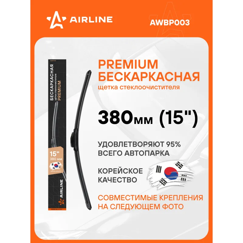 Щетка стеклоочистителя бескаркас PREMIUM 380мм (15") 5 адаптеров Описание: Щетка стеклоочистителя бескаркасная PREMIUM 380 мм 15 " / дворники для автомобиля от бренда AIRLINE AWBP003 (5 адаптеров) с бескаркасной конструкцией обладает рядом существенных преимуществ. К ним стоит отнести максимальную плотность прилегания щеток к стеклу, отличное аэродинамическое сопротивление, обеспечивающее бесшумное и быстрое скольжение изделия. За счет плотного прилегания к стеклу щетки способны очищать даже самые труднодоступные загрязнения. Особый состав резины препятствует старению и износу изделия. Применяемость: ABARTH PUNTO, GRANDE PUNTO, ALFA ROMEO MITO, CHEVROLET AVEO, SPARK, DAEWOO MATIZ, DAIHATSU MOVE, GRAN MOVE, TERIOS, FIAT PANDA, IDEA, PUNTO, 500, LINEA, FORD RANGER, FIESTA, GEELY MK, HONDA JAZZ, CIVIC, JEEP WRANGLER, LANCIA MUSA, YPSILON, NISSAN QASHQAI, JUKE, RAVON R2, SEAT Mii, TOLEDO, SUBARU LIBERO, TOYOTA YARIS, VW KAEFER, FOX, POLO.. Если у вас есть вопросы по применяемости, мы всегда готовы помочь вам с подбором по VIN-НОМЕРУ ВАШЕГО АВТОМОБИЛЯ. Преимущества щетки AIRLINE AWBP003 -Материал щетки - Пластик, натуральная резина, сталь.; -Адаптеры произведены из специального технического пластика, от -40 до +60; -Бесшумная работа бескаркасной щетки стеклоочистителя; -Равномерный прижим щетки к поверхности стекла; Наша передовая конструкция гарантирует превосходную очистку, долговечность и бесшумную работу, используя резинку из натурального каучука. Это стильное и качественное решение создано для комфортного и безопасного вождения в любых погодных условиях. Поднимите стандарты ухода за вашим автомобилем с PREMIUM – выбором, который сочетает в себе эффективность, долговечность и стиль. Характеристики: Артикул: AWBP003 OEM номера: 85220-22490-000, 85222-97203-000, 85222-97206-000, 85222-97209-000, 85242-28020-000, 85242-87701-000, 85291-87207-000, 85242-97501-000, 85290-87201-000, 85290-87202-000, 85290-87501-000, 85290-87502-000, 85291-87202-000, 2120566, AS7J-17402-AA, GM5J-A17402-CA, 76630-S3A-003, 76630-S5S-E01, 76630-S5S-G01, 76630-S6A-003, 76630-SAA-004, 76630-SAA-G01, 76730-S0A-921, 76730-S30-901, 76730-SV5-A01, 76730-TAA-003, 76730-TAA-N01, 76630-SZW-J01, 76630-T4G-003, 76630-T6A-J02, 76630-TDK-J03, 76630-TM0-G01, 76630-TZA-J01, 76630-SEA-003, 76630-SEA-G01, 76630-SEA-G11, 76630-SEA-J11, 76630-SJ6-003, 76630-SYA-003, 5-86011-160-0, 8-94358-867-0, 8-94423-654-0, 8-97252-182-0, 8-97252-182-2, 1A03-67-330, 1A53-67-330, 8418-67-330, 8421-67-330, A084-67-330, D462-67-330, ZZS3-67-330, ZZS6-67-330, D462-67-330A, D464-67-330, D464-67-330A, G14S-67-330, G14T-67-330, ZZS0-67-330, A4638200345, 8250A769, MB 141142, MB542553, MB542554, MB 623074, MB623364, MR416323, MR 441471, MB 639953, MB 859530, MB 859545, MR 164792, MR 339500, MR 361511, 28890-JD910, 28890-JD910C, 28790-70N00, 28790-70N05, 28790-HC000, 28890-6A00F, 28890-6A0A0, 28890-ES51A, AY001-U380R, 28890-JD010, 28890-JD91C, LR043987, 78654-2210, 78654-2211, 78654-2390, 78654-2400, 86542-AA010, 86542-AA050, 86542GA130, 86542GA710, 86542-KA121, 86542-KC010, 86542-SA100, 86542-AC150, 86542-AE070, 86542-FC060, 86542-FC100, 86542-FC110, 86542-FE050, 38340-76F10, 38340-77510, 85220-22371, 85220-22510, 85220-22600, 85222-B1100, 85242-10020, 85242-12080, 85242-44010, 85242-60030, 85242-97501, 85290-87202, 85242-13010, 85242-13030, 85242-20010, 85242-20060, 85242-20070, 85242-28020, 3B9 955 427, 8D9 955 425, 8D9955427, 95228810, 95212732, 96301840, ROVER, A00063170, MOTORS Размер, мм: 380 Размер, дюйм: 15 Тип: Бескаркасная Кол-во адаптеров, шт: 5 Адаптер крепления 1: Hook 9x3, 9x4 mm - Крючок 9x3, 9x4 мм (VM1) Адаптер крепления 2: Push Button 16 mm - Узкая кнопка 16 мм (VM3) Адаптер крепления 3: Push Button 19 mm - Кнопка 19 мм (VM4) Адаптер крепления 4: Side pin 17 mm, 22 mm - Боковой штырь 17 мм, 22 мм (VM2) Адаптер крепления 5: Pinch Tab - Боковой зажим, Top Lock - Верхник замок (VM6) Сопутсвующие товары: Адаптер для бескаркас щеток стеклоочистителя PREMIUM "Bayonet Arm 8x4, 9x4мм", 2 шт.: AWBA01 Сопутсвующие товары: Адаптер для бескаркас щеток стеклоочистителя PREMIUM "MG", 2 шт.: AWBA02 Сопутсвующие товары: Адаптер для бескаркас щеток стеклоочистителя PREMIUM "DNTL1.1", 2 шт.: AWBA03 Сопутсвующие товары: Адаптер для бескаркас щеток стеклоочистителя PREMIUM "VATL5.1", 2 шт.: AWBA04 Сопутсвующие товары: Адаптер для бескаркас щеток стеклоочистителя PREMIUM "MBTL