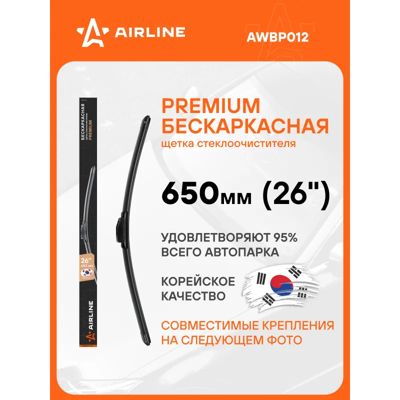 Щетка стеклоочистителя бескаркас PREMIUM 650мм (26") 5 адаптеров Описание: Щетка стеклоочистителя бескаркасная PREMIUM 650 мм 26 " / дворники для автомобиля от бренда AIRLINE AWBP012 (5 адаптеров) с бескаркасной конструкцией обладает рядом существенных преимуществ. К ним стоит отнести максимальную плотность прилегания щеток к стеклу, отличное аэродинамическое сопротивление, обеспечивающее бесшумное и быстрое скольжение изделия. За счет плотного прилегания к стеклу щетки способны очищать даже самые труднодоступные загрязнения. Особый состав резины препятствует старению и износу изделия. Применяемость: . Если у вас есть вопросы по применяемости, мы всегда готовы помочь вам с подбором по VIN-НОМЕРУ ВАШЕГО АВТОМОБИЛЯ. Преимущества щетки AIRLINE AWBP012 -Материал щетки - Пластик, натуральная резина, сталь.; -Адаптеры произведены из специального технического пластика, от -40 до +60; -Бесшумная работа бескаркасной щетки стеклоочистителя; -Равномерный прижим щетки к поверхности стекла; Наша передовая конструкция гарантирует превосходную очистку, долговечность и бесшумную работу, используя резинку из натурального каучука. Это стильное и качественное решение создано для комфортного и безопасного вождения в любых погодных условиях. Поднимите стандарты ухода за вашим автомобилем с PREMIUM – выбором, который сочетает в себе эффективность, долговечность и стиль. Характеристики: Артикул: AWBP012 OEM номера: 8Y1998002, 61 61 2 183 576, 61 61 5 A25 860, 61 61 9 466 590, 61619466593, 61617469820, 61610003090, 61612458020, 61 61 9 466 377, 61619478909, 61612407288, 61612408631, 61 61 2 447 932, 61 61 2 458 006, 61 61 2 458 015, 61 61 2 458 017, 6426.JG, 6324.J6, 6423.H6, 6426.YP, 1465888, 1473406, 1473407, 1537074, 1537075, 1537077, BB5Z-17528-E, DS7317528-AC, DS7317528-BC, JX7B17528-BA, LB5Z-17528-A, MEEU2J17528-KA, 5318074, 7S711-7B437-AA, 7S7J-17B437-AA, 8A6117528-AF, AA6J17528-AA, AM5117528-AD, 1899706, 2026778, 2206402, 3M5J17B437-AA, 4M5J-17B437-AA, 5318073, 6M2JS17528AA, 1462906, 1680508, 1680511, 1726283, 1850109, 1537084, 1556082, 1680486, 1680506, 1694741, 3M51S17528AA, 76620-SEA-G01, 76620-SEA-G11, 76620-SWA-G11, 76620-SZTA-G01-0M1, 76620-TE0-A01, 76620-TF0-0041, 76620-TV0-G01, 76620-TVA-A01, 76620-TY3-J02, 76620-TZA-J01, 76620-TF0-004, 76620-TME-T02, 76620-TP6-A01, 76620-TP6-A02, 76620-TR0-A01, 76620-TR0-A02, 76620-T5A-J01, 76620-T5A-J02, 76620-T7A-003, 76620-TA0-J01, 76620-TDK-J03, 76620-TEA-T02, 76620-SYY-003, 76620-SYY-013, 76620-SZT-E01, 76620-SZT-G01, 76620-T0A-J01, 76620-T2A-J01, 76620-SMA-004, 76620-SMG-G11, 76620-SNA-A11, 76620-SNA-U02, 76620-SNB-G01, 76620-SWA-J01, 76620-SJD-003, 76620-SJD-G01, 76620-SJK-003, 76620-SLE-J01, 76620-SLJ-003, 76620-SLJ-J01, 76620-TF0-G01, 76620-TF0-G01-1M1, 76620SWAA01, 76620-SDC-T01, 76620-SEA-003, 76620-SEA-J11, 28 89 030 13R, CC29-67-330, TD11-67-330, E221-67-330, EG21-67-330, C235-67-330, C243-67-330, C273-67-330, TK93-67-330, 211 820 14 45, A 211 820 14 45, A1688201645, A 166 820 10 45, A 166 820 10 45 28, A 166 820 78 00, A2468202700, A2478200502, A9108240000, A1698201700, A2118202945, A2228201345, A2468201245, A9068201000, A 223 824 00 00, 8250A104, 8250A184, 8250A255, 8250A035, 8250A037, 8250A207, MR 472606, 8250B220, MN 127797, MN154885, MR 155991, MR 192015, MR 416320, MR 472595, 8250A594, 8250A595, 8250A752, 8250A753, 8250B026, 8250B125, 28890-4EH0A, 28890-AU310, 28890-EM30B, 28891-3Y61B, 28890-00Q1B, 28890-0C000, 28890-JN00B, 28890-4MA0A, AY01D-UC26R, AY01D-UT32R, AY02D-UB17R, AY02D-UE12R, AY02D-UT32R, AY02D-UY51R, AY00D-UT32R, AY00D-UY51R, AY00J-UDC2R, AY00J-UDE5R, AY00J-UDU3R, AY00J-UDZ5R, AY002-U650R, AY00D-UC25R, AY00D-UC26R, AY00D-UE12R, AY00D-UE52R, AY00D-UJ32R, 28890CC00B, 28890-HA00A, 28891-2Y907, 28891-3Y605, 28891-3Y606, AY001-U700R, 28890-3C910, 28890-3C911, 28890-3JY0B, 28890-5WJ0A, 28890-BU000, 28890-BU005, 28890-0C005, 28890-0C010, 28890-0C011, 28890-0C015, 28890-3C900, 28890-3C901, 62 72 310, 6423.22, 6423.A6, 6424.CK, 6426.ZE, 6426.ZF, E429015, 6426.JP, 6426.V5, 6426.YG, 6426.VJ, 6426.YV, 28 89 033 84R, 28 89 067 96R, 28 89 536 63R, 28 89 550 07R, 288900003R, 28 89 004 32R, 28 89 014 21R, 77 01 056 011, 7701061772, 86542-AJ010, 86542-AJ000, 86542-AL000, 86542-FJ000, 86542-FJ020, 86542-FJ030, 86542-AN010, 86542-FL000, 86542-FL020, 86542-FL021, 86542-SJ000, 86542-SJ010, 86542-SG020, 86542-SG100, 86542-SG110, 86542-XA04A, 86542AL020, 86542-AN000, 38340-61M00, 38340-79J00, 38340-80J50, 38340-80J51, 38340-50Z20, 38340-51Z01, 38340-61M10, 38340-80J10, 38340-80J60, 85212-12450, 85212-48140, 85212-68050, 85212-76010, 85222-12840, 85222-12890, 85222-0C020, 85222-0C021, 85222-0C030, 85222AA070, 85212-52202, 85212-52203, 85222-78012, 85222-F4010, 85222-F4011, 85222-05070, 85291-44060, 85291-44070, 85291-47010, 85291-47020, 85291-48020, 85212-10160, 85222-AA040, 85222-AA050, 85222-AE010, 85291-48010, 85291-26080, 85291-44050, 85222-44070, 8522247