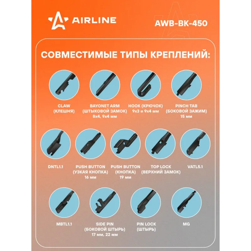 Щетка стеклоочистителя бескаркасная PRO 450мм (18") 13 адаптеров Описание: Щетка стеклоочистителя с бескаркасной конструкцией обладает рядом существенных преимуществ. К ним стоит отнести максимальную плотность прилегания щеток к стеклу, отличное аэродинамическое сопротивление, обеспечивающее бесшумное и быстрое скольжение изделия. За счет плотного прилегания к стеклу щетки способны очищать даже самые труднодоступные загрязнения. Особый состав резины препятствует старению и износу изделия. В комплекте к щетке прилагаются адаптеры, которые необходимы для установки на автомобили различных марок (подходят для 95% марок и моделей автомобилей). Если у вас есть вопросы по применяемости, мы всегда готовы помочь вам с подбором по VIN-НОМЕРУ ВАШЕГО АВТОМОБИЛЯ. Преимущества щетки: -Материал бескаркасной щетки стеклоочистителя - долговечная искусственная резина (произведенная по эксклюзивной anti-age технологии с использованием озона); -Адаптеры произведены из специального технического пластика, который сохраняет свои свойства от -40 до +60; -Эффективность в работе; -Возможность использовать на автомобилях, как с левым, так и с правым расположением руля, а так же на автомобилях с распашной системой очистки стекла. Характеристики: Артикул: AWB-BK-450 OEM номера: 61 61 9 069 195, 61 61 0 415 881, 61 61 2 159 629, 61 61 2 455 437, 61 61 2 455 440, 61 61 2 458 006, 61 61 2 458 015, 61 62 7 009 884, 61610003090, 61 61 2 219 147, 6426.YQ, 6426.JH, 85212-28070-000, 85212-87201-000, 85212-87203-000, 85212-87209-000, 85212-87701-000, 85212-97203-000, 85291-87704-000, 85291-B2040-000, 85220-87218-000, 85220-87726-000, 85222-28030-000, 85222-87701-000, 85222-97201-000, 85220-87108-000, 85212-97205-000, 85212-97208-000, 85212-97209, 85212-97209-000, 85220-16410-000, 85220-16420-000, 5911650, 84AU17528B, A780X17528AJA, XM3417528FA, XM3417528HA, 1332348, 76630-S2X-003, 76630-S30-E01, 76630-S30-G01, 76630-S3Y-003, 76630-S3Y-G01, 76630-S70-003, 76630-ST3-E05, 76630-TEA-T02, 76630-TV0-G01, 76730-SEA-003, 76730-ST3-E11, 76630-S84-G01, 76630-SCC-003, 76630-SCC-013, 76630-SDC-T01, 76630-SF4-003, 76630-SH3-G11, 5-86006-365-0, 8-94269-070-0, 8-94353-789-0, 8-94353-855-0, 8-94353-856-0, 8450008572, 8450030855, 8FG2-67-330A, B095-67-330, BE5J-67-330, BHS3-67-330, BJ0F-67-330, FE15-67-330A, NE76-67-330A, UJ06-67-330, UJ07-67-330, UJ35-67-330, FD03-67-330, 8FG7-67-330B-9K, N122-67-330A, N123-67-330A, NC10-67-330, NC1167330, NE52-67-330B, NE75-67-330B, KD2W-67-330, LC62-67-330, M002-67-330, N053-67-330, N054-67-330, N121-67-330A, G030-67-330A, G22D-67-330, GBFN-67-330, GJ6E-67-330, J002-67-330, K015-67-330, D040-67-330A, DX01-67-330, F156-67-330, FD03-67-330A, FE15-67-330, FE16-67-330, B01K-67-330, B01K-67-330A, B16B-67-330, B302-67-330, B461-67-330, B461-67-330A, 1A63-67-330, 1N08-67-330, 1N10-67-330, A001-67-330, A001-67-330A, A085-67-330, 1A04-67-330, 1A05-67-330, 1A13-67-330, 1A14-67-330, 1A18-67-330, 1A60-67-330, G044-67-330, GB93-67-330, KD53-67-330, NA12-67-330, NA13-67-330, BE8T-67-330, A1778209800, A4478205400, 8250A186, 8250A375, MB382532, MB622213, MB622214, MN181423, MR 915125, MR109217, MR 300302, MR 416667, MR 416760, MR 416761, MR 416762, MR 441673, MR 574652, MR 300213, MR 339832, MR 361508, MR 361512, MR 416365, MR 416628, MR 154354, MR 154355, MR 192098, MR 192109, MR 275957, MR300210, MB 859105, MB885837, MB 929584, MB 929957, MB 952249, MQ 901371, MB 683719, MB 848455, MB 848476, MB 848801, MB848802, MB 848806, MB 571771, MB 623075, MB 683237, MB 683715, MB683717, MB 683718, 8250A597, 8250A778, 8250B037, MB 415741, MB 487894, MB 530299, MR300879, MR416668, MZ690098, 8250A374, 8250A593, 8250A596, 28890-AM615, 28890-AU311, 28890-AX610, 28890-JR81A, AY00J-UAF5R, 28790-8H310, 28890-13C00, AY002-U43AS, B6365-89938, B8790-15U00, 28790-56E05, 28790-65F00, 28890-05B65, 28890-05B71, 28890 W3560, AY001-U450R, AY00A-UJ50R, AY00A-UZ12R, AY00D-UZ12R, AY00J-UAZ5R, 28890-R8011, 28890-R9711, 28890-V5000, 28890-V6901, 28890-V6905, 28890-W3460, 28890-C8300, 28890CC01B, 28890-CF41A, 28890-HA000, 28890-J7501, 28890-R8010, 28890-53A00, 28890-5V015, 28890-6A00A, 28890-70N05, 28890-AM600, 28890-BU010, 28890-40U10, 28890-41A00, 28890-41B10, 28890-4A00C, 28890-50A05, 28890-50A10, 28890-00Q1A, 28890-00Q1J, 28890-1E300, 28890-1E301, 28890-1FA0A, 28890-1FA2A, 12 72 038, 12 72 330, 12 72 337, 12 72 788, 62 72 294, 12 72 033, 1272346, 12 72 326, 62 72 255, 62 72 279, 62 72 280, 62 72 302, 62 72 303, 6426.CE, 6426.SP, 6426.HR, 6426.SS, 28 89 006 10R, 28 89 032 96R, 28 89 074 91R, 28 89 084 11R, 77 01 038 296, 77 01 057 367, 7701063735, 7701071249, 77114-21438, 28 89 032 11R, 86542-AG160, 86542-SC150, 86542-SC160, 86542 AA040, 86542-AE140, 86542-AE200, 86542-GA481, 86542-FA030, 86542-FA130, 86542-FA170, 86542-GA470, 86542-GA471, 86542-GA472, 86542-AE201, 86542-AG050, 86542-AG060, 86542-AG150, 86542-AN050, 86542-AN060, 38340-60B00, 38340-60B00-000, 38340-60B20, 38340-60B20-000, 38340-65B00, 38340-65B00-000, 38340-81A00, 38340-8
