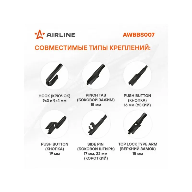 Щетка стеклоочистителя бескаркасная SILICONE 480мм (19") 5 адаптеров Описание: Щетка стеклоочистителя / AIRLINE AWBBS007 с бескаркасной конструкцией, выполненные из силиконовой резинки, представляют собой инновационное решение для обеспечения безупречной чистоты вашего автомобильного стекла. Силиконовая резинка, используемая в этих щетках, превосходит натуральную резинку по ряду параметров: она обеспечивает более долгий срок службы, устойчива к ультрафиолету, экстремальным температурам и озону, что предотвращает растрескивание и быстрое старение. Применяемость: ; Силикон отличается улучшенными гидрофобными свойствами, благодаря чему вода легко смывается с лобового стекла, обеспечивая видимость во время дождя и снегопада. В комплект включены адаптеры для быстрой и простой установки на разнообразные модели автомобилей. Преимущества щетки AIRLINE AWBBS007 - Материал щетки - долговечная искусственная резина; - Адаптеры произведены из специального технического пластика, от -40 до +60; - Адаптеры: Hook;Push Button;Push Button;Side pin;Pinch Tab, Top Lock; - Бесшумная работа бескаркасной щетки стеклоочистителя; - Равномерный прижим щетки к поверхности стекла; Если у вас есть вопросы по применяемости, мы всегда готовы помочь вам с подбором по VIN-НОМЕРУ ВАШЕГО АВТОМОБИЛЯ. С модельными щетками стеклоочистителя AIRLINE каждая поездка будет проходить с максимальным комфортом и безопасностью, независимо от погоды за окном. Характеристики: Артикул: AWBBS007 OEM номера: 61 61 0 427 668, 61 61 2 158 219, 61 61 2 159 627, 61 61 2 241 375, 61612408631, 61 61 2 447 932, 61 61 2 455 435, 61610034739, 6426.JG, 6426.JH, 85212-97201-000, 85212-97204-000, 85212-97206-000, 85212-97207-000, 85212-97502-000, 85212-B2050, 85212-B2050-000, 85220-87109-000, 85222 87706 000, 85291-B2030, 85291-B2030-000, 60594597, 71804095, 71804099, 1680479, 1680507, 1694736, 89FG17528C2A, YL8X17528DA, YL8X17528EA, 1850104, 1U2J-17528-CA, 4U2J-17528-GA, 7S7J-17528-AA, MEEU2J-17528-CAA, 1148288, 1537074, 1537075, 1537084, 3M51S17528AA, 1680499, 76630-TE0-A01, 76630-TE0-A011M2, 38470-SB3-013, 76620-S10-G01, 76620-S2G-003, 76620-S2K-004, 76620-SH2-E01, 76730-TV0-E01, 76630-SZ3-901, 76630-T2A-J01, 76630-TA0-A01, 76630-TA0-A02, 76630-TA0-J01, 76620-SE0-003, 76630-SK7-Q01, 76630-SL4-003, 76630-SM4-A01, 76630-SP0-003, 76630-SP0-A01, 76630-SYP-004, 76630-SF1-003, 76630-SH2-E01, 76630-SH2-G02, 76630-SJD-003, 76630-SJD-G01, 76630-SK7-003, 76630-S5A-013, 76630-S5A-A01, 76630-S5A-A02, 76630-S5D-A01, 76630-S5D-A02, 76630-S5S-A01, 76620-S70-003, 76630-S0K-J01, 76630-S1A-G01, 76630-S30-003, 76630-S3Y-Q02, 76630-S5A-003, 8-94317-671-0, 8-97143-286-0, 8-97260-433-0, 8-97351-485-0, 8-97556-203-0, 8-97556-807-0, 8-98193-816-0, 5-86006-365-0, BBP3-67-330, BP4L-67-330, BP4L-67-330A, GJ84-67-330, HE22-67-330, BE8T-67-330, G214-67-330B, H261-67-330B, H261-67-330C, H264-67-330, H264-67-330A, H264-67-330B, E145-67-330, EC36-67-330A, EC37-67-330, G212-67-330B, G212-67-330C, G212-67-330D, B32T-67-330, BBM5-67-330, BBW2-67-330, BJS8-67-330, BP4L-67-330B, E112-67-330, 1A10-67-330, 1A12-67-330, 1A15-67-330, B17W-67-330, B30L-67-330, B32L-67-330, 176 820 28 00, A 176 820 28 00, 8250A114, MZ690107, 8250A004, MB 306646, MB571770, MB 683713, MR971990, MR 300675, MR 300677, MR 300878, MR 416649, MR 517093, MR 971352, MR 109848, MR 155141, MR 192101, MR 192111, MR 300287, MR 300673, MB 683947, MB 683948, MB 683949, MB 848357, MB 859556, MR 109801, KE288-89927-AG, 28800-5DF1A, 28880-5DF0A, 28890-01N05, 28890-01N15, 28890-0M010, AY02A-UY51R, B8890-G5710, 28790-30P00, 28790-73E00, 28790-73E05, AY00B-UZ34R, 288953X40B, 28895-5X11B, AY000-U475S, AY001-U475R, AY00A-UY51R, AY00A-UZ34R, 28890-JF01A, 28890-V5001, 28890-V6900, 28890-V6906, 28890-V7705, 28890-Y9000, 28890-73C00, 28890-91P00, 28890-9W110, 28890-EB410, 28890-EH105, 28890-G5400, 28890-4X11A, 28890-51S10, 28890-51S15, 28890-5X11A, 28890-62N00, 28890-6A0A2, 28890-22G01, 28890-26F00, 28890-34E05, 28890-37B05, 28890-37B10, 28890-3XA3A, 28890-10V10, 28890-10V15, 28890-11C20, 28890-16G01, 28890-16G05, 28890-1N710, 12 72 208, 12 72 791, 62 72 206, 62 72 241, 62 72 244, 62 72 246, 6272267, 6272257, 928.628.90101, 287900001R, 7711 170 142, 28 88 175 28R, 28 89 058 11R, 28 89 078 68R, 86542-AJ060, 86542-SA030, 86542-AC020, 86542-AC040, 86542-AC060, 86542-AJ050, 86542-SA090, 86542-FC030, 86542-FC040, 86542-FC050, 86542-KA111, 86542-SA010, 86542-SA080, 38340-65DP0, 38340-65J01, 38340-65J11, 38330-65J10, 38340-58J50, 38340-65D00, 38340-78J10, 38340-80G10, 38340-86G10, 38340-86G60, 38340-67D10, 38340-70F10, 38340-74G10, 38340-74G50, 38340-75F30, 38340-78J00, 38340-65D31, 38340-65J20, 38340-65J21, 38340-65J30, 38340-65J31, 38340-67D00, 38340-65D01, 38340-65D10, 38340-65D11, 38340-65D20, 38340-65D21, 38340-65D30, 85212-20390, 85212-20400, 85222-20370, 85222-30580, 85222-3H080, 85212-0C010, 85222-3H051, 85291-32010, 8529