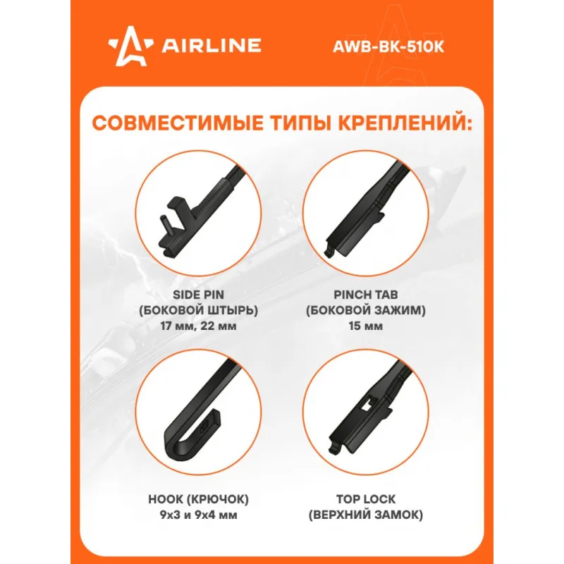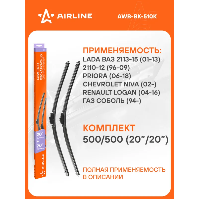 Щетки стеклоочистителя 500/500мм (20"/20") бескаркасные для а/м Лада/ВАЗ 2113-15 (01-13), 2110-12 (96-09), Priora (06-18), Chevrolet Niva (02-), Renault Logan (04-16), ГАЗ Соболь (94-), комплект, 3 типа адаптеров Описание: Щетка стеклоочистителя AIRLINE AWB-BK-510K с бескаркасной конструкцией обладает рядом существенных преимуществ. К ним стоит отнести максимальную плотность прилегания щеток к стеклу, отличное аэродинамическое сопротивление, обеспечивающее бесшумное и быстрое скольжение изделия. За счет плотного прилегания к стеклу щетки способны очищать даже самые труднодоступные загрязнения. Особый состав резины препятствует старению и износу изделия. Применяемость: ALPINA B3, B6, BMW 1, 3, Z3, BRILLIANCE BS6, BS4, CADILLAC XLR, CHERY QQ6, CHEVROLET BLAZER, LUMINA, NIVA, S10, DAEWOO NUBIRA, REXTON, DAIHATSU GRAN MOVE, DODGE DURANGO, FORD ESCAPE, ESCORT, EXCURSION, EXPEDITION, F-SERIES, MUSTANG, GAZ GAZELLE, SOBOL, VALDAI, GMC JIMMY, HONDA NSX, ELEMENT, HYUNDAI SONATA, ISUZU N SERIES (ELF), TROOPER, JEEP GRAND CHEROKEE, LADA SAMARA, ВАЗ 2110-2112, LARGUS, PRIORA, LINCOLN NAVIGATOR, MASERATI 3200 GT, BITURBO, KARIF, MAZDA RX-7, MERCEDES-BENZ AMG GT, SLS, MG TF, MGF, MITSUBISHI PAJERO, PAJERO SPORT, NISSAN CABSTAR, CUBE, KUBISTAR, TERRANO, RENAULT DUSTER, KANGOO, LOGAN, LOGAN / STEPWAY, SANDERO / STEPWAY, TRAFIC, SKODA FELICIA, SSANGYONG REXTON, VOLVO V40.. Если у вас есть вопросы по применяемости, мы всегда готовы помочь вам с подбором по VIN-НОМЕРУ ВАШЕГО АВТОМОБИЛЯ. Преимущества щетки AIRLINE AWB-BK-510K -Материал щетки - долговечная искусственная резина; -Адаптеры произведены из специального технического пластика, от -40 до +60; -Бесшумная работа бескаркасной щетки стеклоочистителя; -Равномерный прижим щетки к поверхности стекла; Мы гарантируем качество и надежность наших товаров. Комплект подходит для следующих автомобилей: «BMW» Serie 1 04-11 Serie 1 Cabrio 08-13 Serie 1 Coupe 07-13 Z3 95-02 Z3 Coupe 97-02 ______________________________ «Cadillac» XLR 03-09 ______________________________ «Chery» Amulet 03-10 QQ 06- ______________________________ «Chevrolet» Niva 02- ______________________________ «Daihatsu» Gran Move 96-02 ______________________________ «Ford» Escape 07-12 Escort 96-03 Excursion 99-05 Expedition 96-08 F series 97-08 Mustang 98-04 ______________________________ «GAZ» ГАЗ-3310 Валдай 03-15 Gazel 97- Sobol 94- ______________________________ «GMC» Jimmy 73-05 ______________________________ «Honda» Element 02-11 NSX Coupe 90-05 ______________________________ «Isuzu» Serie N 85-04 Trooper 92-04 ______________________________ «Jeep» Grand Cherokee 91-99 ______________________________ «Kia» Sportage 93-04 ______________________________ «LADA ВАЗ» 2110/2111/2112 96-09 2113/2114/2115 01-13 Largus 12- Priora 06-18 ______________________________ «Lincoln» Navigator 97-09 ______________________________ «Maserati» 420 87-01 Biturbo 89-01 Karif 88-01 ______________________________ «Mazda» Tribute 08-11 ______________________________ «Mercedes-Benz» AMG GT 15- SLS AMG 10- ______________________________ «Mitsubishi» Pajero 02-05 Pajero Sport 96-08 ______________________________ «Nissan» Cabstar 06-13 Cube 09-11 Kubistar 03-09 Terrano 13-16 ______________________________ «Renault» 19 89-01 Duster 12-15 Logan 04-16 Logan MCV 07-13 Sandero 09-15 Trafic 89-01 ______________________________ «Skoda» Felicia 94-01 Felicia Combi 94-01 ______________________________ «SsangYong» Rexton 02- ______________________________ «Volvo» V40 95-04 Характеристики: Артикул: AWB-BK-510K OEM номера: 61610420549, 61 61 7 004 901, 61 60 7194 230, 61 60 7 194 231, 61 61 2 183 576, 61610038893, 61610039697, 68194 930AA, 85222-53060, 80233300, 71804093, 6122489, 2T1A17528CA, 4U7J17528CA, 83BG17528A1A, YS4J17528AA, YS4J17528BA, YS7J17528CA, 1545441, 1953852, 1953851, 1953853, 21085-52050-70, 21086-52050-70, 2110-5205070, 21100-5205070-02, 28890-7150R, CA06-67-330, GA5R-67-330A, GA5S-67-330, GA7D-67-330, HE21-67-330, HE76-67-330, TA02-67-330A, GS1M-67330, 8250A010, 8250A011, 8250A204, 8250A217, MR300877, MR361327, MR522387, MZ690100, 28891-CD806, 62 72 240, 6426.CJ, 6426.R2, 6426.WH, 6423.04, 288901158R, 28 89 028 88R, 28 89 063 16R, 28 89 093 07R, 60 01 550 815, 7701 410 020, 7701 423 033, 82 01 059 024, 86542-AE050, 38340-57L20, 38340-57L30, 85212-53080, 85212-53081, 85212-YZZAR, 274381, 31457755, 31457760, 30699635, 31333381, 30863702, 98350-22020, 98350-28921, 98360-26000, 98360-3K000, 98360-38000, 98360-4A500, 98360-3K900, S98360-3K000, S98360-3K900, 4H1 955 425 A, 8F1 955 426, 8T1 955 426 A, 9194848, 96474966, 96220735 Размер водительской щетки, мм: 500 Размер пассажирской щетки, мм: 500 Размер водительской щетки, дюйм: 20 Размер пассажирской щетки, дюйм: 20 Тип: Бескаркасная Кол-во адаптеров, шт: 3 Адаптер крепления 1: Hook 9x3, 9x4 mm - Крючок 9x3, 9x4 мм (U) Адаптер крепления 2: Side pin 17 mm, 22 mm - Боковой шт