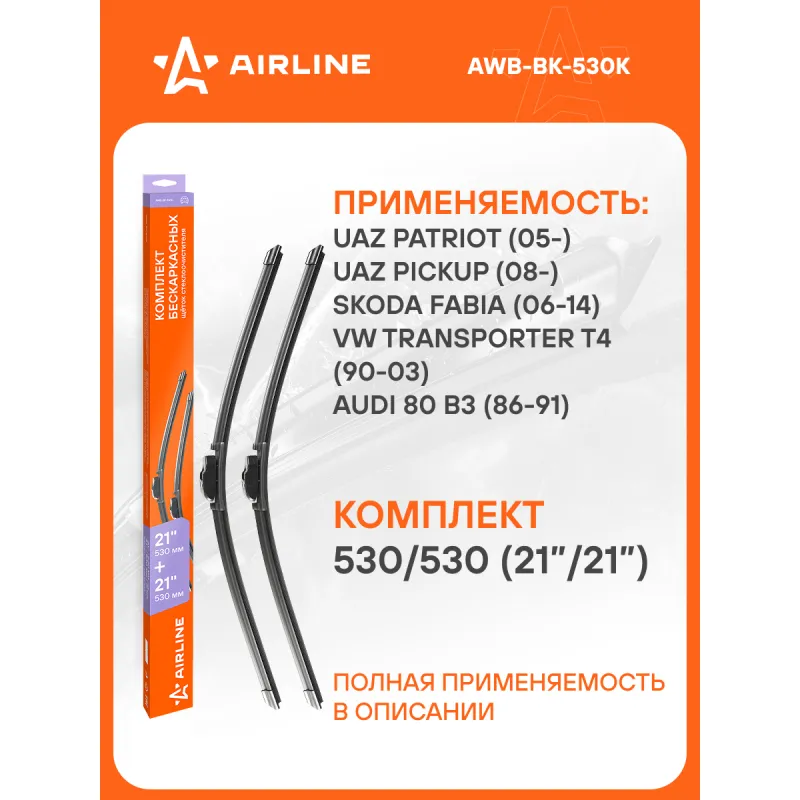 Щетки стеклоочистителя 530/530мм (21"/21") бескаркасные для а/м УАЗ Патриот (05-)/PickUp (08-), Skoda Fabia (06-14), Volkswagen Transporter T4 (90-03), Audi 80 B3 (86-91), комплект, 2 типа адаптера Описание: Щетка стеклоочистителя AIRLINE AWB-BK-530K с бескаркасной конструкцией обладает рядом существенных преимуществ. К ним стоит отнести максимальную плотность прилегания щеток к стеклу, отличное аэродинамическое сопротивление, обеспечивающее бесшумное и быстрое скольжение изделия. За счет плотного прилегания к стеклу щетки способны очищать даже самые труднодоступные загрязнения. Особый состав резины препятствует старению и износу изделия. Применяемость: ALFA ROMEO 164, ALPINA B6, AUDI 100, 200, 80, 90, A4, COUPE, TT, BMW Z8, Z4, CHEVROLET CORVETTE, CHRYSLER 300C, CITROEN JUMPER, FIAT DUCATO, FORD EXPLORER, HONDA SHUTTLE, JAGUAR XK, JEEP GRAND CHEROKEE, PATRIOT, KIA BONGO, LAND ROVER DISCOVERY, NISSAN MAXIMA, SAAB 9-3, SKODA FABIA, ROOMSTER, SUPERB, SMART CABRIO, CITY-COUPE, FORTWO, TOYOTA HIACE, UAZ PATRIOT, PICKUP, VOLVO C70, S70, S90, V70, VW BEETLE, T4, NEW BEETLE, PASSAT, ZAZ 1103 SLAVUTA.. Если у вас есть вопросы по применяемости, мы всегда готовы помочь вам с подбором по VIN-НОМЕРУ ВАШЕГО АВТОМОБИЛЯ. Преимущества щетки AIRLINE AWB-BK-530K -Материал щетки - долговечная искусственная резина; -Адаптеры произведены из специального технического пластика, от -40 до +60; -Бесшумная работа бескаркасной щетки стеклоочистителя; -Равномерный прижим щетки к поверхности стекла; Мы гарантируем качество и надежность наших товаров. Комплект подходит для следующих автомобилей: «AUDI» A4 98-01 A4 Avant 98-01 RS4 00-01 S4 98-00 S4 Avant 97-01 TT Coupe 98-06 TT Roadster 99-06 ______________________________ «BMW» Z4 02-16 ______________________________ «Chevrolet» Corvette 04- ______________________________ «Chrysler» 300C 04- 300C Touring 04-10 ______________________________ «Citroen» Jumper 94-02 ______________________________ «Fiat» Ducato 94-02 ______________________________ «Ford» Explorer 05-10 ______________________________ «Honda» Shuttle 95-01 ______________________________ «Jaguar» F-Type 12- XK Convertible 99-09 XK Coupe 99-09 XK 06-14 ______________________________ «Jeep» Grand Cherokee 00- Liberty 06- Patriot 06- ______________________________ «Land Rover» Discovery 98-04 ______________________________ «Nissan» Maxima 94-00 ______________________________ «SAAB» 9-3 Cabriolet 98-03 9-3 Coupe 98-03 ______________________________ «Skoda» Fabia 06-14 Fabia Combi 06-14 Praktik 07- Roomster 06-15 Superb 01-04 ______________________________ «Smart» Fortwo 04-07 Fortwo Cabrio 04-07 Smart Cabrio 00-04 Smart Coupe 98-04 ______________________________ «Toyota» Hiace 96- ______________________________ «UAZ» Patriot 05- Pickup 08- ______________________________ «Volkswagen» Beetle 11-16 California 90-03 Caravelle 90-03 Eurovan 92-00 Multivan 90-03 New Beetle 98-10 New Beetle Cabriolet 03-10 Passat 00-05 Passat Variant 94-05 Transporter 90-03 ______________________________ «Volvo» C70 Coupe 97-02 C70 Cabrio 98-06 S70 97-00 V70 97-00 Характеристики: Артикул: AWB-BK-530K OEM номера: 3A1 998 003, 6423.05, 6423.06, 98350-2C000, 2115-5205070, 2115-5205070-01, 2115-5205070-03, 2115-5205070-04, BE5H-67-330, BJ0E-67-330, BP4K-67-330, BP4K-67-330A, 8250A116, 8250A174, 8250A254, 28890-AX700, KE288-89931-BB, KE288-89935-BB, KE288-89950-AG, 996.628.90100, 996.628.90101, 997.628.9019A, 9529488, 85222-01011, 85222-0K031, 85222-33090, 85222-36041, 85222-AA030, 1J0 998 002 A, 1J0 998 003, 357955425, 357 998 001 A, 3B0 998 002 A, 3B0 998 002 B, 3U0 998 002, 3U1 998 001, 4G1 955 425 A, 5C1 955 425, 5J1 998 001, 5N1 955 426, 8F1 955 426 A, 8J1 955 426 A, 8N1 955 425 E, 3412197, 1392219, 96320725, 9169319, 9169320, 3447639, 34473959 Размер водительской щетки, мм: 530 Размер пассажирской щетки, мм: 530 Размер водительской щетки, дюйм: 21 Размер пассажирской щетки, дюйм: 21 Тип: Бескаркасная Кол-во адаптеров, шт: 2 Адаптер крепления 1: Hook 9x3, 9x4 mm - Крючок 9x3, 9x4 мм (U) Адаптер крепления 2: Push Button 19 mm - Кнопка 19 мм (C) Комплектация: Щетка стеклоочистителя - 1 шт Адаптеры - 4 шт Картонная коробка - 1 шт Гарантия: от 1 года.