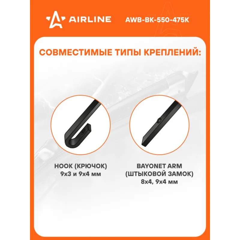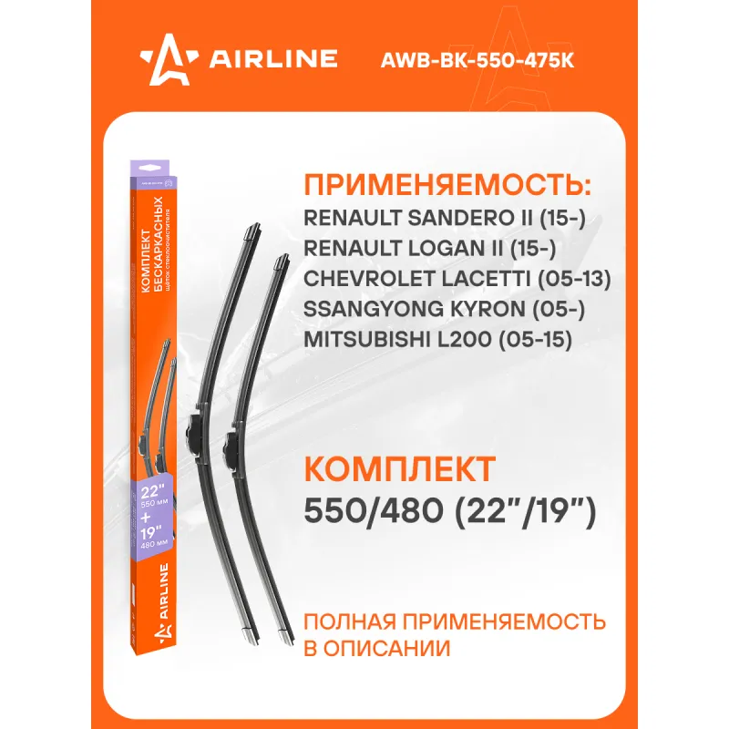 Щетки стеклоочистителя 550/480мм (22"/19") бескаркасные для а/м Renault Logan II (15-)/Sandero II (15-), Chevrolet Lacetti (05-13), SsangYong Kyron (05-), Mitsubishi L200 (05-15), комплект, 2 типа адаптеров Описание: Щетка стеклоочистителя AIRLINE AWB-BK-550-475K с бескаркасной конструкцией обладает рядом существенных преимуществ. К ним стоит отнести максимальную плотность прилегания щеток к стеклу, отличное аэродинамическое сопротивление, обеспечивающее бесшумное и быстрое скольжение изделия. За счет плотного прилегания к стеклу щетки способны очищать даже самые труднодоступные загрязнения. Особый состав резины препятствует старению и износу изделия. Применяемость: ALFA ROMEO 145, 146, CADILLAC ATS, CTS, DTS, CHEVROLET LACETTI, MALIBU, NUBIRA, CHRYSLER NEON, DAEWOO GENTRA, LEGANZA, LACETTI, NUBIRA, FIAT BRAVA, BRAVO, MAREA, FORD FOCUS, COUGAR, GREAT WALL WINGLE, HONDA ACCORD, LEGEND, ISUZU D-MAX, JAGUAR X-TYPE, LEXUS IS, MAZDA 6, MERCEDES-BENZ GLK, MITSUBISHI L 200, OUTLANDER, NISSAN GT-R, RAVON GENTRA, RENAULT LOGAN / STEPWAY, LOGAN, SANDERO / STEPWAY, SSANGYONG ACTYON, KYRON, SUZUKI LIANA, TOYOTA HIGHLANDER / KLUGER, MARK.. Если у вас есть вопросы по применяемости, мы всегда готовы помочь вам с подбором по VIN-НОМЕРУ ВАШЕГО АВТОМОБИЛЯ. Преимущества щетки AIRLINE AWB-BK-550-475K -Материал щетки - долговечная искусственная резина; -Адаптеры произведены из специального технического пластика, от -40 до +60; -Бесшумная работа бескаркасной щетки стеклоочистителя; -Равномерный прижим щетки к поверхности стекла; Мы гарантируем качество и надежность наших товаров. Комплект подходит для следующих автомобилей: «Alfa Romeo» 145 99-00 146 99-00 ______________________________ «Cadillac» CTS 07- ______________________________ «Chevrolet» Lacetti 05-13 Nubira 05- Nubira Station Wagon 05- ______________________________ «Chrysler» Neon 99-05 ______________________________ «Daewoo» Gentra 05- Leganza 97-04 ______________________________ «Fiat» Brava 95-01 Bravo 95-01 Marea 96-02 Marengo 97-02 ______________________________ «Ford» Cougar 98-00 Focus 98-05 Focus Turnier 98-05 ______________________________ «Great Wall» Wingle 06- ______________________________ «Honda» Accord 98-03 Legend 04-10 ______________________________ «Jaguar» X-Type 01-09 X-Type Estate 03-05 ______________________________ «Jeep» Renegate 14- ______________________________ «Lexus» IS 99-05 IS Wagon 01-05 ______________________________ «Mazda» 6 Fastback 02-07 6 02-07 6 Wagon 02-07 ______________________________ «Mercedes-Benz» GLK-Class 14- ______________________________ «Mitsubishi» Outlander 03-06 ______________________________ «Nissan» GT-R 09- ______________________________ «Ravon» Gentra 15- ______________________________ «Renault» Logan MCV 15- Sandero 15- Symbol 13- ______________________________ «SsangYong» Actyon Sports 12- Kyron 05- ______________________________ «Suzuki» Liana Hatchback 01-08 Liana Sedan 02-07 ______________________________ «Toyota» Highlander 01-06 Характеристики: Артикул: AWB-BK-550-475K OEM номера: 61 61 2 158 219, 61 61 2 159 627, 61 61 2 241 375, 61610034739, 6161 0 431 438, 68194 931AA, 6426.JG, 6426.JH, 60594597, 71804095, 71804099, 71804096, 80233200, 2 123 377, 1714325, 89FG17528C2A, YL8X17528DA, YL8X17528EA, 86VB17528A1B, 1680479, 1680507, 1537075, 1545441, 1202188, 3M51S17528AA, 1850548, 1537084, 6153467, 1694736, 1537074, 76620-SM4-G01, 76630-SM4-A01, 76630-TE0-A01, 76630-TE0-A011M2, BBP3-67-330, GJ84-67-330, HE22-67-330, FB02-67-330, G226-67-330, G226-67-330A, BE8T-67-330, BP4L-67-330, BP4L-67-330A, BP4L-67-330B, A 204 820 38 00, 000 820 91 45, 000 820 96 45, 001 820 05 45, 001 820 06 45, A 000 820 91 45, A 000 820 96 45, A 001 820 05 45, A 001 820 06 45, 176 820 28 00, A 176 820 28 00, 8250A114, MZ690107, 8250A094, 8250A098, 8250A203, MN181335, 28890-5X11A, 28895-5X11B, KE288-89927-AG, 28890-ED500, KE288-89935-AG, 28800-5DF1A, 28880-5DF0A, 12 72 208, 12 72 791, 62 72 206, 62 72 241, 62 72 244, 62 72 246, 62 72 302, 62 72 303, 6272267, 6272257, 12 72 326, 12 72 329, 62 72 255, 62 72 279, 62 72 280, 62 72 293, 6426.R8, 928.628.90101, 28890-2078R, 28 89 054 01R, 28 89 071 77R, 287900001R, 7711 170 142, 28 89 004 64R, 7711 170 144, 28 88 175 28R, 28 89 032 11R, 28 89 058 11R, 7701 410 008, 7701 423 034, 7701 423 212, 7701 423 214, 86542-AJ060, 86542-SA030, 86542-AE020, 38340-65DP0, 38340-65J01, 38340-65J11, 85212-20390, 85212-20400, 85222-20370, 85222-30580, 85222-3H080, 85212-0G010, 85212-53050, 85212-42110, 85212-53070, 85222-48140, 85222-48160, 85222-53070, 85222-53071, 98350-38000, 98360-38000, 98350-17000, 98350-1G000, 98350-26000, 98350-28030, 98360-28930, 0K201-67-330A, 0K9A1-67-330A, 1H0 955 425 C, 1J0 998 002 B, 1J0 998 003, 6K1 955 425 B, 6K1 955 425 C, 6N0 955 425, 1Z1955425A, 1K1955426, 1K1955425, 1K0998002A, 3AB998002, 3AB955426, 3AB955425, 1Z1998001, 1Z1955426A, 1Z1955426, 8P1 955 426 A, 8P1 955 426 F, 8P1 955 426 H, 8P1955425A, 5C7955426A, 3C1998002, 1Q1 955 426 A, 1Q1 998 002, 1Z1 955 425, 1Z1 955 426 B, 3B0 998 002 A, 5C7 955 425 A, 6N0 955 425 A, 6N0 998 002, 2D0 955 425, 2D0 955 425 A, 4B1 955 425 C, 