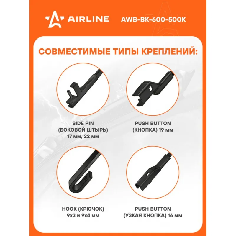 Щетки стеклоочистителя 600/500мм (24"/20") бескаркасные для а/м Toyota Camry (06-14), Great Wall Hovaer (05-10), Kia Sorento II (09-17)/Soul (14-18), Hyundai Starex (07-), Changan UNI-K (20-) Audi Q5 (08-17), комплект, 4 типа адаптеров Описание: Щетка стеклоочистителя AIRLINE AWB-BK-600-500K с бескаркасной конструкцией обладает рядом существенных преимуществ. К ним стоит отнести максимальную плотность прилегания щеток к стеклу, отличное аэродинамическое сопротивление, обеспечивающее бесшумное и быстрое скольжение изделия. За счет плотного прилегания к стеклу щетки способны очищать даже самые труднодоступные загрязнения. Особый состав резины препятствует старению и износу изделия. Применяемость: ASTON MARTIN DBS, AUDI Q3, A5, A4, Q5, BMW X5, X6, BRILLIANCE V5, CADILLAC XT5, CHANGAN UNI-K, FORD WINDSTAR, MUSTANG, TAURUS, FIVE HUNDRED, FREESTYLE, GREAT WALL HOVER, HYUNDAI H-1, GRANDEUR, iX55, SONATA, INFINITI QX, KIA SOUL, SORENTO, QUORIS, CERATO, MOHAVE, LAND ROVER RANGE ROVER, RANGE ROVER SPORT, LEXUS SC, GS, LINCOLN TOWN CAR, CONTINENTAL, MITSUBISHI ECLIPSE CROSS, PORSCHE MACAN, RENAULT LAGUNA, SUZUKI KIZASHI, TOYOTA CAMRY, 4 RUNNER, VOLVO XC40, ZOTYE T600.. Если у вас есть вопросы по применяемости, мы всегда готовы помочь вам с подбором по VIN-НОМЕРУ ВАШЕГО АВТОМОБИЛЯ. Преимущества щетки AIRLINE AWB-BK-600-500K -Материал щетки - долговечная искусственная резина; -Адаптеры произведены из специального технического пластика, от -40 до +60; -Бесшумная работа бескаркасной щетки стеклоочистителя; -Равномерный прижим щетки к поверхности стекла; Мы гарантируем качество и надежность наших товаров. Комплект подходит для следующих автомобилей: «Aston Martin» DBS 07-12 ______________________________ «AUDI» A4 07- A4 Allroad 09- A4 Avant 08- A5 Coupe 07-17 A5 Sportback 09-17 A6 Avant 18- Q5 08- R8 04.7-15 RS4 12-15 RS4 17- RS5 10-15 RS5 17- RSQ3 13- S4 08- S4 Avant 09-15 S4 Avant 16- S5 Coupe 16- S5 Coupe 07-17 S5 Sportback 10-17 SQ5 12-17 ______________________________ «BMW» X5 06-18 X6 08-11 ______________________________ «Cadillac» XT5 16- ______________________________ «Ford» Five Hundred 04-05 Freestyle 04-06 Taurus 99-06 Taurus Wagon 99-05 Windstar 94-03 ______________________________ «Great Wall» Hover 05-10 ______________________________ «Hyundai» Azera 06-11 Genesis 08-14 Starex 07- H-1 08- ix55 08- NF 04-10 Sonata 04-10 Veracruz 06- ______________________________ «Infiniti» QX 03-14 ______________________________ «Kia» Cerato Koup 10- Cerato Sedan 09- Mohave 09- Quoris 12- Sorento 09- Soul 08- ______________________________ «Land Rover» Discovery 17- Freelander 06-14 Range Rover 13- Range Rover Sport 13- ______________________________ «Lexus» GS 97-05 SC 01-10 ______________________________ «Mercury» Montego 05-06 ______________________________ «Opel» Insignia Grand Sport 17- Insignia Sports Tourer 17- ______________________________ «Porsche» Macan 14- ______________________________ «Renault» Laguna 01-07 Laguna Grandtour 01-07 Laguna Hatchback 01-07 ______________________________ «Suzuki» Kizashi 10-14 ______________________________ «Toyota» 4Runner 09- Camry 06-11 ______________________________ «Volvo» V60 18- XC40 17- XC90 14- Характеристики: Артикул: AWB-BK-600-500K OEM номера: 61 61 2 158 219, 61 61 2 159 627, 61 61 2 241 375, 61 61 7 004 901, 61 60 7194 230, 61 60 7 194 231, 61 61 2 183 576, 61610039697, 61610038893, 6161 0 431 438, 61610034739, 68194 930AA, 6423 02, 85222-53060, 80233300, 71804093, 6E5317B437AA, 2T1A17528CA, 4U7J17528CA, 83BG17528A1A, YS4J17528AA, YS4J17528BA, 6122489, 1 537 086, 1 554 028, AM5J S17528-AA, YS7J17528CA, 1953852, 1953853, 1545441, 1730302, 1953851, 76620-SM4-A01, 2110-5205070, 21100-5205070-02, 28890-7150R, 11185205072, 111805205072, CA06-67-330, GA5R-67-330A, GA5S-67-330, GA7D-67-330, GS1M-67330, HE21-67-330, GS1D67330, KD3567330, HE76-67-330, TA02-67-330A, BBP267330, BHS267330, DD1067330, DF7167330, 176 820 28 00, A 176 820 28 00, A2048201145, 204 820 1145, 8250A097, 8250A173, 8250A218, 8250A246, 8250A253, 8250A010, MZ690100, MR 300302, MZ 690431, 8250A011, 8250A204, 8250A217, MR300877, MR361327, MR522387, 28890-5X10A, 28800-5DF1A, 28880-5DF0A, 28891-CD806, 288909U100, 28890JR80A, 28891ES60A, 28891JG400, 288955X10B, 28890JD900C, 28890 JD900, 12 72 033, 12 72 037, 12 72 736, 62 72 271, 62 72 296, 62 72 240, 1272 338, 1272346, 6272257, 6272267, 6423.08, 6423.04, 6426.CJ, 6426.R2, 6426.WH, 6423 01, 95B 998 001, 288901158R, 28 89 028 88R, 28 89 063 16R, 28 89 093 07R, 7701 410 020, 7701 423 033, 82 01 059 024, 86542-AJ010, 86542-AE050, 86542AG120, 86542AG22A, 86542FG010, 86542FG100, 86542FG110, 86542FG330, 86542SC100, 86542SC110, 38340-57L20, 38340-57L30, 3834057L00, 3834057L10, 85212-42110, 85212-52170, 85222-33250, 85222-52100, 85222-52180, 85212-53080, 852220G010, 8522242110, 85222AA070, 85222YZZBE, 85212-53081, 85212-YZZAR, 8521230410, 8521250100, 8522202130, 8522202220, 31457760, 31457755, 31333381, 30863702, 30699635, 7831534000, 7831534010, 98350-22020, 98350-28921, 98360-26000, 98360-38000, 98360-3K000, 98360-4A500, 983501J200, 983502B010, 983502E010, 983502H050, 983503K100, 