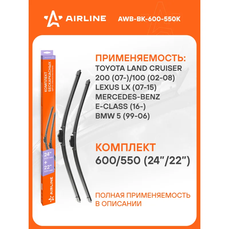 Щетки стеклоочистителя 600/550мм (24"/22") бескаркасные для а/м Toyota Land Cruiser 200 (07-)/100 (02-08), Lexus LX (07-15), Mercedes-Benz E-Class (16-), BMW 5 (99-06), Zeekr 001 (21-), комплект, 4 типа адаптеров Описание: Щетка стеклоочистителя AIRLINE AWB-BK-600-550K с бескаркасной конструкцией обладает рядом существенных преимуществ. К ним стоит отнести максимальную плотность прилегания щеток к стеклу, отличное аэродинамическое сопротивление, обеспечивающее бесшумное и быстрое скольжение изделия. За счет плотного прилегания к стеклу щетки способны очищать даже самые труднодоступные загрязнения. Особый состав резины препятствует старению и износу изделия. Применяемость: BMW X5, CHEVROLET UPLANDER, CHRYSLER SEBRING, VISION, CONCORDE, 300M, DODGE INTREPID, AVENGER, FIAT MULTIPLA, HONDA ACCORD, HONDA (GAC) ODYSSEY, LEXUS LX, MERCEDES-BENZ C-Class, GLB, E-Class, CLS, AMG GT, OPEL MERIVA, PEUGEOT 406, TOYOTA LAND CRUISER, HARRIER, VOLVO S80, XC90, S60, XC70.. Если у вас есть вопросы по применяемости, мы всегда готовы помочь вам с подбором по VIN-НОМЕРУ ВАШЕГО АВТОМОБИЛЯ. Преимущества щетки AIRLINE AWB-BK-600-550K -Материал щетки - долговечная искусственная резина; -Адаптеры произведены из специального технического пластика, от -40 до +60; -Бесшумная работа бескаркасной щетки стеклоочистителя; -Равномерный прижим щетки к поверхности стекла; Мы гарантируем качество и надежность наших товаров. Комплект подходит для следующих автомобилей: «BMW» X5 99-06 ______________________________ «Chevrolet» Tahoe 08-14 ______________________________ «Chrysler» 300M 98-04 Concorde 97-04 Sebring 07-10 ______________________________ «Dodge» Avenger 07- Intrapid 97-04 ______________________________ «Honda» Accord 08- Accord Tourer 08- ______________________________ «Lexus» LX 98- ______________________________ «Mercedes-Benz» CLS-Class 17- E-Class 16- E-Class Cabrio 17- E-Class Coupe 16- E-Class T-Model 16- ______________________________ «Opel» Meriva 03-10 ______________________________ «Toyota» Land Cruiser 02-08 ______________________________ «Volkswagen» LT 96-06 Multivan 09-13 Характеристики: Артикул: AWB-BK-600-550K OEM номера: 61 61 0 032 743, 61 61 2 158 219, 61 61 2 159 627, 61 61 2 241 375, 61610039697, 61610034739, 61610038893, 6161 0 431 438, 68194 931AA, 6423 02, 71804096, 80233200, 6E5317B437AA, 86VB17528A1B, 1202188, 1148288, 1545441, 6153467, 1730302, 1 554 028, 1 537 086, AM5J S17528-AA, 76620-SM4-A01, 76620-SM4-G01, 111805205072, 11185205072, FB02-67-330, G226-67-330, G226-67-330A, BBP267330, BHS267330, DD1067330, DF7167330, GS1D67330, KD3567330, 176 820 28 00, A 176 820 28 00, 000 820 91 45, 000 820 96 45, 001 820 05 45, 001 820 06 45, A 000 820 91 45, A 000 820 96 45, A 001 820 05 45, A 001 820 06 45, 204 820 1145, A2048201145, 8250A097, 8250A173, 8250A218, 8250A246, 8250A253, 8250A094, 8250A098, 8250A203, MN181335, MR 300302, MZ 690431, 28890-5X10A, 28800-5DF1A, 28880-5DF0A, 28890-ED500, KE288-89935-AG, 288955X10B, 28891JG400, 28891ES60A, 28890 JD900, 28890JD900C, 28890JR80A, 288909U100, 12 72 033, 12 72 037, 12 72 736, 62 72 271, 62 72 296, 12 72 326, 62 72 303, 6272257, 1272346, 1272 338, 6272267, 12 72 329, 62 72 255, 62 72 279, 62 72 280, 62 72 293, 62 72 302, 6423.08, 6426.R8, 6423 01, 7701 410 008, 7701 423 034, 7701 423 212, 7701 423 214, 7711 170 144, 28 89 054 01R, 86542-AJ010, 86542-AE020, 86542FG110, 86542FG100, 86542FG010, 86542AG22A, 86542AG120, 86542FG330, 86542SC100, 86542SC110, 3834057L00, 3834057L10, 85212-42110, 85212-52170, 85222-33250, 85222-52100, 85222-52180, 85212-0G010, 8521230410, 8522242110, 852220G010, 8522202220, 8522202130, 8521250100, 85222AA070, 85212-53070, 85222-48140, 85222-48160, 85222-53070, 85222-53071, 85222YZZBE, 322 378 99, 7831534000, 7831534010, 98350-17000, 98350-1G000, 98350-26000, 98350-38000, 983501J200, 983502B010, 983502E010, 983501J000, 983503K100, 983502H050, 983502L000, 983503J003, 98350-1H300, 98350-1J920, 98350-2B910, S98350-2B010, 1Q1 998 002, 1Z1 955 425, 1Z1 955 425 B, 3T1 998 001, 5C7 955 425 A, 5JB 955 425, 1Q1955425A, 1K1955426, 1K1955425, 3AB955425, 3AB955426, 1K0998002A, 2K0998002A, 1Z1998001, 1Z1955426A, 1Z1955426, 1Z1955425A, 1T1998002, 8P1955425A, 5N1955425, 5C7955426A, 3C1998002, 3AB998002, 7H1955425F, 6R1955425A, 7H1955426, 6R1955426A, 6R1998002, 7E1998002, 7H5998002, 8X1 955 425, 8X1 955 426, 2D0 955 425, 2D0 955 425 A, 4B1 955 425 C, 8J1 955 425 A, 7H5 955 425, 7H5 955 425 B, 8P1 955 425 F, 8P1 955 425 H, 8P1 955 426 A, 8T1 955 425 A, 93183143, 96342895, 95508195, 96498678, 13227404, 9195562, 96262505, 96910777, 95211013, 96830172, 93171135, 15890062, 93187384, 95980789, 96688383, 96474963, 93178171, 15890063, 93187194, 95161605, 85222-33240, 85212-48130, 85212-48150, 8522233241, 8522250080 Размер водительской щетки, мм: 600 Размер пассажирской щетки, мм: 550 Размер водительской щетки, дюйм: 24 Размер пассажирской щетки, дюйм: 22 Тип: Бескаркасная Кол-во адаптеров, шт: 4 Адаптер крепления 1: Hook 9x3, 9x4 mm - Крючо