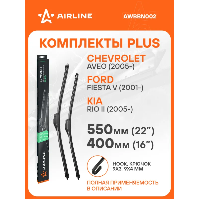 Щетки стеклоочистителя комплект (2 шт) 550/400мм (22"/16") бескаркасные PLUS с креплением "Крючок 9x3, 9x4 мм" Описание: Модельные бескаркасные щётки стеклоочистителя AIRLINE серии PLUS с креплением крючок 9х3, 9х4 мм — это результат современных инженерных решений, направленных на обеспечение высокой эффективности очистки лобового стекла в любых погодных условиях. Они оснащены универсальным креплением Hook 9x3, 9x4 мм, что делает их совместимыми с широким спектром автомобилей без необходимости использования дополнительных адаптеров. Конструкция бескаркасных щёток обеспечивает равномерное распределение давления по всей длине резинового элемента, что позволяет добиться идеального прилегания к стеклу и качественной очистки без разводов. Используемые материалы обладают высокой устойчивостью к износу, ультрафиолету и перепадам температур, что гарантирует длительный срок службы щёток. Улучшенная аэродинамическая форма щёток снижает шум и вибрации во время работы, обеспечивая тихую и плавную очистку даже на высоких скоростях. Надёжная фиксация и простота установки делают эти щётки удобным выбором для водителей, ценящих комфорт и функциональность. С модельными бескаркасными щётками стеклоочистителя AIRLINE серии PLUS каждая поездка будет проходить с максимальным комфортом и безопасностью, независимо от погодных условий. Характеристики: Артикул: AWBBN002 OEM номера: 5899108, 71804097, 2S6J17528AC, 2S6J17528BA, 1712815, A780X17528AHA, 76630-SWA-A01, 1118-5205070, 11180-5205070, B467-67-330, DB02-67-330, DB10-67-330, DD14-67-330, G307-67-330, MB542222, MBZ0427009, 2889095F0C, 2889095F0D, 28890-ED500, 28890-EW710, KE288-89925-AF, KE288-89935-AG, KE288-89950-AG, 28790-05R00, 28890-2Y91C, 28890-C7160, 28890-JG410, 12 72 789, 6426.XX, 993.628.03800, 993.628.03801, 993.628.90100, 7701 017 267, 7701 401 978, 86542-FG060, 86542-FG150, 86542-FG160, 86542-FG380, 85212-02141, 85212-02161, 85212-02210, 85212-05081, 85212-28170, 85212-47030, 85212-60032, 85222-28160, 85222-28180, 85242-22090, 1312255, 96898048, 98350-1G000, 98360-2F000, 98360-17000, 98360-1J000, 98360-1J200, 98360-1J920, 98360-2E000, 98360-3Z000, 98360-2V500, 98360-2V600, KS9 554 005 3, 95980789, 95980791, 96380628, 96830174 Размер водительской щетки, мм: 550 Размер пассажирской щетки, мм: 400 Адаптер крепления: Hook 9x3, 9x4 mm - Крючок 9x3, 9x4 мм Размер водительской щетки, дюйм: 22 Размер пассажирской щетки, дюйм: 16 Тип: Бескаркасная Комплектация: Щетка стеклоочистителя - 2 шт Картонная коробка - 1 шт Пластиковая подложка - 1 шт Гарантия: от 1 года.