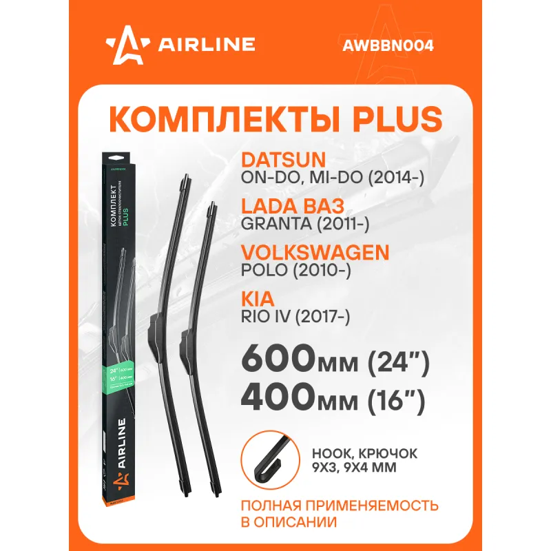 Щетки стеклоочистителя комплект (2 шт) 600/400мм (24"/16") бескаркасные PLUS с креплением "Крючок 9x3, 9x4 мм" Описание: Модельные бескаркасные щётки стеклоочистителя AIRLINE серии PLUS с креплением крючок 9х3, 9х4 мм — это результат современных инженерных решений, направленных на обеспечение высокой эффективности очистки лобового стекла в любых погодных условиях. Они оснащены универсальным креплением Hook 9x3, 9x4 мм, что делает их совместимыми с широким спектром автомобилей без необходимости использования дополнительных адаптеров. Конструкция бескаркасных щёток обеспечивает равномерное распределение давления по всей длине резинового элемента, что позволяет добиться идеального прилегания к стеклу и качественной очистки без разводов. Используемые материалы обладают высокой устойчивостью к износу, ультрафиолету и перепадам температур, что гарантирует длительный срок службы щёток. Улучшенная аэродинамическая форма щёток снижает шум и вибрации во время работы, обеспечивая тихую и плавную очистку даже на высоких скоростях. Надёжная фиксация и простота установки делают эти щётки удобным выбором для водителей, ценящих комфорт и функциональность. С модельными бескаркасными щётками стеклоочистителя AIRLINE серии PLUS каждая поездка будет проходить с максимальным комфортом и безопасностью, независимо от погодных условий. Характеристики: Артикул: AWBBN004 OEM номера: 6423 02, 71802636, 6E5317B437AA, 1 554 028, 111805205072, 11185205072, GS1E-67-330, GSFB673309K, DF7167330, KD3567330, DD1067330, BHS267330, BBP267330, GS1D67330, 8250A097, 8250A173, 8250A218, 8250A246, 8250A253, MZ 690431, 28890-JG410, KE28889925AG, KE28889960AG, 28890-5X10A, 288909U100, 28890JR80A, 288955X10B, 28891JG400, 28891ES60A, 28890ES61A, 12 72 037, 12 72 736, 62 72 271, 62 72 296, 1272 338, 6423 01, 86542AG120, 86542AG22A, 86542FG010, 86542FG100, 86542FG110, 86542FG330, 86542SC100, 86542SC110, 3834057L00, 3834057L10, 85212-05081, 85212YZZAC, 85212YZZCR, 8522205120, 85212-02161, 8521212371, 8521250100, 8522202130, 8522202220, 852220G010, 85222-52100, 85222-52180, 85222YZZBE, 85222AA070, 8522242110, 8521230410, 85212YZZAW, 85212YZZCQ, 85212-42120, 85212YZZAF, 85212-52170, 85222-33250, 8521213031, 8522202120, 8522202170, 8522205090, 85222-44070, 85212YZZAM, 7831534000, 7831534010, 7832534000, 7832534010, 98350 C8000, 98360 1S000, 983502S000, 983502S010, 983502Y000, 983602S000, 983502B010, 983501J200, 983501J000, 983602Y000, 98360H5000, 984000, 983503K100, 983502H050, 983502E010, 0K201-67-330A, 0K9A167330, 983501F010, 983501F060, 983601F000, 983601F050, 98350-1H300, 98350-1J920, 98350-2B910, S98350-2B010, 6RG 955 425 A, 6RU 955 425 C, 7H1955426, 7H1955425F, 13227404, 9195562, 93178171, 93187194, 95161605, 96262505, 96830172, 96910777, 288905PA0A, 288905PA0B, 8522233200, 85222-33240, 8522250080, 8522233241, 5205142XS56XA, B5205220, B5205320 Размер водительской щетки, мм: 600 Размер пассажирской щетки, мм: 400 Адаптер крепления: Hook 9x3, 9x4 mm - Крючок 9x3, 9x4 мм Размер водительской щетки, дюйм: 24 Размер пассажирской щетки, дюйм: 16 Тип: Бескаркасная Комплектация: Щетка стеклоочистителя - 2 шт Картонная коробка - 1 шт Пластиковая подложка - 1 шт Гарантия: от 1 года.