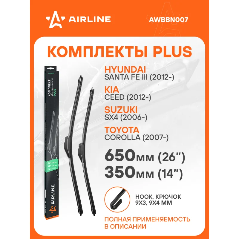 Щетки стеклоочистителя комплект (2 шт) 650/350мм (26"/14") бескаркасные PLUS с креплением "Крючок 9x3, 9x4 мм" Описание: Модельные бескаркасные щётки стеклоочистителя AIRLINE серии PLUS с креплением крючок 9х3, 9х4 мм — это результат современных инженерных решений, направленных на обеспечение высокой эффективности очистки лобового стекла в любых погодных условиях. Они оснащены универсальным креплением Hook 9x3, 9x4 мм, что делает их совместимыми с широким спектром автомобилей без необходимости использования дополнительных адаптеров. Конструкция бескаркасных щёток обеспечивает равномерное распределение давления по всей длине резинового элемента, что позволяет добиться идеального прилегания к стеклу и качественной очистки без разводов. Используемые материалы обладают высокой устойчивостью к износу, ультрафиолету и перепадам температур, что гарантирует длительный срок службы щёток. Улучшенная аэродинамическая форма щёток снижает шум и вибрации во время работы, обеспечивая тихую и плавную очистку даже на высоких скоростях. Надёжная фиксация и простота установки делают эти щётки удобным выбором для водителей, ценящих комфорт и функциональность. С модельными бескаркасными щётками стеклоочистителя AIRLINE серии PLUS каждая поездка будет проходить с максимальным комфортом и безопасностью, независимо от погодных условий. Характеристики: Артикул: AWBBN007 OEM номера: 71742607, 71742609, 71803482, 76620-SEA-G01, 76620-SEA-G11, 76620-SWA-G11, 76620-SZTA-G01-0M1, 76620-TE0-A01, 76620-TF0-0041, 76620-TF0-G01, 76620-TF0-G01-1M1, 8250A104, 8250A184, 8250A255, 28890-AU310, 28890-EM30B, 28890-JN00B, 28891-3Y61B, AY00D-UJ32R, 6424.CK, E429015, 38340-61M00, 38340-79J00, 38340-80J50, 38340-80J51, 85212-12450, 85212-48140, 85212-68050, 85212-76010, 85222-12840, 85222-12890, 85222-48080, 85222-75010, 85222-75011, 85291-44090, 98350-2V600, 98350-2W100, 98350-3R200, 98350-3Z000, 98350-A5900, 98350-2V500, 98350-2W910, 98350-A2000, 85222-48100, 85222-52170, 85222-76010 Размер водительской щетки, мм: 650 Размер пассажирской щетки, мм: 350 Адаптер крепления: Hook 9x3, 9x4 mm - Крючок 9x3, 9x4 мм Размер водительской щетки, дюйм: 26 Размер пассажирской щетки, дюйм: 14 Тип: Бескаркасная Комплектация: Щетка стеклоочистителя - 2 шт Картонная коробка - 1 шт Пластиковая подложка - 1 шт Гарантия: от 1 года.