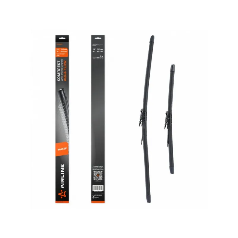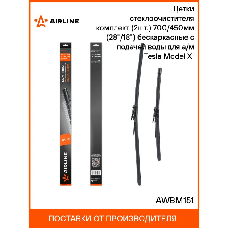Щетки стеклоочистителя комплект (2шт.) 700/450мм (28"/18") бескаркасные с подачей воды для а/м Tesla Model X (15-) Описание: Щетка стеклоочистителя AIRLINE AWBM151 с бескаркасной конструкцией обладает рядом существенных преимуществ идеально подходят для лобового стекла автомобиля, обеспечивая исключительно чистое и четкое видение дороги. Дворники для автомобиля оснащенные уникальной системой подачи воды, они равномерно распределяют жидкость по поверхности стекла, что способствует эффективному удалению грязи и обеспечивает безупречную видимость во время вождения. Максимальная плотность прилегания щеток к стеклу, что устраняет шум и вибрации при их работе, отличное аэродинамическое сопротивление, обеспечивающее бесшумное и быстрое скольжение изделия. За счет плотного прилегания к стеклу щетки способны очищать даже самые труднодоступные загрязнения. Особый состав резины препятствует старению и износу изделия. Применяемость: TESLA MODEL X.. Если у вас есть вопросы по применяемости, мы всегда готовы помочь вам с подбором по VIN-НОМЕРУ ВАШЕГО АВТОМОБИЛЯ. Преимущества щетки AIRLINE AWBM151 -Материал щетки - долговечная натуральная резина; -Адаптеры произведены из специального технического пластика, от -40 до +60; -Бесшумная работа бескаркасной щетки стеклоочистителя; -Равномерный прижим щетки к поверхности стекла; Мы гарантируем качество и надежность наших товаров. Характеристики: Артикул: AWBM151 OEM номера: 1034389-00-D, 1034390-00-B Адаптер крепления: Pinch Tab с подачей воды Размер водительской щетки, мм: 700 Размер пассажирской щетки, мм: 450 Размер водительской щетки, дюйм: 28 Размер пассажирской щетки, дюйм: 18 Тип: Бескаркасная Кол-во адаптеров, шт: 1 С подачей воды: Да С подогревом: Нет Комплектация: Щетка стеклоочистителя - 2 шт Адаптер - 2 шт Картонная упаковка - 1 шт Картонная подложка для щетки стеклоочистителя - 2 шт Гарантия: от 1 года.