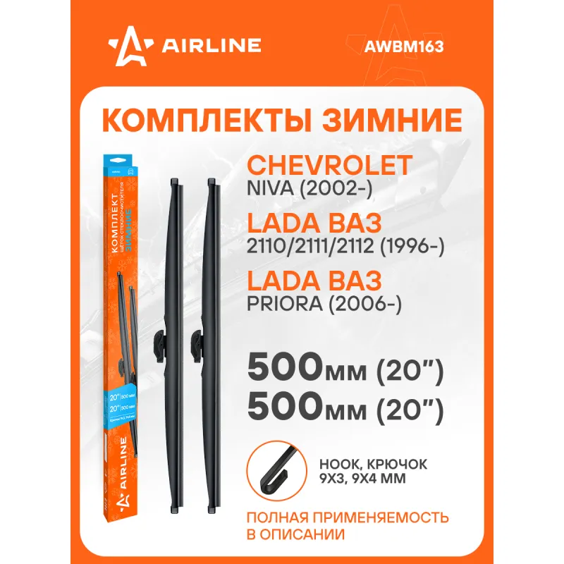 Щетки стеклоочистителя комплект 500/500мм (20"/20") зимние с креплением "Крючок 9x3, 9x4 мм", 2 штуки Описание: Модельные зимние щетки стеклоочистителя AIRLINE – это результат инновационных разработок, направленных на обеспечение безупречного видения дороги в любых зимних погодных условиях. Они специально разработаны для конкретных моделей авто, что позволяет достичь безупречного прилегания к лобовому стеклу и обеспечить высочайшую эффективность очистки даже при низких температурах и обильных осадках. Щетки изготовлены из премиальных материалов и специальной резины EPDM, которая отлично сохраняет свои свойства даже в агрессивно-химических условиях, таких как воздействие дорожных реагентов. Это обеспечивает долгий срок службы и высокую стойкость щеток к экстремальным зимним условиям. Уникальная конструкция щеток AIRLINE обеспечивает тихую и плавную работу, минимизируя шум и неприятные звуки, обеспечивая стабильную работу в любых зимних условиях. Простота установки этих щеток стеклоочистителя делает их идеальным выбором для водителей, которые ценят свое время и удобство. С модельными зимними щетками стеклоочистителя AIRLINE каждая зимняя поездка будет проходить с максимальным комфортом и безопасностью, независимо от погоды за окном. Характеристики: Артикул: AWBM163 OEM номера: 61 61 1 372 555, 0513952, 066348000, 6122489, 83BG17528A1A, 85BG 17528 A1A, YS4J17528BA, YS4J17528AA, 5897451, 5900224, 5907257, 5899251, 81 26440 0058, B481-67-330, HE21-67-330, HE76-67-330, 28890 40F05, 28890 44F00, 28890 13E22, 6426 66, 7701 410 020, 7701 423 033, 4381844, 4381851, 1369355, 607038, 675464, 60 70 38 00, 65 66 17 00 Размер водительской щетки, мм: 500 Размер пассажирской щетки, мм: 500 Адаптер крепления: Hook 9x3, 9x4 mm - Крючок 9x3, 9x4 мм Размер водительской щетки, дюйм: 20 Размер пассажирской щетки, дюйм: 20 Тип: Зимняя Комплектация: Щетка стеклоочистителя - 2 шт Адаптеры - 2 шт Картонная коробка - 1 шт Картонная подложка для щетки стеклоочистителя - 2 шт Гарантия: от 1 года.