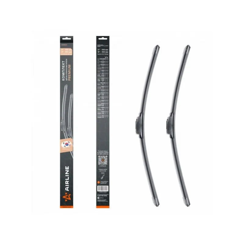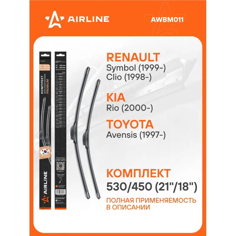 Щетки стеклоочистителя комплект 530/450мм (21"/18") бескаркасные PREMIUM с креплением "Крючок 9x3, 9x4 мм", 2 штуки Описание: Комплект модельных щеток стеклоочистителя PREMIUM с бескаркасной конструкцией AIRLINE AWBM011 530/450 мм - это результат инновационных разработок, направленных на обеспечение безупречного видения дороги в любых погодных условиях. Они специально разработаны для конкретных моделей авто, что позволяет достичь безупречного прилегания к лобовому стеклу и обеспечить высочайшую эффективность очистки. Использование премиальных материалов гарантирует долгий срок службы щеток, а также их стойкость к различным погодным условиям. Уникальная конструкция щеток AIRLINE обеспечивает тихую и плавную работу, минимизируя шум и неприятные звуки даже при высоких скоростях. Простота установки этих щеток стеклоочистителя делает их идеальным выбором для водителей, которые ценят свое время и удобство. Применяемость: CHRYSLER NEON, DAIHATSU TERIOS, KIA PREGIO, RIO, MAZDA 323, CX-3, MITSUBISHI L 200, SPACE STAR, NISSAN MICRA, PONTIAC VIBE, RENAULT CLIO, CLIO SYMBOL / THALIA, SEAT AROSA, INCA, SUBARU IMPREZA, JUSTY, SUZUKI IGNIS, SWIFT, TOYOTA AVENSIS, MATRIX, VW POLO.. Преимущества щетки AIRLINE AWBM011 - Материал щетки - долговечная натуральная резина; - Адаптеры произведены из специального технического пластика, от -40 до +60; - Адаптер - Hook 9x3, 9x4 mm - Крючок 9x3, 9x4 мм; - Бесшумная работа бескаркасной щетки стеклоочистителя; - Равномерный прижим щетки к поверхности стекла; Если у вас есть вопросы по применяемости, мы всегда готовы помочь вам с подбором по VIN-НОМЕРУ ВАШЕГО АВТОМОБИЛЯ. С модельными щетками стеклоочистителя AIRLINE каждая поездка будет проходить с максимальным комфортом и безопасностью, независимо от погоды за окном. Мы гарантируем качество и надежность наших товаров. Характеристики: Артикул: AWBM011 OEM номера: 04741 483, 04864 983, 05288 237, 85212-87708-000, 85222-87401-000, 85222-87401-99A, 85242-87401-000, 85221-87401-000, 85221-87401-99A, 85221-87719-000, 85243-87401-000, 85212-87401-000, 85212-87401-99A, 85212-87707-000, 85221-87402-000, 28890-AX610, 28890-AX700, 28 89 004 64R, 288904292R, 0K201-67-330A, KK15367330, S0K20 167330A, SKK15367330 Размер водительской щетки, мм: 530 Размер пассажирской щетки, мм: 450 Адаптер крепления: Hook 9x3, 9x4 mm - Крючок 9x3, 9x4 мм Размер водительской щетки, дюйм: 21 Размер пассажирской щетки, дюйм: 18 Тип: Бескаркасная Комплектация: Щетка стеклоочистителя - 2 шт Пластиковая подложка - 1 шт Адаптеры - 2 шт Картонная коробка - 1 шт Гарантия: от 1 года.