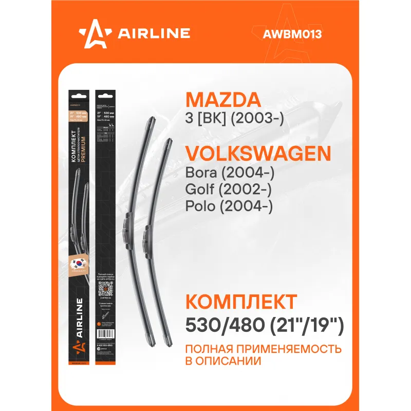 Щетки стеклоочистителя комплект 530/480мм (21"/19") бескаркасные PREMIUM с креплением "Side Pin 22 мм", 2 штуки Описание: Комплект модельных щеток стеклоочистителя PREMIUM с бескаркасной конструкцией AIRLINE AWBM013 530/480 мм - это результат инновационных разработок, направленных на обеспечение безупречного видения дороги в любых погодных условиях. Они специально разработаны для конкретных моделей авто, что позволяет достичь безупречного прилегания к лобовому стеклу и обеспечить высочайшую эффективность очистки. Использование премиальных материалов гарантирует долгий срок службы щеток, а также их стойкость к различным погодным условиям. Уникальная конструкция щеток AIRLINE обеспечивает тихую и плавную работу, минимизируя шум и неприятные звуки даже при высоких скоростях. Простота установки этих щеток стеклоочистителя делает их идеальным выбором для водителей, которые ценят свое время и удобство. Применяемость: MAZDA 3, VW BORA, GOLF, POLO.. Преимущества щетки AIRLINE AWBM013 - Материал щетки - долговечная натуральная резина; - Адаптеры произведены из специального технического пластика, от -40 до +60; - Адаптер - Side pin 17 mm, 22 mm - Боковой штырь 17 мм, 22 мм; - Бесшумная работа бескаркасной щетки стеклоочистителя; - Равномерный прижим щетки к поверхности стекла; Если у вас есть вопросы по применяемости, мы всегда готовы помочь вам с подбором по VIN-НОМЕРУ ВАШЕГО АВТОМОБИЛЯ. С модельными щетками стеклоочистителя AIRLINE каждая поездка будет проходить с максимальным комфортом и безопасностью, независимо от погоды за окном. Мы гарантируем качество и надежность наших товаров. Характеристики: Артикул: AWBM013 OEM номера: BP4K-67-330, BP4K673309K, BP4K-67-330A, BP4K-67-330B, BP4L-67-330, BP4L-67-330A, BP4L-67-330B, B32H-67-330, B32L-67-330, BN8F67330, BN8G67330, 1J0 955 425 A, 1J0 955 426 B, 1J0 998 002, 1J0 998 002 A, 1J1 955 425 A, 1J1 955 426 B, 6Q1 955 425, 6Q1 955 425 A, 1J1 955 425 B Размер водительской щетки, мм: 530 Размер пассажирской щетки, мм: 480 Адаптер крепления: Side pin 17 mm, 22 mm - Боковой штырь 17 мм, 22 мм Размер водительской щетки, дюйм: 21 Размер пассажирской щетки, дюйм: 19 Тип: Бескаркасная Комплектация: Щетка стеклоочистителя - 2 шт Пластиковая подложка - 1 шт Адаптеры - 2 шт Картонная коробка - 1 шт Гарантия: от 1 года.