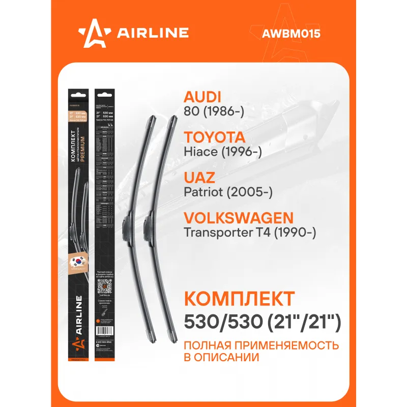 Щетки стеклоочистителя комплект 530/530мм (21"/21") бескаркасные PREMIUM с креплением "Крючок 9x3, 9x4 мм", 2 штуки Описание: Комплект модельных щеток стеклоочистителя PREMIUM с бескаркасной конструкцией AIRLINE AWBM015 530/530 мм - это результат инновационных разработок, направленных на обеспечение безупречного видения дороги в любых погодных условиях. Они специально разработаны для конкретных моделей авто, что позволяет достичь безупречного прилегания к лобовому стеклу и обеспечить высочайшую эффективность очистки. Использование премиальных материалов гарантирует долгий срок службы щеток, а также их стойкость к различным погодным условиям. Уникальная конструкция щеток AIRLINE обеспечивает тихую и плавную работу, минимизируя шум и неприятные звуки даже при высоких скоростях. Простота установки этих щеток стеклоочистителя делает их идеальным выбором для водителей, которые ценят свое время и удобство. Применяемость: ALFA ROMEO 164, ALPINA B6, AUDI 80, 200, 90, A4, 100, COUPE, TT, BMW Z8, CHEVROLET CORVETTE, FORD EXPLORER, JAGUAR XK, JEEP GRAND CHEROKEE, CHEROKEE, PATRIOT, KIA BONGO, SAAB 9-3, SMART CABRIO, CITY-COUPE, FORTWO, TOYOTA HIACE, UAZ PATRIOT, PICKUP, VOLVO S70, C70, V70, S90, VW NEW BEETLE, T4, PASSAT, ZAZ 1103 SLAVUTA.. Преимущества щетки AIRLINE AWBM015 - Материал щетки - долговечная натуральная резина; - Адаптеры произведены из специального технического пластика, от -40 до +60; - Адаптер - Hook 9x3, 9x4 mm - Крючок 9x3, 9x4 мм; - Бесшумная работа бескаркасной щетки стеклоочистителя; - Равномерный прижим щетки к поверхности стекла; Если у вас есть вопросы по применяемости, мы всегда готовы помочь вам с подбором по VIN-НОМЕРУ ВАШЕГО АВТОМОБИЛЯ. С модельными щетками стеклоочистителя AIRLINE каждая поездка будет проходить с максимальным комфортом и безопасностью, независимо от погоды за окном. Характеристики: Артикул: AWBM015 OEM номера: 9529488, 85222 26020, 8522226120, 9169319, 9169320, 1392219, 3412197, 34473959, 3447639, KS9 555 305 3, 357 998 001 A, 7H0998003, 357955425, H 816 810 170 020, DKC 1009 60 Размер водительской щетки, мм: 530 Размер пассажирской щетки, мм: 530 Адаптер крепления: Hook 9x3, 9x4 mm - Крючок 9x3, 9x4 мм Размер водительской щетки, дюйм: 21 Размер пассажирской щетки, дюйм: 21 Тип: Бескаркасная Комплектация: Щетка стеклоочистителя - 2 шт Адаптеры - 2 шт Картонная коробка - 1 шт Пластиковая подложка - 1 шт Гарантия: от 1 года.
