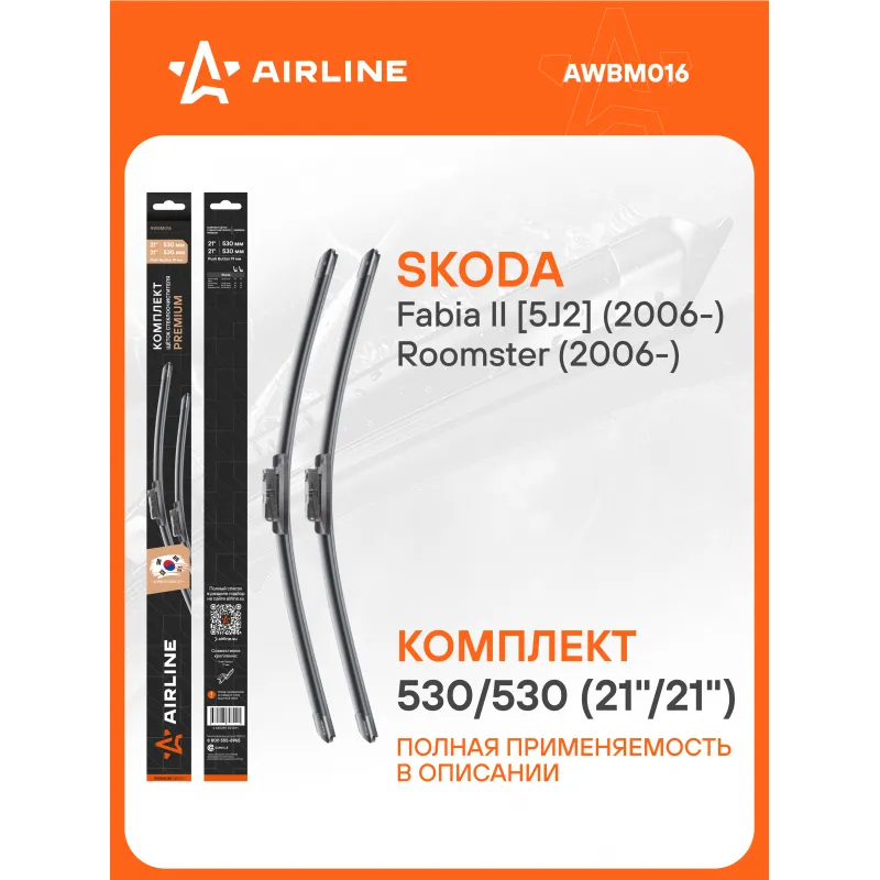 Щетки стеклоочистителя комплект 530/530мм (21"/21") бескаркасные PREMIUM с креплением "Push Button 19 мм", 2 штуки Описание: Комплект модельных щеток стеклоочистителя PREMIUM с бескаркасной конструкцией AIRLINE AWBM016 530/530 мм - это результат инновационных разработок, направленных на обеспечение безупречного видения дороги в любых погодных условиях. Они специально разработаны для конкретных моделей авто, что позволяет достичь безупречного прилегания к лобовому стеклу и обеспечить высочайшую эффективность очистки. Использование премиальных материалов гарантирует долгий срок службы щеток, а также их стойкость к различным погодным условиям. Уникальная конструкция щеток AIRLINE обеспечивает тихую и плавную работу, минимизируя шум и неприятные звуки даже при высоких скоростях. Простота установки этих щеток стеклоочистителя делает их идеальным выбором для водителей, которые ценят свое время и удобство. Применяемость: SKODA FABIA, ROOMSTER.. Преимущества щетки AIRLINE AWBM016 - Материал щетки - долговечная натуральная резина; - Адаптеры произведены из специального технического пластика, от -40 до +60; - Адаптер - Push Button 19 mm - Кнопка 19 мм; - Бесшумная работа бескаркасной щетки стеклоочистителя; - Равномерный прижим щетки к поверхности стекла; Если у вас есть вопросы по применяемости, мы всегда готовы помочь вам с подбором по VIN-НОМЕРУ ВАШЕГО АВТОМОБИЛЯ. С модельными щетками стеклоочистителя AIRLINE каждая поездка будет проходить с максимальным комфортом и безопасностью, независимо от погоды за окном. Мы гарантируем качество и надежность наших товаров. Характеристики: Артикул: AWBM016 OEM номера: 5J1 998 001, 5J1955425C, 5J2998001 Размер водительской щетки, мм: 530 Размер пассажирской щетки, мм: 530 Адаптер крепления: Push Button 19 mm - Кнопка 19 мм Размер водительской щетки, дюйм: 21 Размер пассажирской щетки, дюйм: 21 Тип: Бескаркасная Комплектация: Щетка стеклоочистителя - 2 шт Пластиковая подложка - 1 шт Адаптеры - 2 шт Картонная коробка - 1 шт Гарантия: от 1 года.
