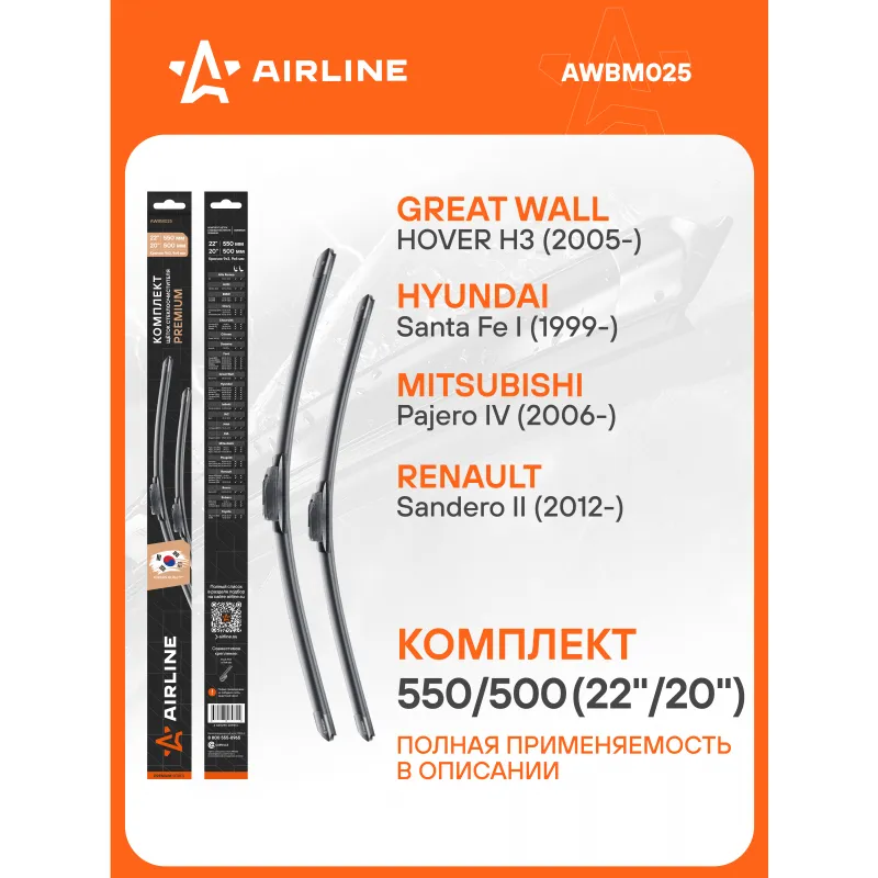 Щетки стеклоочистителя комплект 550/500мм (22"/20") бескаркасные PREMIUM с креплением "Крючок 9x3, 9x4 мм", 2 штуки Описание: Комплект модельных щеток стеклоочистителя PREMIUM с бескаркасной конструкцией AIRLINE AWBM025 550/500 мм - это результат инновационных разработок, направленных на обеспечение безупречного видения дороги в любых погодных условиях. Они специально разработаны для конкретных моделей авто, что позволяет достичь безупречного прилегания к лобовому стеклу и обеспечить высочайшую эффективность очистки. Использование премиальных материалов гарантирует долгий срок службы щеток, а также их стойкость к различным погодным условиям. Уникальная конструкция щеток AIRLINE обеспечивает тихую и плавную работу, минимизируя шум и неприятные звуки даже при высоких скоростях. Простота установки этих щеток стеклоочистителя делает их идеальным выбором для водителей, которые ценят свое время и удобство. Применяемость: ALFA ROMEO 8C, AUDI A8, BMW Z4, X3, CHERY ESTINA / E5, EASTAR, ORIENTAL SON, CHEVROLET CORVETTE, EPICA, EVANDA, CHRYSLER CROSSFIRE, CITROEN XSARA, DAEWOO EVANDA, FORD COUGAR, MONDEO, MUSTANG, TRANSIT CONNECT, HYUNDAI GRACE, GRANDEUR, SANTA FE, TERRACAN, INFINITI FX, JAC S1 REIN, JEEP COMPASS, KIA MAGENTIS, LEXUS IS, MITSUBISHI PAJERO, PEUGEOT 306, RENAULT MEGANE, KANGOO, SANDERO / STEPWAY, ROVER 600, SUBARU BRZ, LEGACY, OUTBACK, TOYOTA GT 86, 4 RUNNER.. Преимущества щетки AIRLINE AWBM025 - Материал щетки - долговечная натуральная резина; - Адаптеры произведены из специального технического пластика, от -40 до +60; - Адаптер - Hook 9x3, 9x4 mm - Крючок 9x3, 9x4 мм; - Бесшумная работа бескаркасной щетки стеклоочистителя; - Равномерный прижим щетки к поверхности стекла; Если у вас есть вопросы по применяемости, мы всегда готовы помочь вам с подбором по VIN-НОМЕРУ ВАШЕГО АВТОМОБИЛЯ. С модельными щетками стеклоочистителя AIRLINE каждая поездка будет проходить с максимальным комфортом и безопасностью, независимо от погоды за окном. Характеристики: Артикул: AWBM025 OEM номера: 71804093, 76620-SM4-A01, 76620-SM4-G01, MB848803, 6426 EW, 6426 P1, 6426.R2, 6426.R8, 77 01 040 774, 77 01 040 775, 77 01 040 776, 77 01 040 777, 77 01 040 778, 77 01 040 779, YS7J17528CA, 2T1A17528CA, 4U7J17528CA Размер водительской щетки, мм: 550 Размер пассажирской щетки, мм: 500 Адаптер крепления: Hook 9x3, 9x4 mm - Крючок 9x3, 9x4 мм Размер водительской щетки, дюйм: 22 Размер пассажирской щетки, дюйм: 20 Тип: Бескаркасная Комплектация: Щетка стеклоочистителя - 2 шт Адаптеры - 2 шт Картонная коробка - 1 шт Пластиковая подложка - 1 шт Гарантия: от 1 года.
