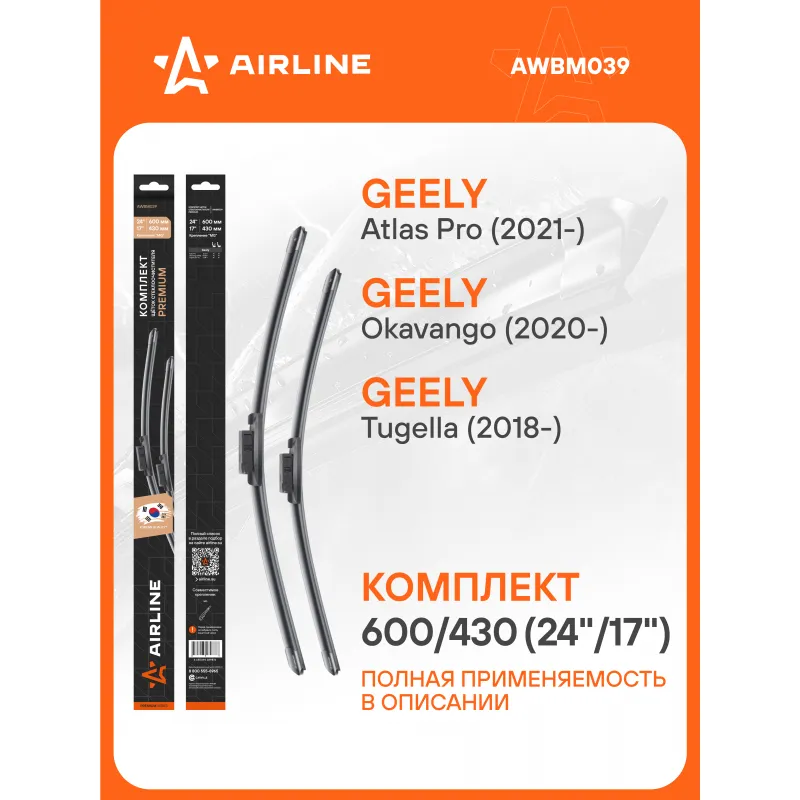 Щетки стеклоочистителя комплект 600/430мм (24"/17") бескаркасные PREMIUM с креплением "MG", 2 штуки Описание: Комплект модельных щетки стеклоочистителя PREMIUM с бескаркасной конструкцией AIRLINE AWBM039 600/430 мм - это результат инновационных разработок, направленных на обеспечение безупречного видения дороги в любых погодных условиях. Они специально разработаны для конкретных моделей авто, что позволяет достичь безупречного прилегания к лобовому стеклу и обеспечить высочайшую эффективность очистки. Использование премиальных материалов гарантирует долгий срок службы щеток, а также их стойкость к различным погодным условиям. Уникальная конструкция щеток AIRLINE обеспечивает тихую и плавную работу, минимизируя шум и неприятные звуки даже при высоких скоростях. Простота установки этих щеток стеклоочистителя делает их идеальным выбором для водителей, которые ценят свое время и удобство. Применяемость: GEELY ATLAS, TUGELLA.. Преимущества щетки AIRLINE AWBM039 - Материал щетки - долговечная натуральная резина; - Адаптеры произведены из специального технического пластика, от -40 до +60; - Адаптер - MG - МГ; - Бесшумная работа бескаркасной щетки стеклоочистителя; - Равномерный прижим щетки к поверхности стекла; Если у вас есть вопросы по применяемости, мы всегда готовы помочь вам с подбором по VIN-НОМЕРУ ВАШЕГО АВТОМОБИЛЯ. С модельными щетками стеклоочистителя AIRLINE каждая поездка будет проходить с максимальным комфортом и безопасностью, независимо от погоды за окном. Характеристики: Артикул: AWBM039 OEM номера: 6020018600, 6020018800, 6020024000, 6020024300, 6020000000000 Размер водительской щетки, мм: 600 Размер пассажирской щетки, мм: 430 Адаптер крепления: MG - МГ Размер водительской щетки, дюйм: 24 Размер пассажирской щетки, дюйм: 17 Тип: Бескаркасная Комплектация: Щетка стеклоочистителя - 2 шт Адаптеры - 2 шт Картонная коробка - 1 шт Пластиковая подложка - 1 шт Гарантия: от 1 года.