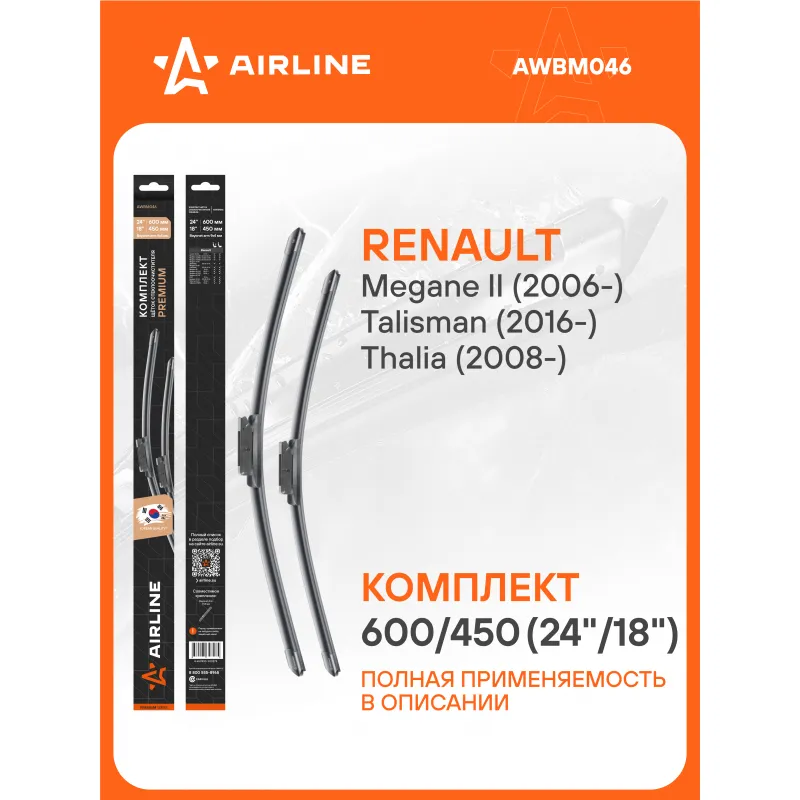 Щетки стеклоочистителя комплект 600/450мм (24"/18") бескаркасные PREMIUM с креплением "Bayonet arm 9x4 мм", 2 штуки Описание: Комплект модельных щеток стеклоочистителя PREMIUM с бескаркасной конструкцией AIRLINE AWBM046 600/450 мм - это результат инновационных разработок, направленных на обеспечение безупречного видения дороги в любых погодных условиях. Они специально разработаны для конкретных моделей авто, что позволяет достичь безупречного прилегания к лобовому стеклу и обеспечить высочайшую эффективность очистки. Использование премиальных материалов гарантирует долгий срок службы щеток, а также их стойкость к различным погодным условиям. Уникальная конструкция щеток AIRLINE обеспечивает тихую и плавную работу, минимизируя шум и неприятные звуки даже при высоких скоростях. Простота установки этих щеток стеклоочистителя делает их идеальным выбором для водителей, которые ценят свое время и удобство. Применяемость: RENAULT MEGANE, CLIO SYMBOL / THALIA, TALISMAN.. Преимущества щетки AIRLINE AWBM046 - Материал щетки - долговечная натуральная резина; - Адаптеры произведены из специального технического пластика, от -40 до +60; - Адаптер - Bayonet arm 8x4, 9x4 mm - Штыковой замок 8x4, 9x4 мм; - Бесшумная работа бескаркасной щетки стеклоочистителя; - Равномерный прижим щетки к поверхности стекла; Если у вас есть вопросы по применяемости, мы всегда готовы помочь вам с подбором по VIN-НОМЕРУ ВАШЕГО АВТОМОБИЛЯ. С модельными щетками стеклоочистителя AIRLINE каждая поездка будет проходить с максимальным комфортом и безопасностью, независимо от погоды за окном. Мы гарантируем качество и надежность наших товаров. Характеристики: Артикул: AWBM046 OEM номера: 77114-21438, 7701063739, 7711421793, 7701063733, 7701063735, 288907739R, 7701071249, 288909270R, 288901962R, 288905565R, 28 89 004 64R, 28 89 032 11R, 7701071248 Размер водительской щетки, мм: 600 Размер пассажирской щетки, мм: 450 Адаптер крепления: Bayonet arm 8x4, 9x4 mm - Штыковой замок 8x4, 9x4 мм Размер водительской щетки, дюйм: 24 Размер пассажирской щетки, дюйм: 18 Тип: Бескаркасная Комплектация: Щетка стеклоочистителя - 2 шт Картонная коробка - 1 шт Адаптеры - 2 шт Пластиковая подложка - 1 шт Гарантия: от 1 года.