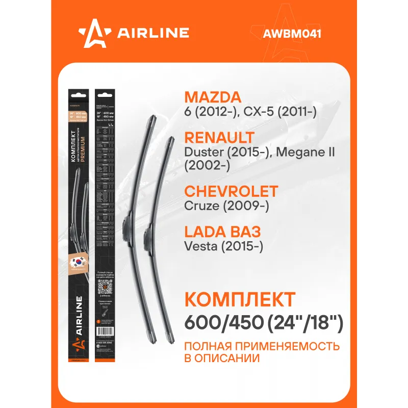 Щетки стеклоочистителя комплект 600/450мм (24"/18") бескаркасные PREMIUM с креплением "Крючок 9x3, 9x4 мм", 2 штуки Описание: Комплект модельных щеток стеклоочистителя PREMIUM с бескаркасной конструкцией AIRLINE AWBM041 600/450 мм - это результат инновационных разработок, направленных на обеспечение безупречного видения дороги в любых погодных условиях. Они специально разработаны для конкретных моделей авто, что позволяет достичь безупречного прилегания к лобовому стеклу и обеспечить высочайшую эффективность очистки. Использование премиальных материалов гарантирует долгий срок службы щеток, а также их стойкость к различным погодным условиям. Уникальная конструкция щеток AIRLINE обеспечивает тихую и плавную работу, минимизируя шум и неприятные звуки даже при высоких скоростях. Простота установки этих щеток стеклоочистителя делает их идеальным выбором для водителей, которые ценят свое время и удобство. Применяемость: ASTON MARTIN DB9, VANQUISH, CHANGAN CS35, EADO, RAETON, UNI-K, CHERY ARRIZO 7, TIGGO 5, CHEVROLET CRUZE, CITROEN C2, C3, DODGE JOURNEY, FERRARI 550, 575, HYUNDAI SANTA FE, CRETA, ELANTRA, INFINITI EX, Q, IRAN KHODRO SAMAND, JAGUAR XJ, JEEP COMPASS, KIA CEED, CARENS, MAGENTIS, OPIRUS, OPTIMA, SELTOS, SORENTO, SPORTAGE, LADA VESTA, LEXUS IS, RC, MAZDA 6, 3, CX-5, MITSUBISHI LANCER, NISSAN TERRANO, OPEL INSIGNIA, PEUGEOT 1007, RENAULT DUSTER, MEGANE, LAGUNA, SSANGYONG KORANDO, RODIUS, SUBARU FORESTER, LEGACY, OUTBACK, TOYOTA SIENNA.. Преимущества щетки AIRLINE AWBM041 - Материал щетки - долговечная натуральная резина; - Адаптеры произведены из специального технического пластика, от -40 до +60; - Адаптер - Hook 9x3, 9x4 mm - Крючок 9x3, 9x4 мм; - Бесшумная работа бескаркасной щетки стеклоочистителя; - Равномерный прижим щетки к поверхности стекла; Если у вас есть вопросы по применяемости, мы всегда готовы помочь вам с подбором по VIN-НОМЕРУ ВАШЕГО АВТОМОБИЛЯ. С модельными щетками стеклоочистителя AIRLINE каждая поездка будет проходить с максимальным комфортом и безопасностью, независимо от погоды за окном. Характеристики: Артикул: AWBM041 OEM номера: 61 61 9 069 195, 5911650, 84AU17528B, A780X17528AJA, XM3417528FA, XM3417528HA, 8FG2-67-330A, B095-67-330, BE5J-67-330, BHS3-67-330, BJ0F-67-330, FE15-67-330A, G044-67-330, GB93-67-330, KD53-67-330, NA12-67-330, NA13-67-330, 8250A186, 8250A375, MB382532, MB622213, MB622214, MN181423, MR416668, MZ690098, 28890-AU311, 28890-AX610, 28890-JR81A, AY00J-UAF5R, 12 72 038, 12 72 337, 12 72 788, 1272346, 6426.CE, 6426.SP, 6423.A1, 6423.L6, 6426.XN, 86542-AG160, 86542-SC150, 86542-SC160, 38340-60B00, 38340-60B00-000, 38340-60B20, 38340-60B20-000, 38340-65B00, 38340-65B00-000, 38340-70B10, 38340-70B10-000, 85212-10130, 85212-10140, 85212-74010, 85222-10230, 85222-10240, 85222-30590, 3201897, 3297732, 3343022, 98360-2H000, 98360-2B000, 98350-24510, 98350-28920, 98360-22020, 983502H050, 983502B010, 98350-28000, 98360-2C000, KS9 554 505 3, 96910777, 96910780, 95161605, 95161606, 13227405, 13277083, 25882578, 78360-05000, 93178169, 96341429, 001 4885 V002, Q0014885V002, 39023142 Размер водительской щетки, мм: 600 Размер пассажирской щетки, мм: 450 Адаптер крепления: Hook 9x3, 9x4 mm - Крючок 9x3, 9x4 мм Размер водительской щетки, дюйм: 24 Размер пассажирской щетки, дюйм: 18 Тип: Бескаркасная Комплектация: Щетка стеклоочистителя - 2 шт Адаптеры - 2 шт Картонная коробка - 1 шт Пластиковая подложка - 1 шт Гарантия: от 1 года.