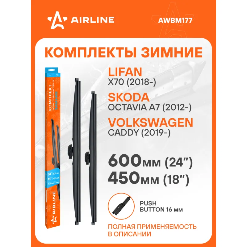 Щетки стеклоочистителя комплект 600/450мм (24"/18") зимние с креплением "Push Button 16 мм", 2 штуки Описание: Модельные зимние щетки стеклоочистителя AIRLINE – это результат инновационных разработок, направленных на обеспечение безупречного видения дороги в любых зимних погодных условиях. Они специально разработаны для конкретных моделей авто, что позволяет достичь безупречного прилегания к лобовому стеклу и обеспечить высочайшую эффективность очистки даже при низких температурах и обильных осадках. Щетки изготовлены из премиальных материалов и специальной резины EPDM, которая отлично сохраняет свои свойства даже в агрессивно-химических условиях, таких как воздействие дорожных реагентов. Это обеспечивает долгий срок службы и высокую стойкость щеток к экстремальным зимним условиям. Уникальная конструкция щеток AIRLINE обеспечивает тихую и плавную работу, минимизируя шум и неприятные звуки, обеспечивая стабильную работу в любых зимних условиях. Простота установки этих щеток стеклоочистителя делает их идеальным выбором для водителей, которые ценят свое время и удобство. С модельными зимними щетками стеклоочистителя AIRLINE каждая зимняя поездка будет проходить с максимальным комфортом и безопасностью, независимо от погоды за окном. Характеристики: Артикул: AWBM177 OEM номера: 2K1 955 425 E, 2K1 998 002, 5E1 955 425, 5E1 955 425 A, 5E1 955 426, 5E1 955 426 A, 5E1 998 001 Размер водительской щетки, мм: 600 Размер пассажирской щетки, мм: 450 Адаптер крепления: Push Button 16 mm - Узкая кнопка 16 мм Размер водительской щетки, дюйм: 24 Размер пассажирской щетки, дюйм: 18 Тип: Зимняя Комплектация: Щетка стеклоочистителя - 2 шт Адаптеры - 2 шт Картонная коробка - 1 шт Картонная подложка для щетки стеклоочистителя - 2 шт Гарантия: от 1 года.