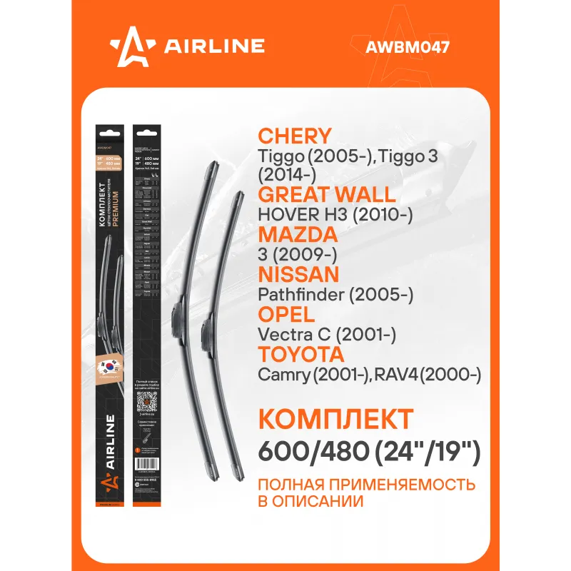 Щетки стеклоочистителя комплект 600/480мм (24"/19") бескаркасные PREMIUM с креплением "Крючок 9x3, 9x4 мм", 2 штуки Описание: Комплект модельных щеток стеклоочистителя PREMIUM с бескаркасной конструкцией AIRLINE AWBM047 600/480 мм - это результат инновационных разработок, направленных на обеспечение безупречного видения дороги в любых погодных условиях. Они специально разработаны для конкретных моделей авто, что позволяет достичь безупречного прилегания к лобовому стеклу и обеспечить высочайшую эффективность очистки. Использование премиальных материалов гарантирует долгий срок службы щеток, а также их стойкость к различным погодным условиям. Уникальная конструкция щеток AIRLINE обеспечивает тихую и плавную работу, минимизируя шум и неприятные звуки даже при высоких скоростях. Простота установки этих щеток стеклоочистителя делает их идеальным выбором для водителей, которые ценят свое время и удобство. Применяемость: CHERY TIGGO, TIGGO 3, CHEVROLET EQUINOX, MALIBU, ORLANDO, REZZO, CITROEN XANTIA, DAEWOO REZZO, FIAT FREEMONT, HYUNDAI EQUUS, INFINITI FX, Q, JAGUAR S-TYPE, KIA CARENS, LEXUS GS, MAZDA 3, NISSAN TEANA, NAVARA, PATHFINDER, PATROL, OPEL OMEGA, SIGNUM, VECTRA, TOYOTA CAMRY, VISTA, RAV 4.. Преимущества щетки AIRLINE AWBM047 - Материал щетки - долговечная натуральная резина; - Адаптеры произведены из специального технического пластика, от -40 до +60; - Адаптер - Hook 9x3, 9x4 mm - Крючок 9x3, 9x4 мм; - Бесшумная работа бескаркасной щетки стеклоочистителя; - Равномерный прижим щетки к поверхности стекла; Если у вас есть вопросы по применяемости, мы всегда готовы помочь вам с подбором по VIN-НОМЕРУ ВАШЕГО АВТОМОБИЛЯ. С модельными щетками стеклоочистителя AIRLINE каждая поездка будет проходить с максимальным комфортом и безопасностью, независимо от погоды за окном. Характеристики: Артикул: AWBM047 OEM номера: 61 61 0 037 009, 61 61 9 071 613, 61610039697, 76620-SM4-A01, 76630-SM4-A02, BBP3-67-330, BPFB673309K, 28890-5X10A, 28890-5X11A, 28895-5X11B, 288903EV6A, 288953X40B, 288953X41B, 288955X10B, 28 89 04 9 13R, 85212-53050, 85222-52100, 8521253051, 85212YZZAM, 85212YZZAW, 93173550, 95161605, 95287043, 96252775, 96262505, 8522233200, 288901CA0A, 288901CA1A, 288903WU0A Размер водительской щетки, мм: 600 Размер пассажирской щетки, мм: 480 Адаптер крепления: Hook 9x3, 9x4 mm - Крючок 9x3, 9x4 мм Размер водительской щетки, дюйм: 24 Размер пассажирской щетки, дюйм: 19 Тип: Бескаркасная Комплектация: Щетка стеклоочистителя - 2 шт Адаптеры - 2 шт Картонная коробка - 1 шт Пластиковая подложка - 1 шт Гарантия: от 1 года.