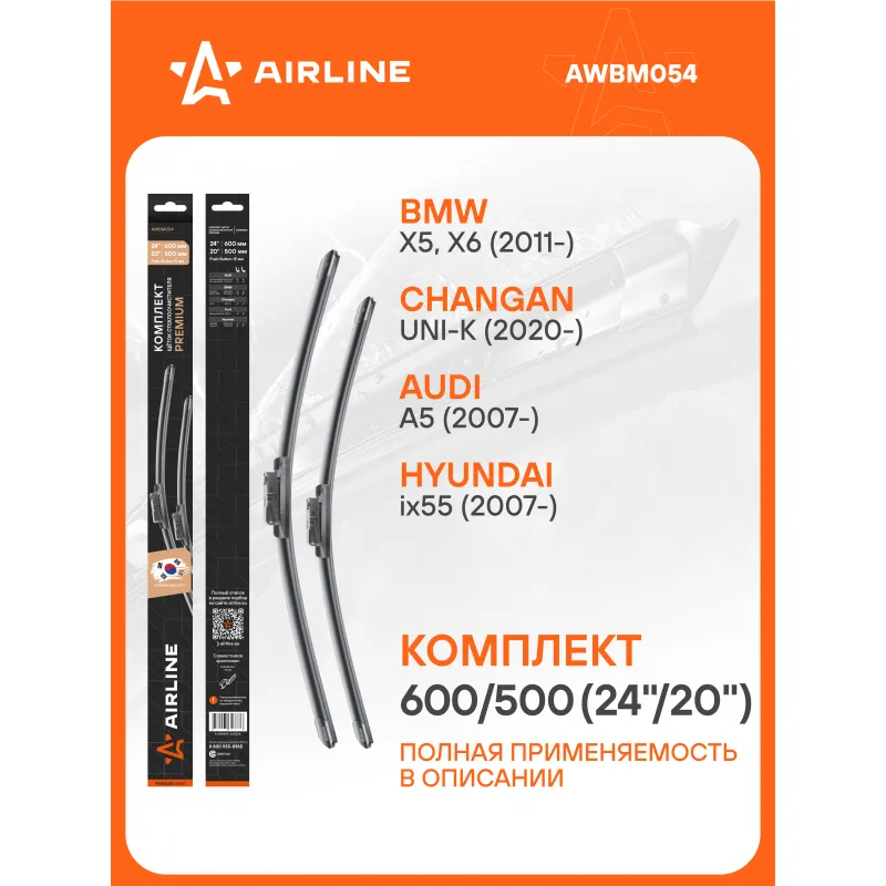 Щетки стеклоочистителя комплект 600/500мм (24"/20") бескаркасные PREMIUM с креплением "Push Button 19 мм", 2 штуки Описание: Комплект модельных щеток стеклоочистителя PREMIUM с бескаркасной конструкцией AIRLINE AWBM054 600/500 мм - это результат инновационных разработок, направленных на обеспечение безупречного видения дороги в любых погодных условиях. Они специально разработаны для конкретных моделей авто, что позволяет достичь безупречного прилегания к лобовому стеклу и обеспечить высочайшую эффективность очистки. Использование премиальных материалов гарантирует долгий срок службы щеток, а также их стойкость к различным погодным условиям. Уникальная конструкция щеток AIRLINE обеспечивает тихую и плавную работу, минимизируя шум и неприятные звуки даже при высоких скоростях. Простота установки этих щеток стеклоочистителя делает их идеальным выбором для водителей, которые ценят свое время и удобство. Применяемость: AUDI A5, BMW X6, X5, CHANGAN UNI-K, FORD MUSTANG, HYUNDAI iX55.. Преимущества щетки AIRLINE AWBM054 - Материал щетки - долговечная натуральная резина; - Адаптеры произведены из специального технического пластика, от -40 до +60; - Адаптер - Push Button 19 mm - Кнопка 19 мм; - Бесшумная работа бескаркасной щетки стеклоочистителя; - Равномерный прижим щетки к поверхности стекла; Если у вас есть вопросы по применяемости, мы всегда готовы помочь вам с подбором по VIN-НОМЕРУ ВАШЕГО АВТОМОБИЛЯ. С модельными щетками стеклоочистителя AIRLINE каждая поездка будет проходить с максимальным комфортом и безопасностью, независимо от погоды за окном. Мы гарантируем качество и надежность наших товаров. Характеристики: Артикул: AWBM054 OEM номера: 61610038893, 8K1955425A, 8K1955426A, 8K1 998 002 A Размер водительской щетки, мм: 600 Размер пассажирской щетки, мм: 500 Адаптер крепления: Push Button 19 mm - Кнопка 19 мм Размер водительской щетки, дюйм: 24 Размер пассажирской щетки, дюйм: 20 Тип: Бескаркасная Комплектация: Щетка стеклоочистителя - 2 шт Адаптеры - 2 шт Картонная коробка - 1 шт Пластиковая подложка - 1 шт Гарантия: от 1 года.