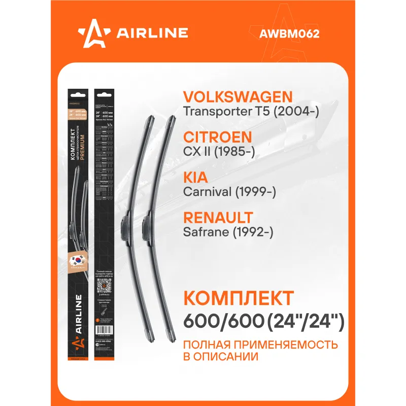 Щетки стеклоочистителя комплект 600/600мм (24"/24") бескаркасные PREMIUM с креплением "Крючок 9x3, 9x4 мм", 2 штуки Описание: Комплект модельных щеток стеклоочистителя PREMIUM с бескаркасной конструкцией AIRLINE AWBM062 600/600 мм - это результат инновационных разработок, направленных на обеспечение безупречного видения дороги в любых погодных условиях. Они специально разработаны для конкретных моделей авто, что позволяет достичь безупречного прилегания к лобовому стеклу и обеспечить высочайшую эффективность очистки. Использование премиальных материалов гарантирует долгий срок службы щеток, а также их стойкость к различным погодным условиям. Уникальная конструкция щеток AIRLINE обеспечивает тихую и плавную работу, минимизируя шум и неприятные звуки даже при высоких скоростях. Простота установки этих щеток стеклоочистителя делает их идеальным выбором для водителей, которые ценят свое время и удобство. Применяемость: BENTLEY ARNAGE, BMW 7, CHEVROLET LUMINA, TRANS SPORT, CITROEN CX, IVECO DAILY, KIA CARNIVAL, MAZDA MPV, NISSAN INTERSTAR, SERENA, VANETTE, OPEL MOVANO, ZAFIRA, RENAULT SAFRANE, ROLLS-ROYCE SILVER SERAPH, VW T5, ZAZ 1103 SLAVUTA.. Преимущества щетки AIRLINE AWBM062 - Материал щетки - долговечная натуральная резина; - Адаптеры произведены из специального технического пластика, от -40 до +60; - Адаптер - Hook 9x3, 9x4 mm - Крючок 9x3, 9x4 мм; - Бесшумная работа бескаркасной щетки стеклоочистителя; - Равномерный прижим щетки к поверхности стекла; Если у вас есть вопросы по применяемости, мы всегда готовы помочь вам с подбором по VIN-НОМЕРУ ВАШЕГО АВТОМОБИЛЯ. С модельными щетками стеклоочистителя AIRLINE каждая поездка будет проходить с максимальным комфортом и безопасностью, независимо от погоды за окном. Мы гарантируем качество и надежность наших товаров. Характеристики: Артикул: AWBM062 OEM номера: 61618203954, 61610134601, LC6367330, LC8267330, 288909C004, 288909C006, 288909C000, 288909C005, 62 72 271, 1272734, 12 72 736, 6272232, 6272233, 62 72 296, 6272315, 7701410134, 8671000036, 7701040501, 7711170183, 0K55267330, S0K55267330, 0K72A67330, JZW 998 002 M, 7H0998003, 93178171 Размер водительской щетки, мм: 600 Размер пассажирской щетки, мм: 600 Адаптер крепления: Hook 9x3, 9x4 mm - Крючок 9x3, 9x4 мм Размер водительской щетки, дюйм: 24 Размер пассажирской щетки, дюйм: 24 Тип: Бескаркасная Комплектация: Щетка стеклоочистителя - 2 шт Картонная коробка - 1 шт Адаптеры - 2 шт Пластиковая подложка - 1 шт Гарантия: от 1 года.