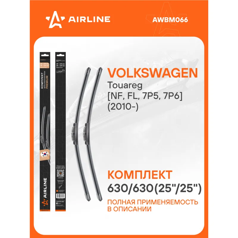 Щетки стеклоочистителя комплект 630/630мм (25"/25") бескаркасные PREMIUM с креплением "Side pin 22 мм", 2 штуки Описание: Комплект модельных щеток стеклоочистителя PREMIUM с бескаркасной конструкцией AIRLINE AWBM066 630/630 мм - это результат инновационных разработок, направленных на обеспечение безупречного видения дороги в любых погодных условиях. Они специально разработаны для конкретных моделей авто, что позволяет достичь безупречного прилегания к лобовому стеклу и обеспечить высочайшую эффективность очистки. Использование премиальных материалов гарантирует долгий срок службы щеток, а также их стойкость к различным погодным условиям. Уникальная конструкция щеток AIRLINE обеспечивает тихую и плавную работу, минимизируя шум и неприятные звуки даже при высоких скоростях. Простота установки этих щеток стеклоочистителя делает их идеальным выбором для водителей, которые ценят свое время и удобство. Применяемость: VW TOUAREG.. Преимущества щетки AIRLINE AWBM066 - Материал щетки - долговечная натуральная резина; - Адаптеры произведены из специального технического пластика, от -40 до +60; - Адаптер - Side pin 17 mm, 22 mm - Боковой штырь 17 мм, 22 мм; - Бесшумная работа бескаркасной щетки стеклоочистителя; - Равномерный прижим щетки к поверхности стекла; Если у вас есть вопросы по применяемости, мы всегда готовы помочь вам с подбором по VIN-НОМЕРУ ВАШЕГО АВТОМОБИЛЯ. С модельными щетками стеклоочистителя AIRLINE каждая поездка будет проходить с максимальным комфортом и безопасностью, независимо от погоды за окном. Мы гарантируем качество и надежность наших товаров. Характеристики: Артикул: AWBM066 OEM номера: 7P0 998 002 Размер водительской щетки, мм: 630 Размер пассажирской щетки, мм: 630 Адаптер крепления: Side pin 17 mm, 22 mm - Боковой штырь 17 мм, 22 мм Размер водительской щетки, дюйм: 25 Размер пассажирской щетки, дюйм: 25 Тип: Бескаркасная Комплектация: Щетка стеклоочистителя - 2 шт Картонная коробка - 1 шт Адаптеры - 2 шт Пластиковая подложка - 1 шт Гарантия: от 1 года.