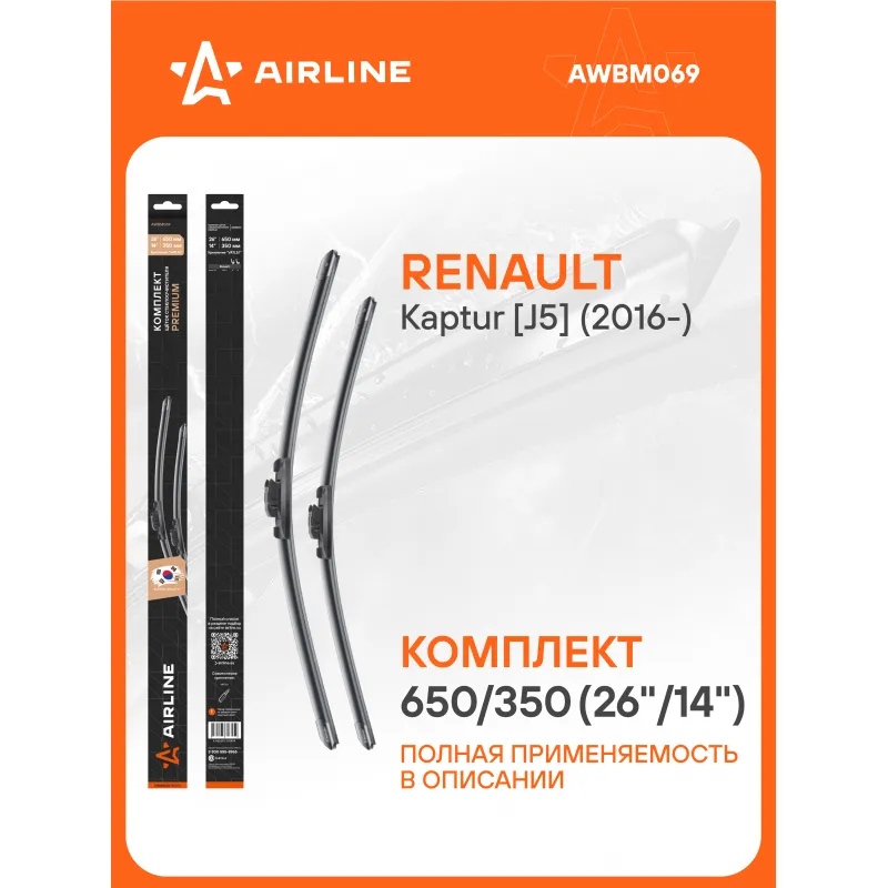 Щетки стеклоочистителя комплект 650/350мм (26"/14") бескаркасные PREMIUM с креплением "VATL5.1", 2 штуки Описание: Комплект модельных щеток стеклоочистителя PREMIUM с бескаркасной конструкцией AIRLINE AWBM069 650/350 мм - это результат инновационных разработок, направленных на обеспечение безупречного видения дороги в любых погодных условиях. Они специально разработаны для конкретных моделей авто, что позволяет достичь безупречного прилегания к лобовому стеклу и обеспечить высочайшую эффективность очистки. Использование премиальных материалов гарантирует долгий срок службы щеток, а также их стойкость к различным погодным условиям. Уникальная конструкция щеток AIRLINE обеспечивает тихую и плавную работу, минимизируя шум и неприятные звуки даже при высоких скоростях. Простота установки этих щеток стеклоочистителя делает их идеальным выбором для водителей, которые ценят свое время и удобство. Применяемость: RENAULT KAPTUR.. Преимущества щетки AIRLINE AWBM069 - Материал щетки - долговечная натуральная резина; - Адаптеры произведены из специального технического пластика, от -40 до +60; - Адаптер - VATL5.1 - ВАТЛ5.1; - Бесшумная работа бескаркасной щетки стеклоочистителя; - Равномерный прижим щетки к поверхности стекла; Если у вас есть вопросы по применяемости, мы всегда готовы помочь вам с подбором по VIN-НОМЕРУ ВАШЕГО АВТОМОБИЛЯ. С модельными щетками стеклоочистителя AIRLINE каждая поездка будет проходить с максимальным комфортом и безопасностью, независимо от погоды за окном. Мы гарантируем качество и надежность наших товаров. Характеристики: Артикул: AWBM069 OEM номера: 28 89 501 50R, 28 89 041 99R, 28 89 549 62R, 28 89 072 13R Размер водительской щетки, мм: 650 Размер пассажирской щетки, мм: 350 Адаптер крепления: VATL5.1 - ВАТЛ5.1 Размер водительской щетки, дюйм: 26 Размер пассажирской щетки, дюйм: 14 Тип: Бескаркасная Комплектация: Щетка стеклоочистителя - 2 шт Картонная коробка - 1 шт Адаптеры - 2 шт Пластиковая подложка - 1 шт Гарантия: от 1 года.