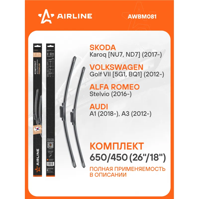 Щетки стеклоочистителя комплект 650/450мм (26"/18") бескаркасные PREMIUM с креплением "Push Button 16 мм", 2 штуки Описание: Комплект модельных щеток стеклоочистителя PREMIUM с бескаркасной конструкцией AIRLINE AWBM081 650/450 мм - это результат инновационных разработок, направленных на обеспечение безупречного видения дороги в любых погодных условиях. Они специально разработаны для конкретных моделей авто, что позволяет достичь безупречного прилегания к лобовому стеклу и обеспечить высочайшую эффективность очистки. Использование премиальных материалов гарантирует долгий срок службы щеток, а также их стойкость к различным погодным условиям. Уникальная конструкция щеток AIRLINE обеспечивает тихую и плавную работу, минимизируя шум и неприятные звуки даже при высоких скоростях. Простота установки этих щеток стеклоочистителя делает их идеальным выбором для водителей, которые ценят свое время и удобство. Применяемость: ALFA ROMEO STELVIO, AUDI A1, A3, SEAT ARONA, ATECA, LEON, SKODA KAROQ, SUPERB, VW GOLF, POLO, TAOS / THARU.. Преимущества щетки AIRLINE AWBM081 - Материал щетки - долговечная натуральная резина; - Адаптеры произведены из специального технического пластика, от -40 до +60; - Адаптер - Push Button 16 mm - Узкая кнопка 16 мм; - Бесшумная работа бескаркасной щетки стеклоочистителя; - Равномерный прижим щетки к поверхности стекла; Если у вас есть вопросы по применяемости, мы всегда готовы помочь вам с подбором по VIN-НОМЕРУ ВАШЕГО АВТОМОБИЛЯ. С модельными щетками стеклоочистителя AIRLINE каждая поездка будет проходить с максимальным комфортом и безопасностью, независимо от погоды за окном. Мы гарантируем качество и надежность наших товаров. Характеристики: Артикул: AWBM081 OEM номера: 5G1 998 002, 5G1 998 002 A, 8V1 955 425, 8V1 955 426 Размер водительской щетки, мм: 650 Размер пассажирской щетки, мм: 450 Адаптер крепления: Push Button 16 mm - Узкая кнопка 16 мм Размер водительской щетки, дюйм: 26 Размер пассажирской щетки, дюйм: 18 Тип: Бескаркасная Комплектация: Щетка стеклоочистителя - 2 шт Картонная коробка - 1 шт Адаптеры - 2 шт Пластиковая подложка - 1 шт Гарантия: от 1 года.