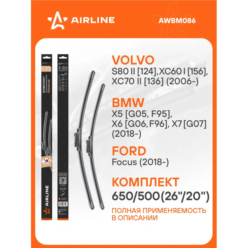 Щетки стеклоочистителя комплект 650/500мм (26"/20") бескаркасные PREMIUM с креплением "Push Button 19 мм", 2 штуки Описание: Комплект модельных щеток стеклоочистителя PREMIUM с бескаркасной конструкцией AIRLINE AWBM086 650/500 мм - это результат инновационных разработок, направленных на обеспечение безупречного видения дороги в любых погодных условиях. Они специально разработаны для конкретных моделей авто, что позволяет достичь безупречного прилегания к лобовому стеклу и обеспечить высочайшую эффективность очистки. Использование премиальных материалов гарантирует долгий срок службы щеток, а также их стойкость к различным погодным условиям. Уникальная конструкция щеток AIRLINE обеспечивает тихую и плавную работу, минимизируя шум и неприятные звуки даже при высоких скоростях. Простота установки этих щеток стеклоочистителя делает их идеальным выбором для водителей, которые ценят свое время и удобство. Применяемость: ASTON MARTIN DB9, DBS, RAPIDE, V12 SPEEDSTER, VIRAGE, BMW X5, X6, X7, FORD FOCUS, VOLVO C30, S40, S60, S80, V60, V70, XC60, XC70.. Преимущества щетки AIRLINE AWBM086 - Материал щетки - долговечная натуральная резина; - Адаптеры произведены из специального технического пластика, от -40 до +60; - Адаптер - Push Button 19 mm - Кнопка 19 мм; - Бесшумная работа бескаркасной щетки стеклоочистителя; - Равномерный прижим щетки к поверхности стекла; Если у вас есть вопросы по применяемости, мы всегда готовы помочь вам с подбором по VIN-НОМЕРУ ВАШЕГО АВТОМОБИЛЯ. С модельными щетками стеклоочистителя AIRLINE каждая поездка будет проходить с максимальным комфортом и безопасностью, независимо от погоды за окном. Мы гарантируем качество и надежность наших товаров. Характеристики: Артикул: AWBM086 OEM номера: 85212-48170, 85212-48171, 85222-48180, 85222-48181, 31250286, 31253996, 31253997, 31333381, 31457755, 31457760 Размер водительской щетки, мм: 650 Размер пассажирской щетки, мм: 500 Адаптер крепления: Push Button 19 mm - Кнопка 19 мм Размер водительской щетки, дюйм: 26 Размер пассажирской щетки, дюйм: 20 Тип: Бескаркасная Комплектация: Щетка стеклоочистителя - 2 шт Картонная коробка - 1 шт Адаптеры - 2 шт Пластиковая подложка - 1 шт Гарантия: от 1 года.
