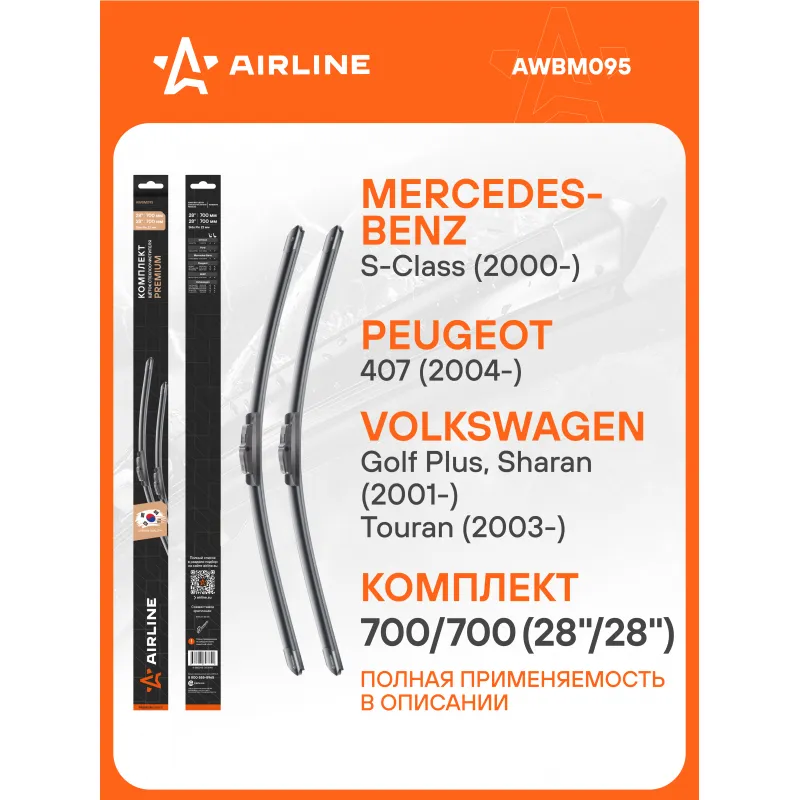 Щетки стеклоочистителя комплект 700/700мм (28"/28") бескаркасные PREMIUM с креплением "Side Pin 22 мм", 2 штуки Описание: Комплект модельных щеток стеклоочистителя PREMIUM с бескаркасной конструкцией AIRLINE AWBM095 700/700 мм - это результат инновационных разработок, направленных на обеспечение безупречного видения дороги в любых погодных условиях. Они специально разработаны для конкретных моделей авто, что позволяет достичь безупречного прилегания к лобовому стеклу и обеспечить высочайшую эффективность очистки. Использование премиальных материалов гарантирует долгий срок службы щеток, а также их стойкость к различным погодным условиям. Уникальная конструкция щеток AIRLINE обеспечивает тихую и плавную работу, минимизируя шум и неприятные звуки даже при высоких скоростях. Простота установки этих щеток стеклоочистителя делает их идеальным выбором для водителей, которые ценят свое время и удобство. Применяемость: CITROEN C6, FORD GALAXY, MERCEDES-BENZ S-Class, PEUGEOT 407, SEAT ALHAMBRA, VW GOLF PLUS, SHARAN, TOURAN.. Преимущества щетки AIRLINE AWBM095 - Материал щетки - долговечная натуральная резина; - Адаптеры произведены из специального технического пластика, от -40 до +60; - Адаптер - Side pin 17 mm, 22 mm - Боковой штырь 17 мм, 22 мм; - Бесшумная работа бескаркасной щетки стеклоочистителя; - Равномерный прижим щетки к поверхности стекла; Если у вас есть вопросы по применяемости, мы всегда готовы помочь вам с подбором по VIN-НОМЕРУ ВАШЕГО АВТОМОБИЛЯ. С модельными щетками стеклоочистителя AIRLINE каждая поездка будет проходить с максимальным комфортом и безопасностью, независимо от погоды за окном. Мы гарантируем качество и надежность наших товаров. Характеристики: Артикул: AWBM095 OEM номера: 1124510, 1850110, 2208200645, 2208200845, 2208201145, 2208201345, 2208201545, 2208201745, 6426SZ, 6426SY, JZW 998 002 AC, 7M3 998 002 A, 161955427, 7M0955425F, 7M3955425C, 7M3955426B, 7M3998002, 5M0955425C, 5M0955426C Размер водительской щетки, мм: 700 Размер пассажирской щетки, мм: 700 Адаптер крепления: Side pin 17 mm, 22 mm - Боковой штырь 17 мм, 22 мм Размер водительской щетки, дюйм: 28 Размер пассажирской щетки, дюйм: 28 Тип: Бескаркасная Комплектация: Щетка стеклоочистителя - 2 шт Картонная коробка - 1 шт Адаптеры - 2 шт Пластиковая подложка - 1 шт Гарантия: от 1 года.