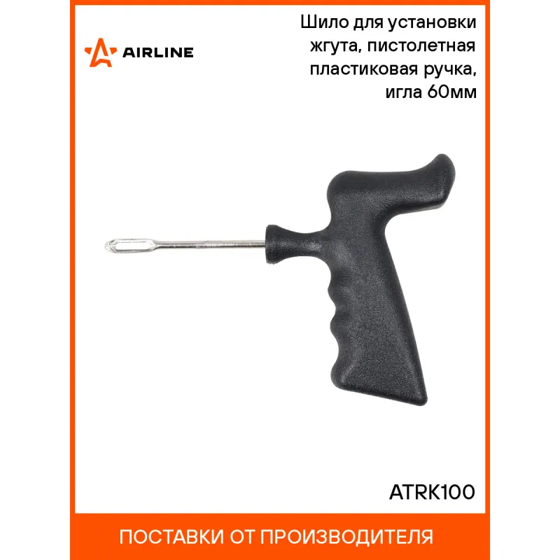 Шило для установки жгута, пистолетная пластиковая ручка, игла 60мм Описание: Инструмент для установки и фиксации жгутов при ремонте бескамерных колёс. Характеристики: Артикул: ATRK100 Длина, мм: 170 Длина жала, мм: 60 Комплектация: Шило для установки жгута, пистолетная пласт.ручка - 1 шт Гарантия: от 1 года.