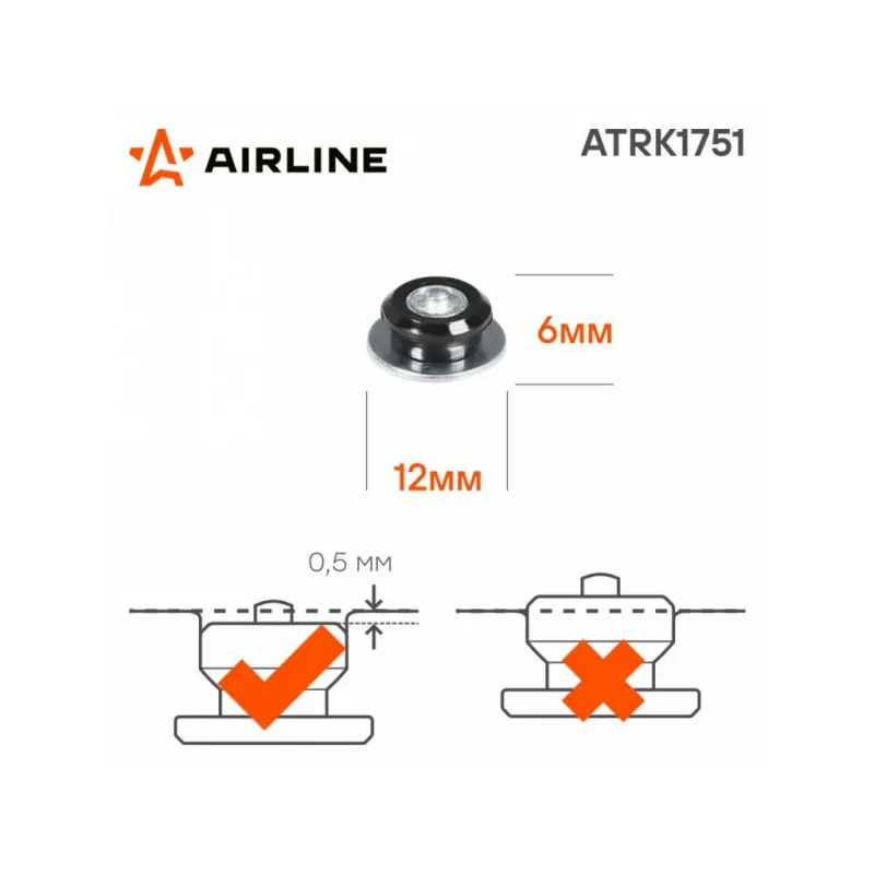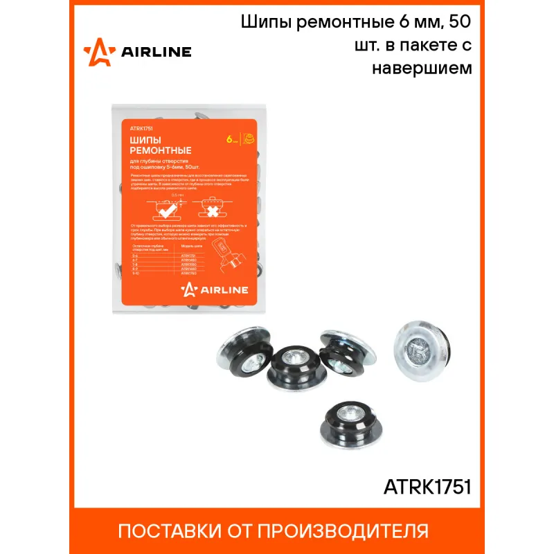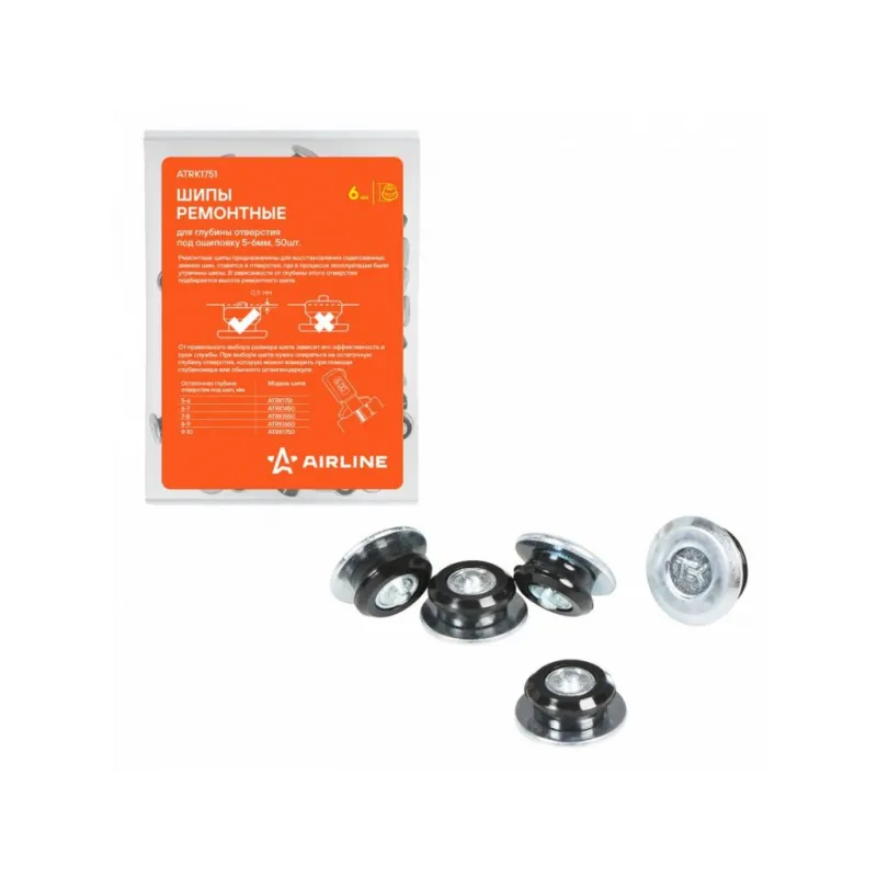 Шипы ремонтные 6 мм, 50 шт. в пакете с навершием Описание: Ремонтные шипы предназначены для восстановления шипованных зимних шин. Ставятся в отверстия, где в процессе эксплуатации были утрачены шипы. В зависимости от глубины этго отверстия подбирается высота шипа. Шипы используются для глубины отверстия 5-6 мм. Специальная форма шипа, увеличенный диаметр фланца (12мм), материал втулки - обеспечивает его надежное удержание в протекторе зимней шины. Характеристики: Артикул: ATRK1751 Диаметр фланца, мм: 12 Высота шипа общая, мм: 6,4 Материал твердосплавной втулки: карбид вольфрама Вес шипа, гр: 2 Диаметр твердосплавной втулки, мм: 2,3 Комплектация: Шипы - 50 шт Гарантия: от 1 года.