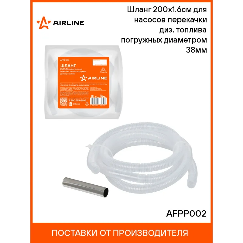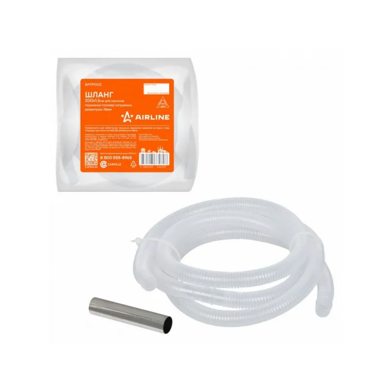 Шланг 200х1.6см для насосов перекачки диз. топлива погружных диаметром 38мм Описание: Применяется для облегчения процесса переливания жидкости из тары в тару. Подходит для насосов AIRLINE диаметром 38мм. Характеристики: Артикул: AFPP002 Материал: ПНД Резьбовое соединение: - Длина, см: 200 Рабочее давление, атм: 5 Максимальное давление, Атм: 7.5 Комплектация: Шланг 200х1.6см со стальным носиком - 1 шт Гарантия: от 1 года.